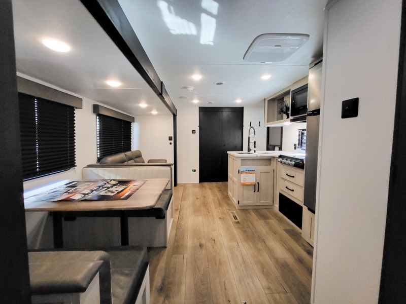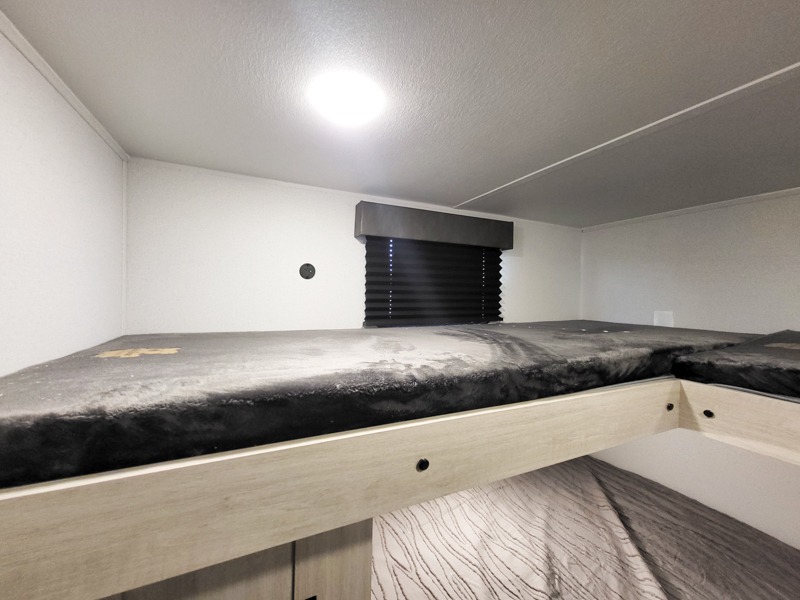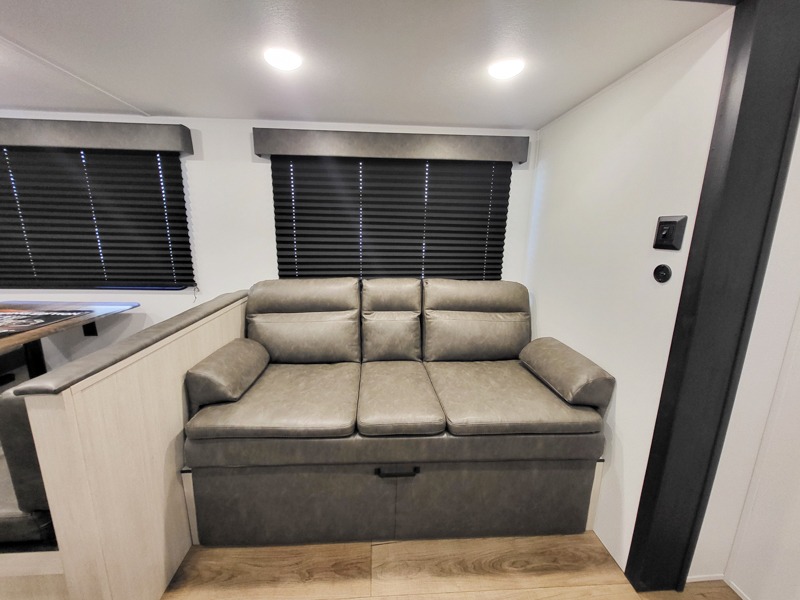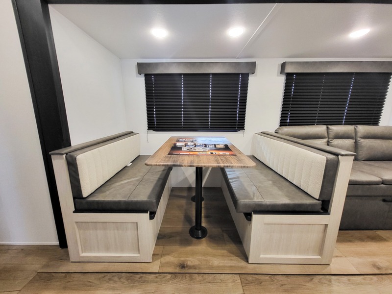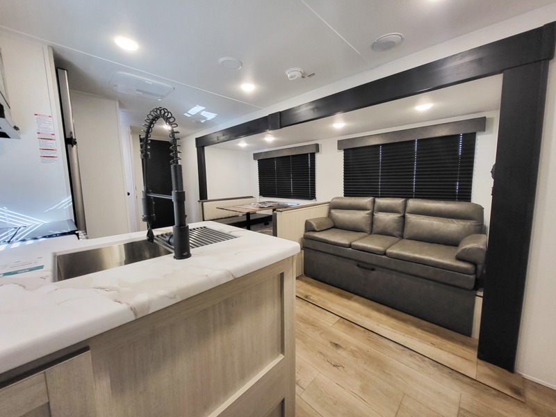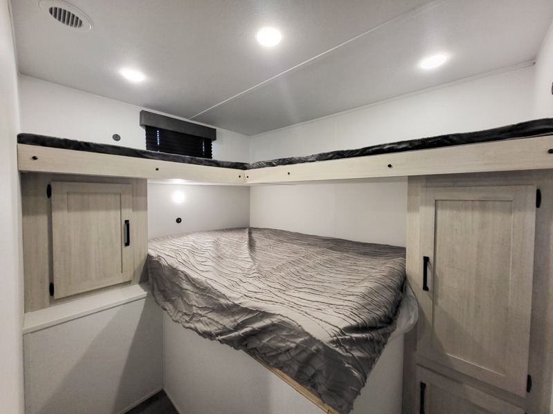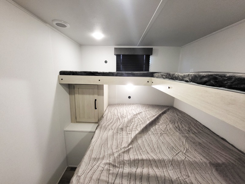 If you're looking for more space, this double axle unit features a large slide so you can walk about freely. Here, you'll find the booth dinette and sofa, which sit across from the optional TV if you want to enjoy movie nights. The full kitchen includes a stainless microwave and three burner cooktop to make meals, plus a pantry and 12V refrigerator for food storage. And an optional outside mini kitchen with a grill can be added if you enjoy cooking outdoors! Your guests or littles are sure to enjoy the rear bedroom with a queen bed, a 28" x 65" bunk, 28" x 76" bunk, a shirt closet, and a wardrobe so everything has a place!