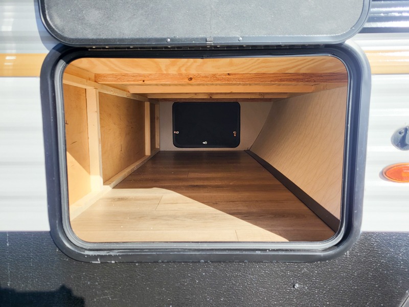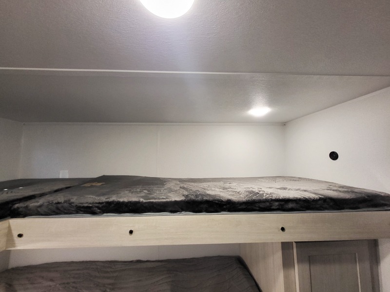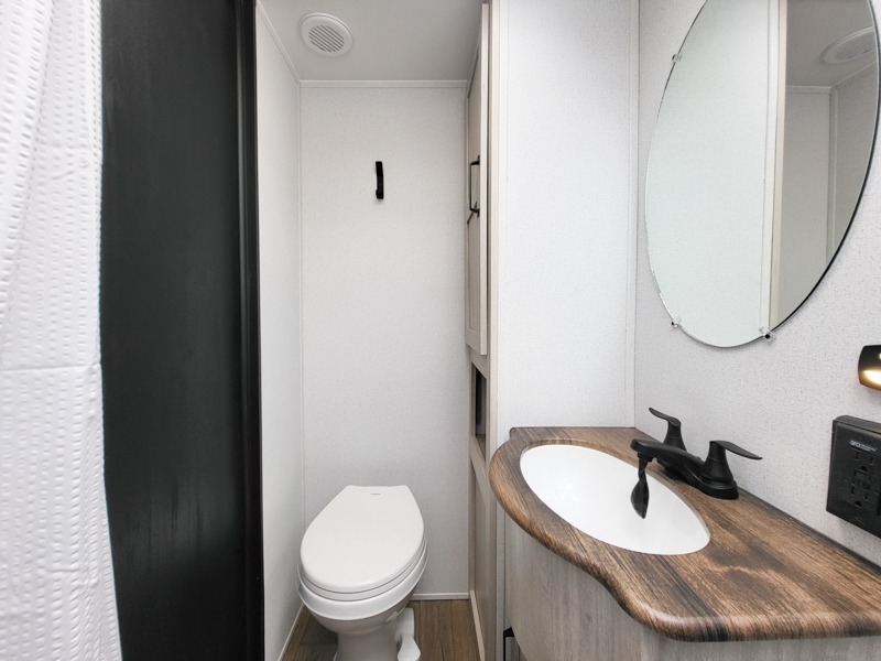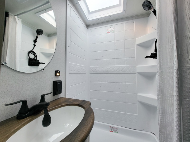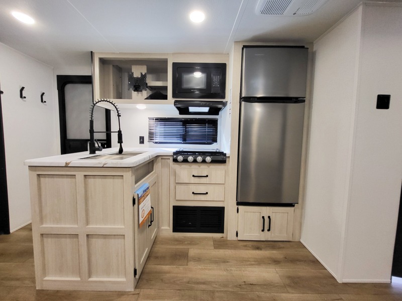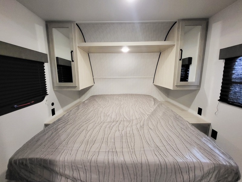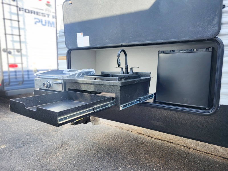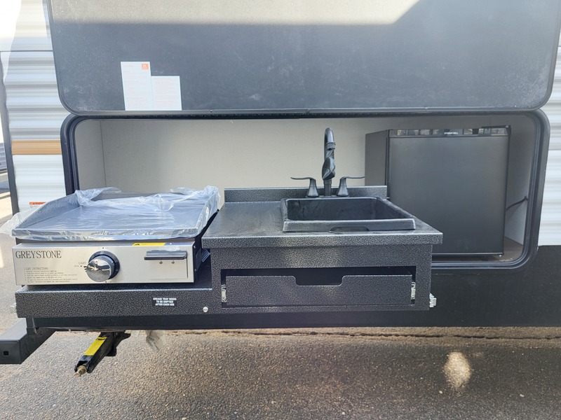 If you're looking for more space, this double axle unit features a large slide so you can walk about freely. Here, you'll find the booth dinette and sofa, which sit across from the optional TV if you want to enjoy movie nights. The full kitchen includes a stainless microwave and three burner cooktop to make meals, plus a pantry and 12V refrigerator for food storage. And an optional outside mini kitchen with a grill can be added if you enjoy cooking outdoors! Your guests or littles are sure to enjoy the rear bedroom with a queen bed, a 28" x 65" bunk, 28" x 76" bunk, a shirt closet, and a wardrobe so everything has a place!