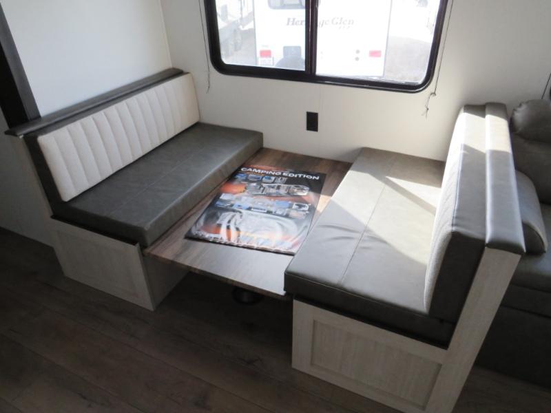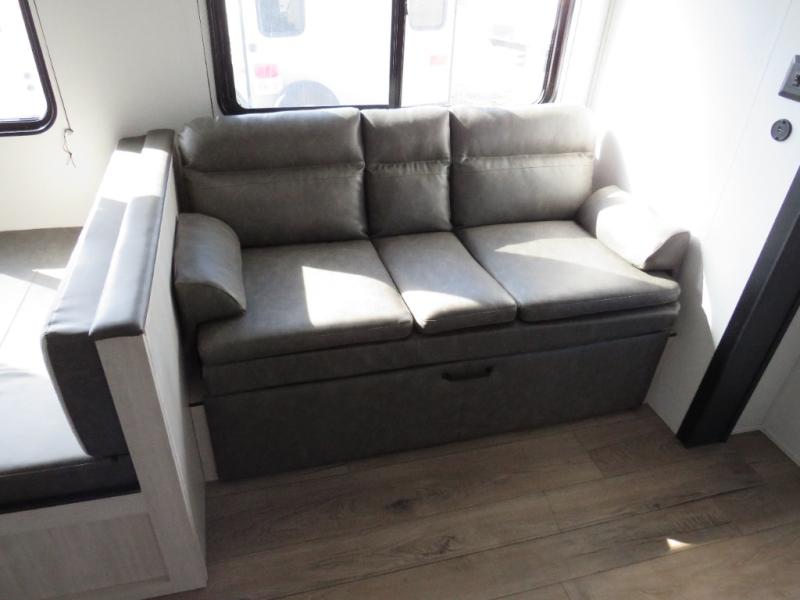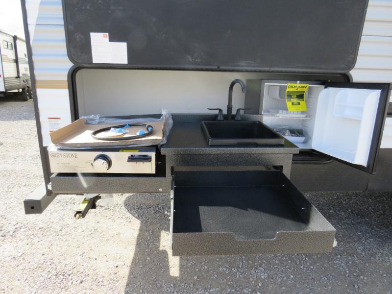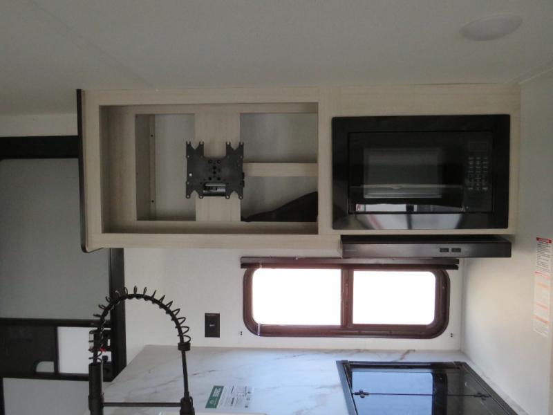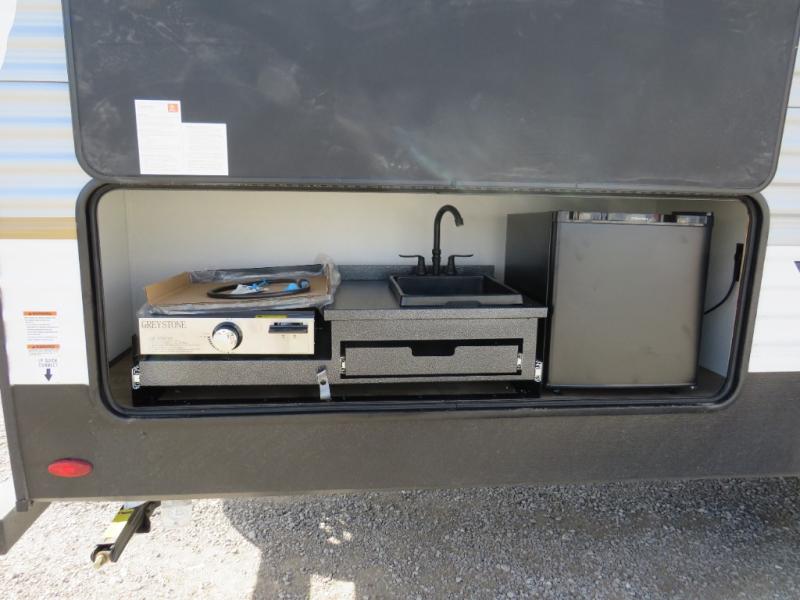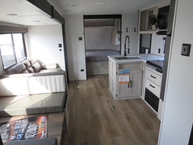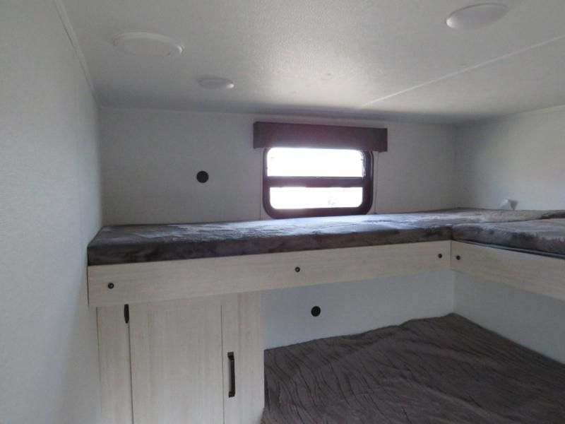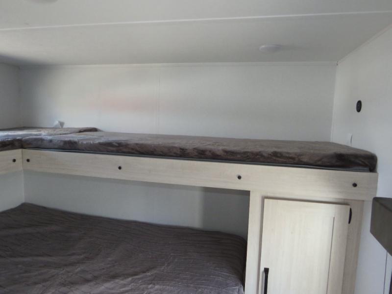 If you're looking for more space, this double axle unit features a large slide so you can walk about freely. Here, you'll find the booth dinette and sofa, which sit across from the optional TV if you want to enjoy movie nights. The full kitchen includes a stainless microwave and three burner cooktop to make meals, plus a pantry and 12V refrigerator for food storage. And an optional outside mini kitchen with a grill can be added if you enjoy cooking outdoors! Your guests or littles are sure to enjoy the rear bedroom with a queen bed, a 28" x 65" bunk, 28" x 76" bunk, a shirt closet, and a wardrobe so everything has a place!