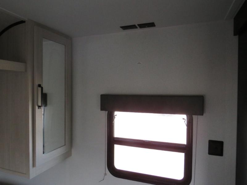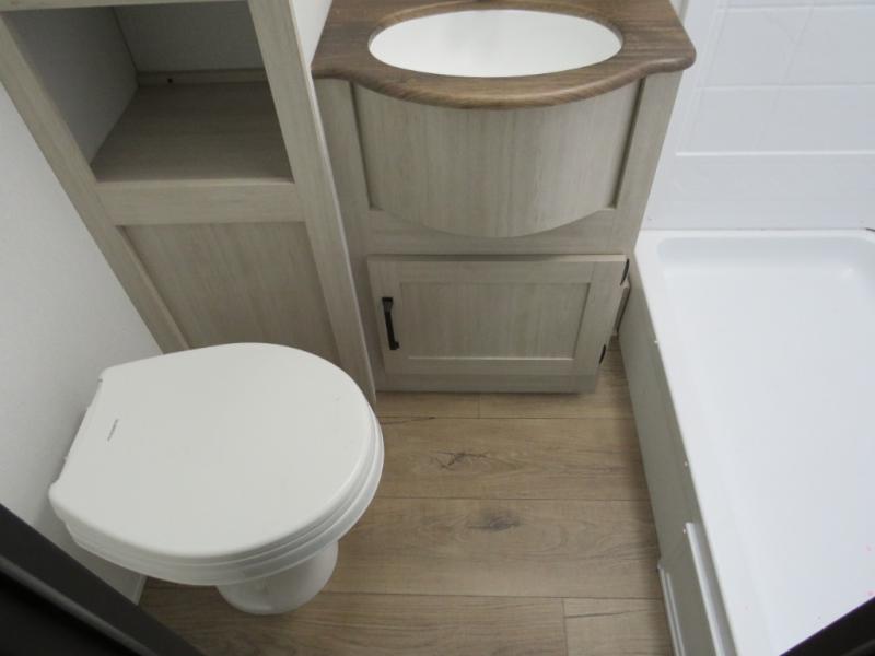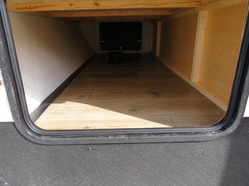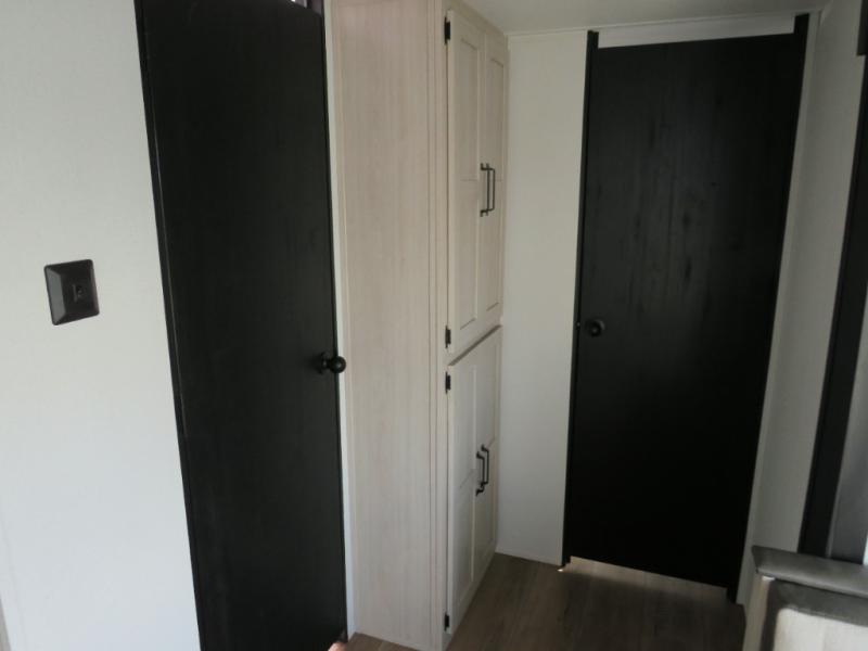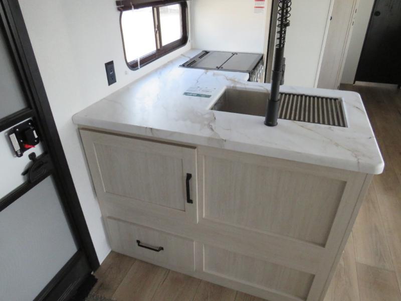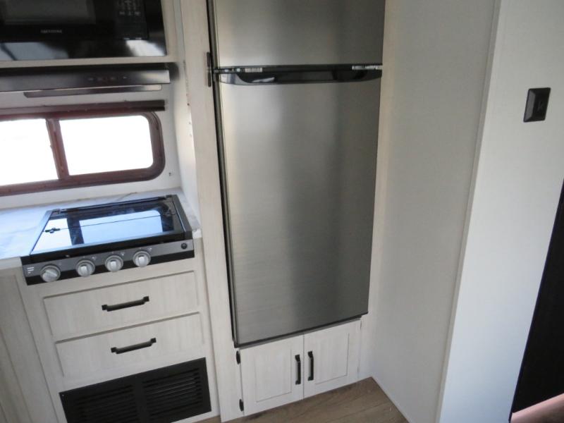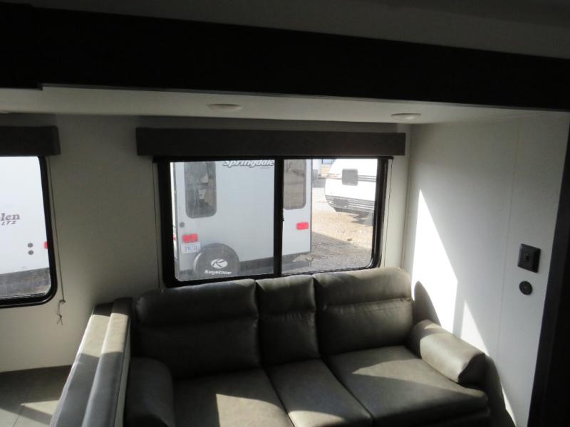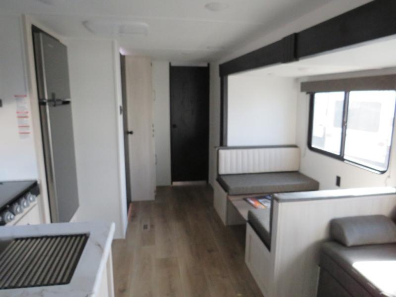 If you're looking for more space, this double axle unit features a large slide so you can walk about freely. Here, you'll find the booth dinette and sofa, which sit across from the optional TV if you want to enjoy movie nights. The full kitchen includes a stainless microwave and three burner cooktop to make meals, plus a pantry and 12V refrigerator for food storage. And an optional outside mini kitchen with a grill can be added if you enjoy cooking outdoors! Your guests or littles are sure to enjoy the rear bedroom with a queen bed, a 28" x 65" bunk, 28" x 76" bunk, a shirt closet, and a wardrobe so everything has a place!
