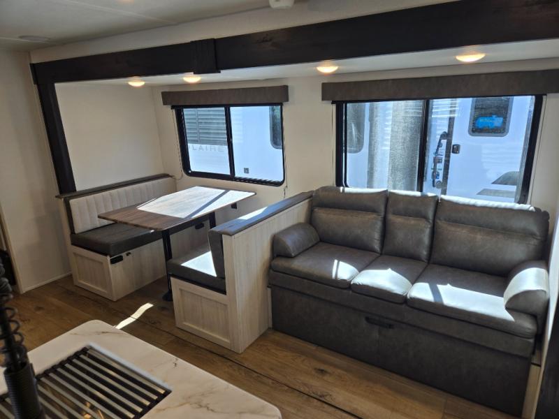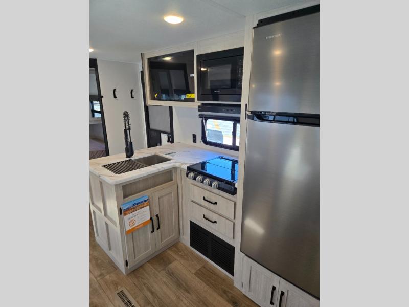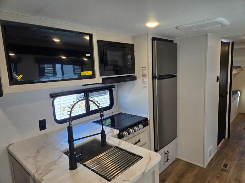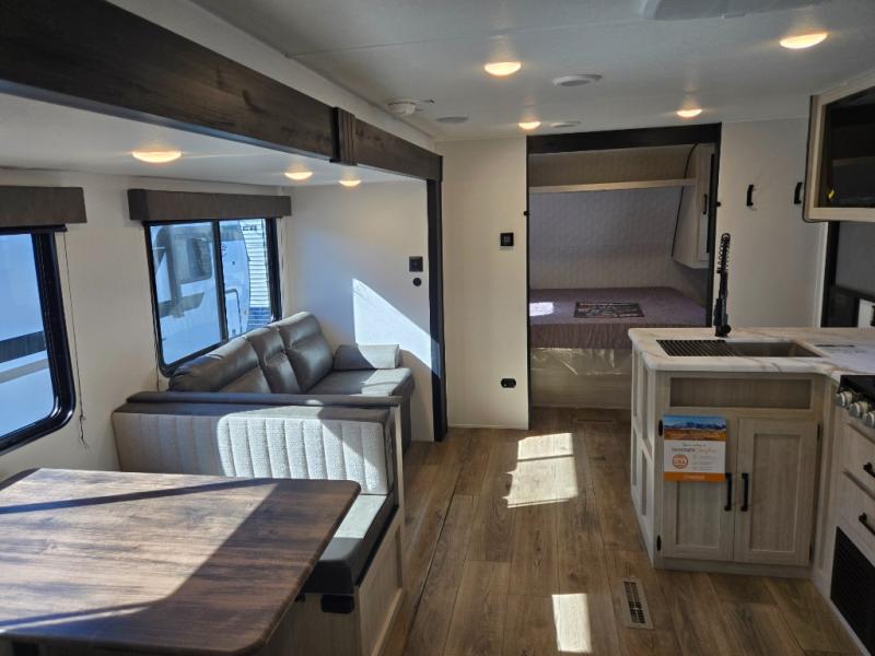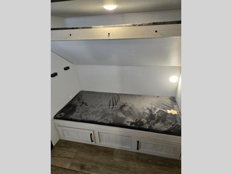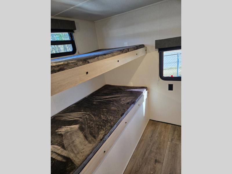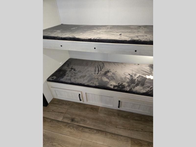 If you're looking for more space, this double axle, double slide out unit is perfect for your group of eight. Within the large slide in the living room, you'll find the booth dinette and sofa, which sit across from the optional TV if you want to enjoy movie nights. The full kitchen includes a microwave and three burner cooktop to make meals, plus a pantry and 12V refrigerator for food storage. And an optional outside mini kitchen with a grill can be added if you enjoy cooking outdoors! Your guests or littles are sure to enjoy the rear private bunkhouse that features a set of 38" x 76" bunks across from the third bunk and jiffy sofa within a slide out!