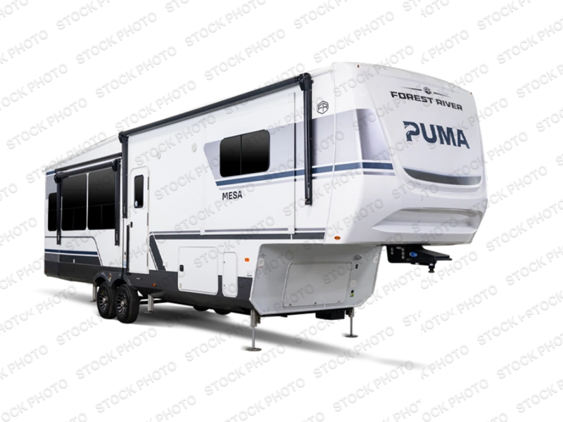 With the Puma Mesa fifth wheel by Forest River redefine your camping experience with a perfect blend of practical living, durable construction, and high-end style! These models are built on a rock-solid foundation featuring an all-welded aluminum frame superstructure and high gloss fiberglass vacuum bonded walls with Dual Azdel for long-lasting quality. The expansive 101" wide-body design maximizes interior space, and the worry-free composite slide floors provide excellent stability. Outside, the Puma Mesa ensures effortless travel and setup with a standard 6-point hydraulic leveling system and reliable 7,000 lb. axles with ABS and a Tire Pressure Monitoring System (TPMS). These fifth wheels also include practical features like a heated utility convenience center, 12V heat pads on all holding tanks for extended season use, and convenient slam latches on all storage doors. You will also love the outdoor living space created by the power awnings with LED lights and the accessibility provided by the standard ladder!