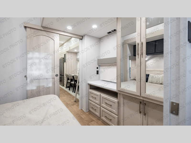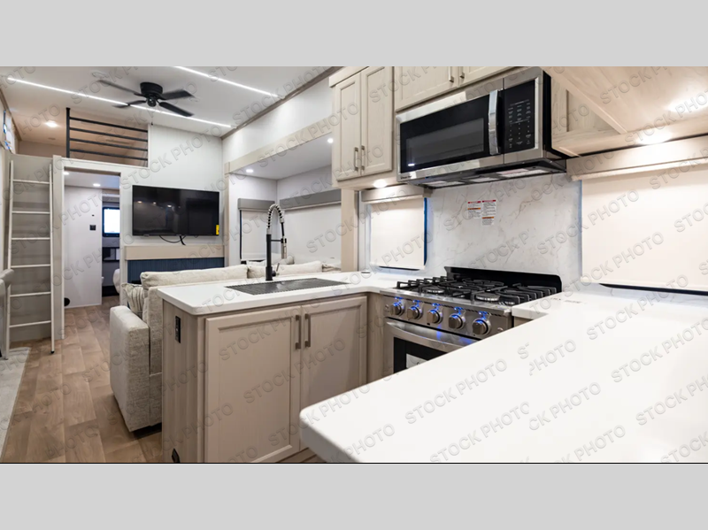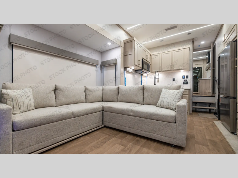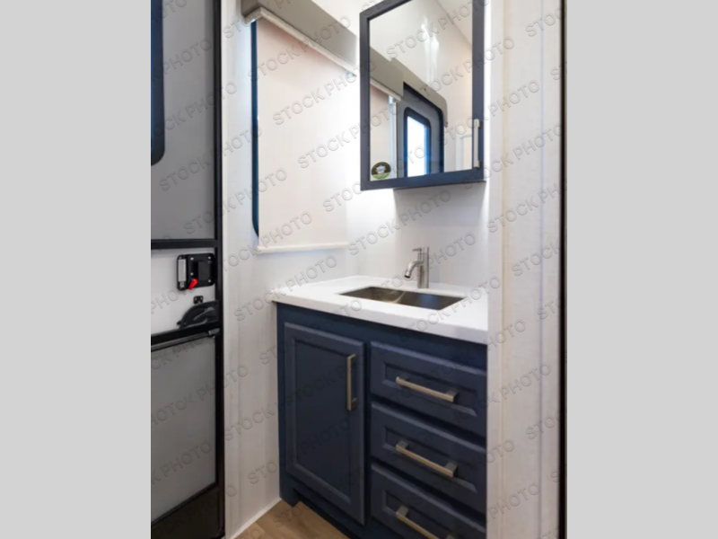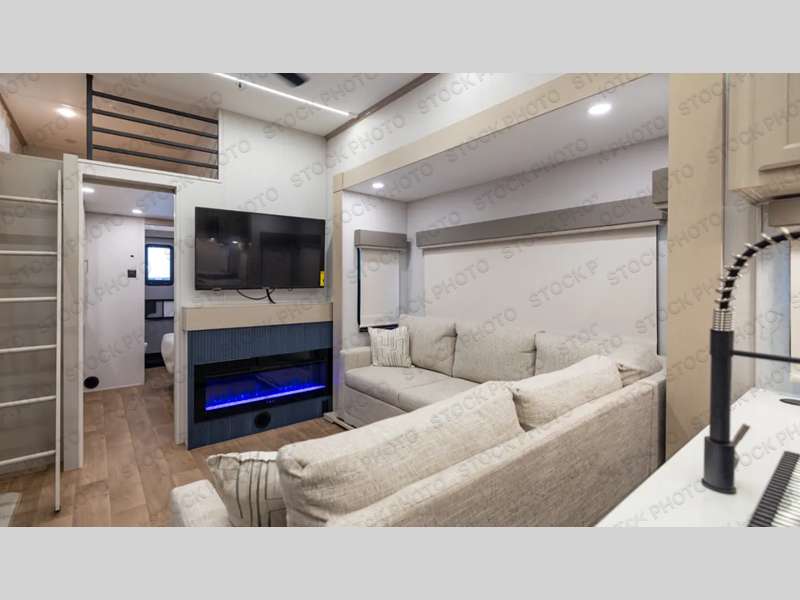 This is a truly spacious fifth wheel, complete with four slide outs and a functional two-bedroom, two bath layout, is sure to meet every need for your extended adventures! Your crew can relax in the expansive rear living area on the comfortable L-shaped sofa across from the 50" Smart TV with Bluetooth audio and the warmth of the electric fireplace. Enjoy meals at the convenient pull-out dinette table with chairs, and appreciate the residential kitchen package which includes a 12V stainless steel refrigerator and a large range. The front private bedroom offers a quiet retreat with a Queen bed on aluminum-framed base, a bedroom Smart TV, a large wardrobe with mirrored sliding closet doors, and washer/dryer prep. For maximum convenience, you also have a second bath located in the rear, perfect for quick access from outside via the second entry door! Head outdoors to enjoy the two power awnings with LED lighting.