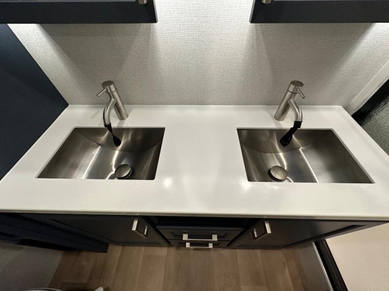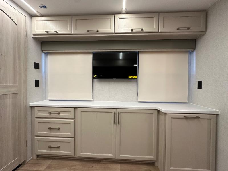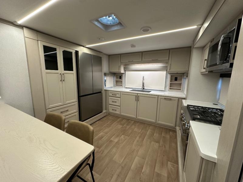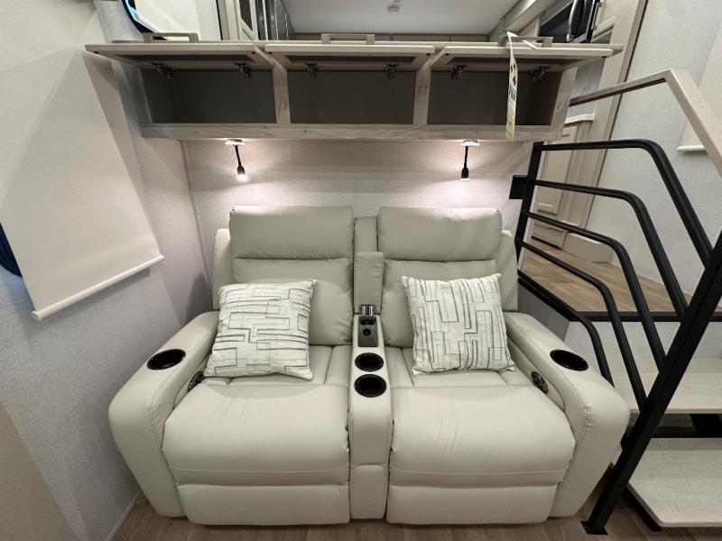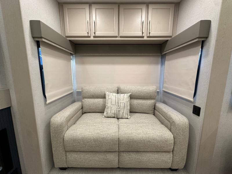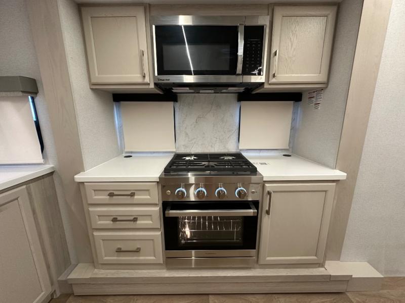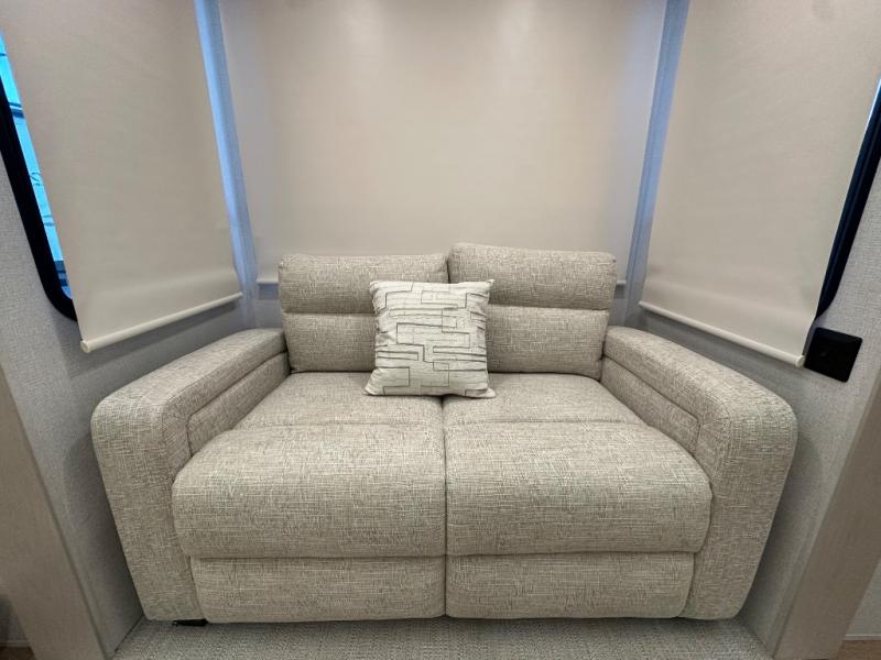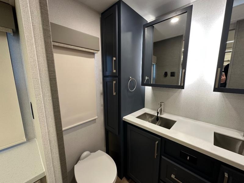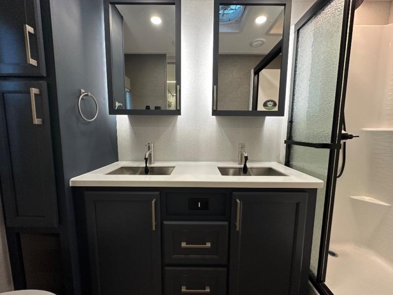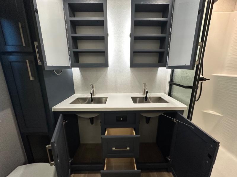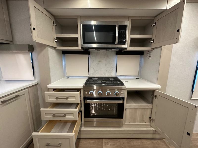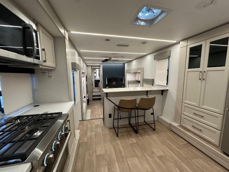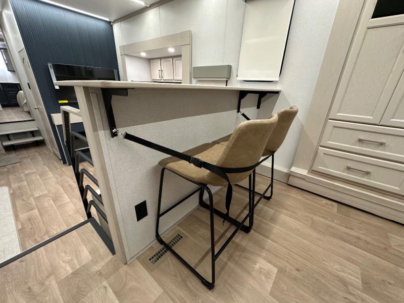 The front kitchen in this fifth wheel is a chef's dream come true while camping! There is generous counter space up front and beside the range, plus a pantry and 12V refrigerator with an ice maker. There is also a hi-top table with two bar stools that overlooks the living area. Inside the living area there are opposing sofa sleeper slides and power theater seating across from an entertainment center with a 50" Smart TV. A mid-coach half bath is easily accessible, and the full rear bath with dual bath sinks will create a master bedroom you are sure to love. There is a king bed slide out, a wardrobe, hamper, and a TV/storage.
