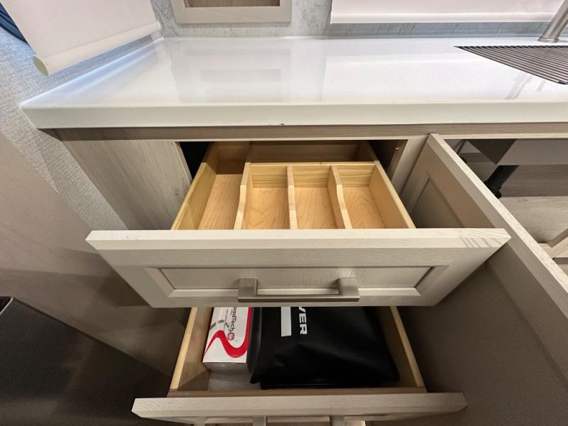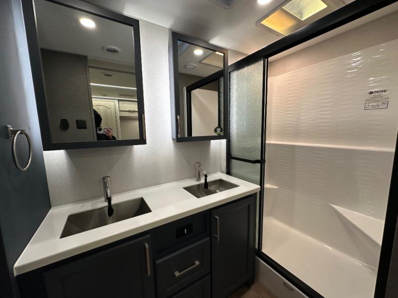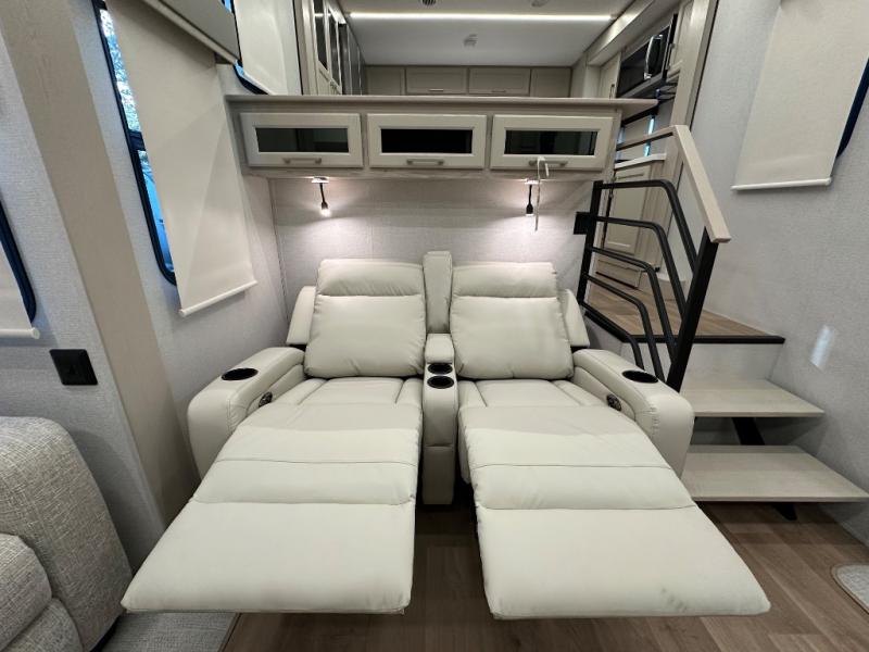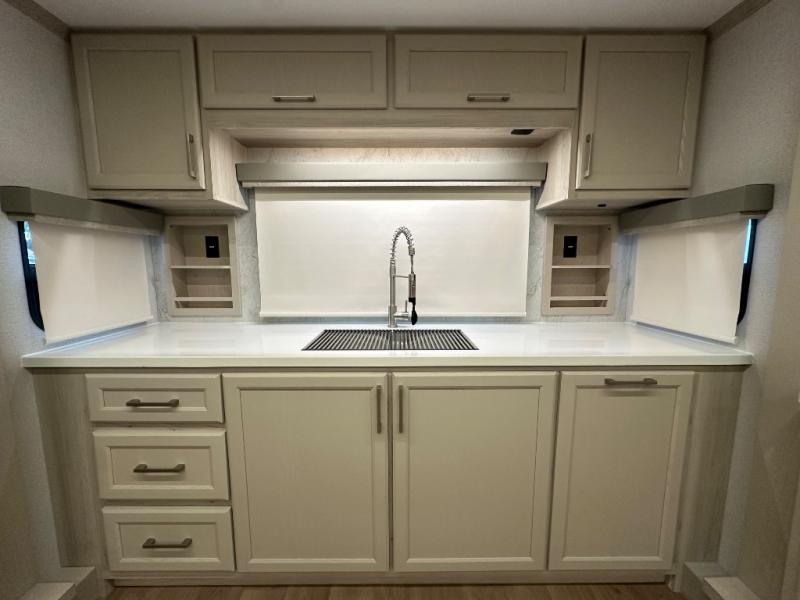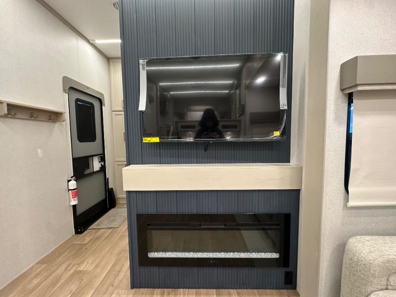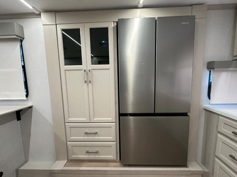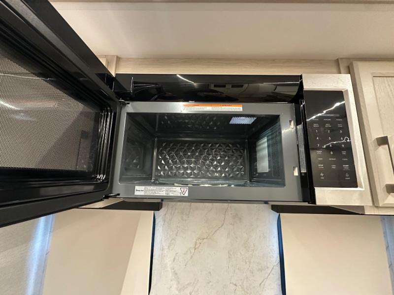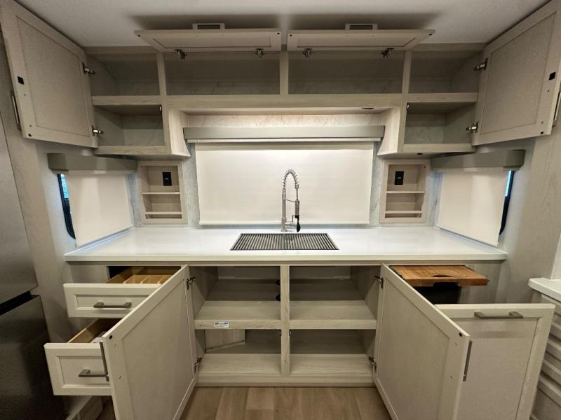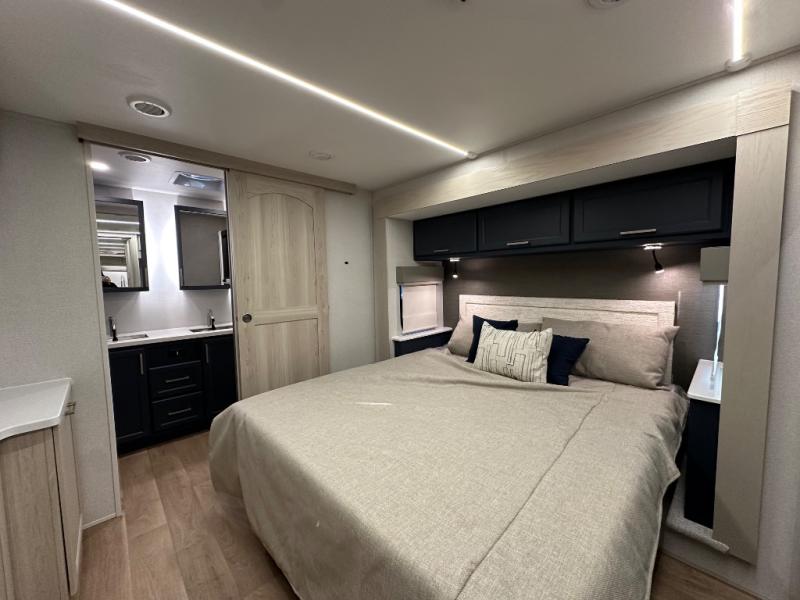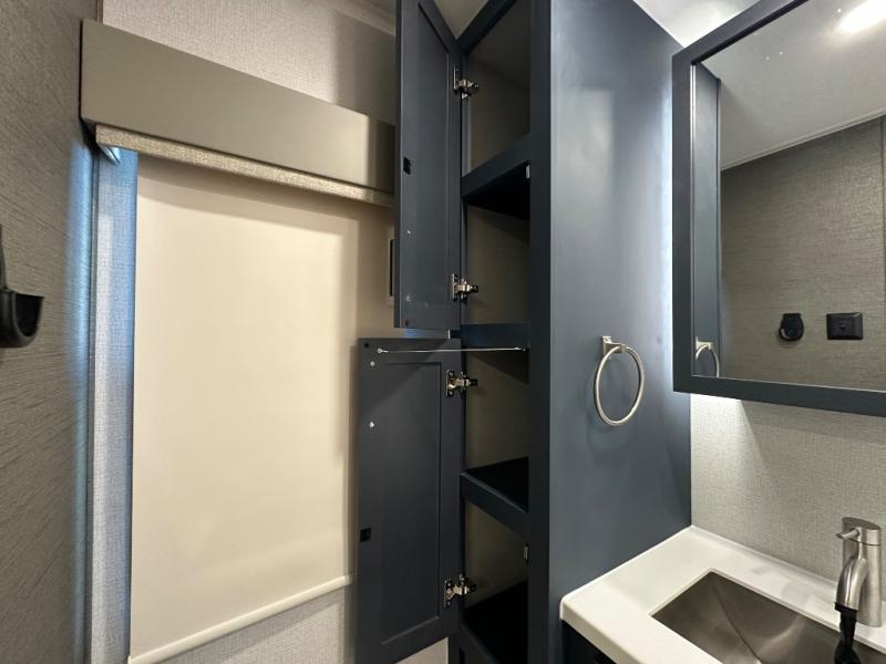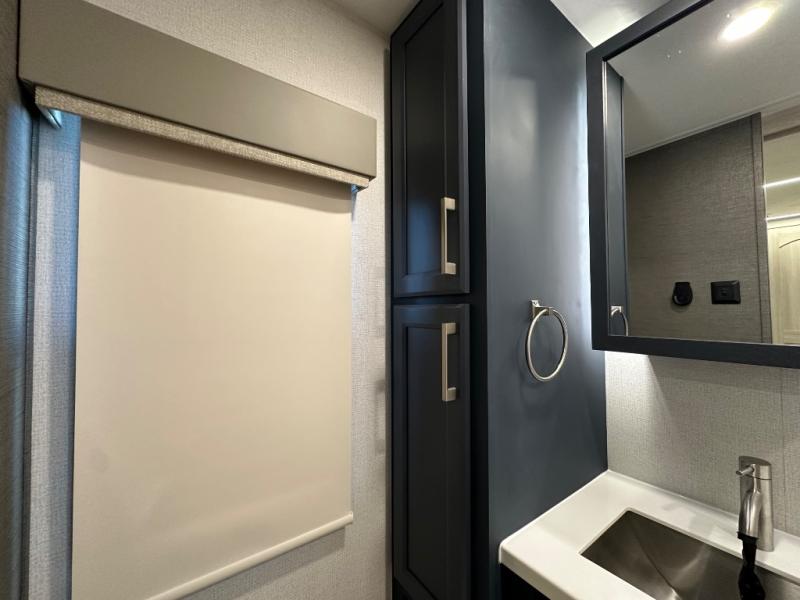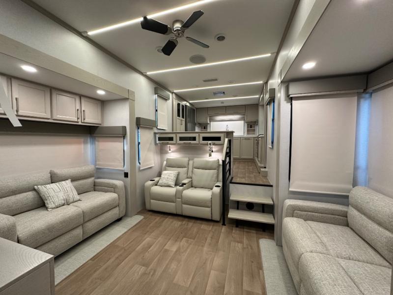 The front kitchen in this fifth wheel is a chef's dream come true while camping! There is generous counter space up front and beside the range, plus a pantry and 12V refrigerator with an ice maker. There is also a hi-top table with two bar stools that overlooks the living area. Inside the living area there are opposing sofa sleeper slides and power theater seating across from an entertainment center with a 50" Smart TV. A mid-coach half bath is easily accessible, and the full rear bath with dual bath sinks will create a master bedroom you are sure to love. There is a king bed slide out, a wardrobe, hamper, and a TV/storage.