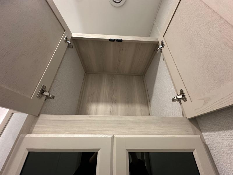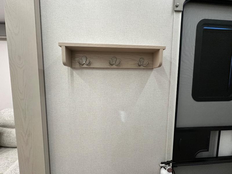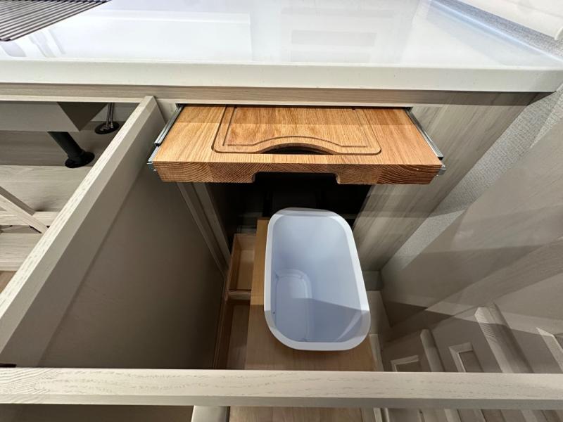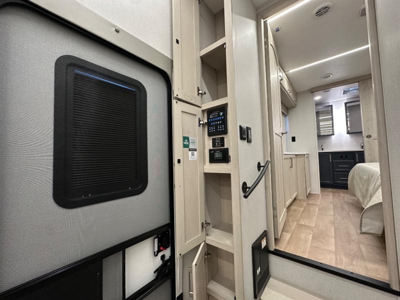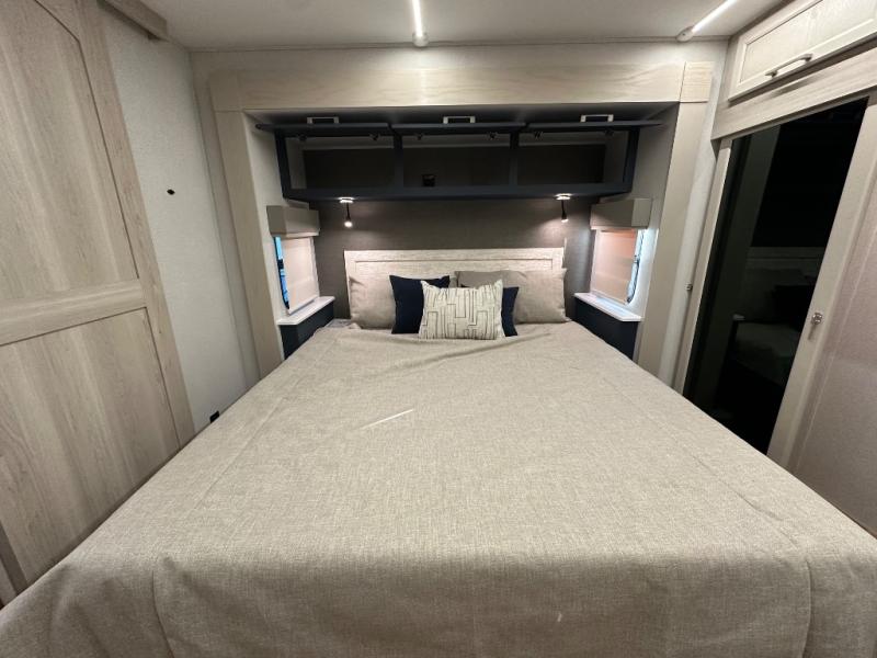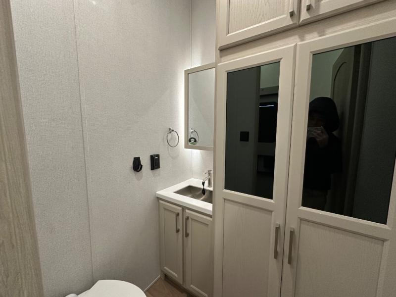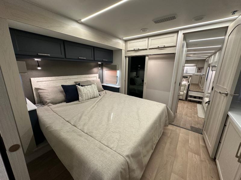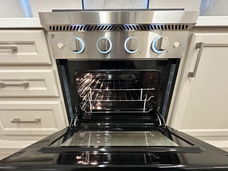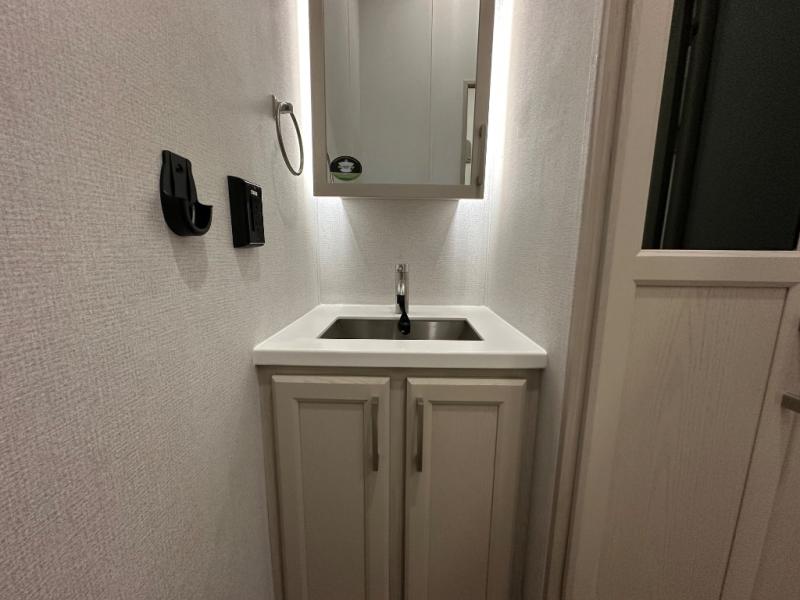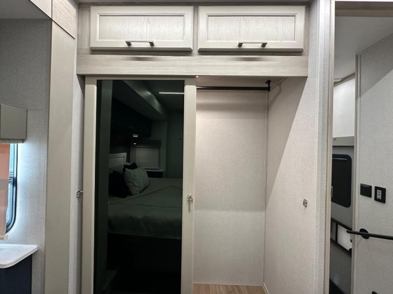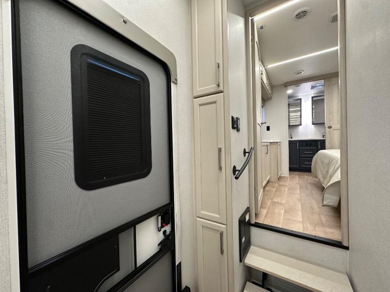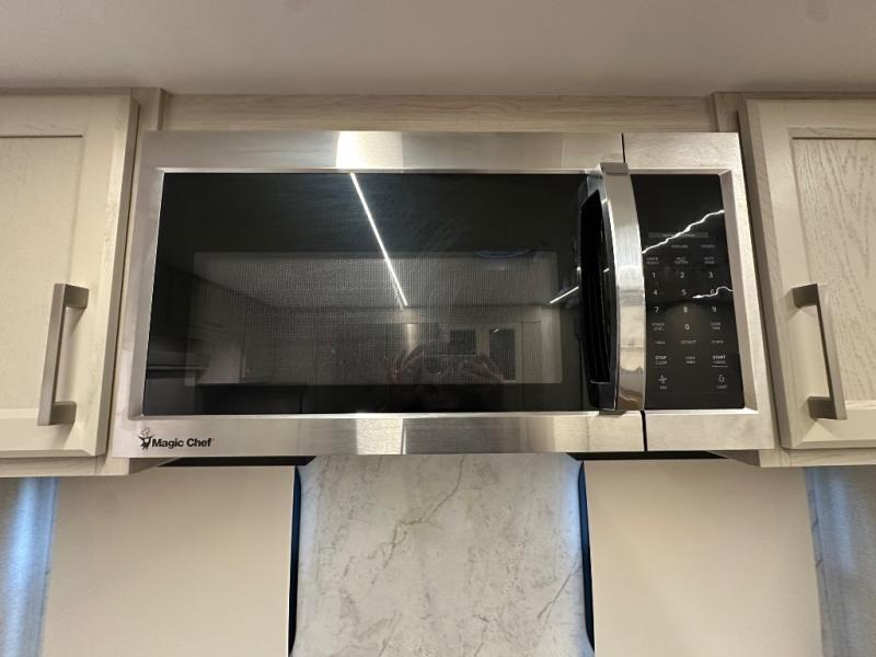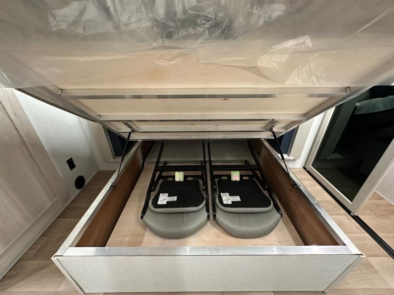 The front kitchen in this fifth wheel is a chef's dream come true while camping! There is generous counter space up front and beside the range, plus a pantry and 12V refrigerator with an ice maker. There is also a hi-top table with two bar stools that overlooks the living area. Inside the living area there are opposing sofa sleeper slides and power theater seating across from an entertainment center with a 50" Smart TV. A mid-coach half bath is easily accessible, and the full rear bath with dual bath sinks will create a master bedroom you are sure to love. There is a king bed slide out, a wardrobe, hamper, and a TV/storage.