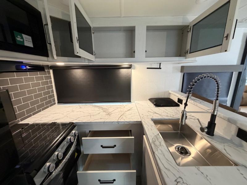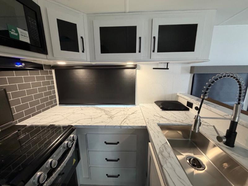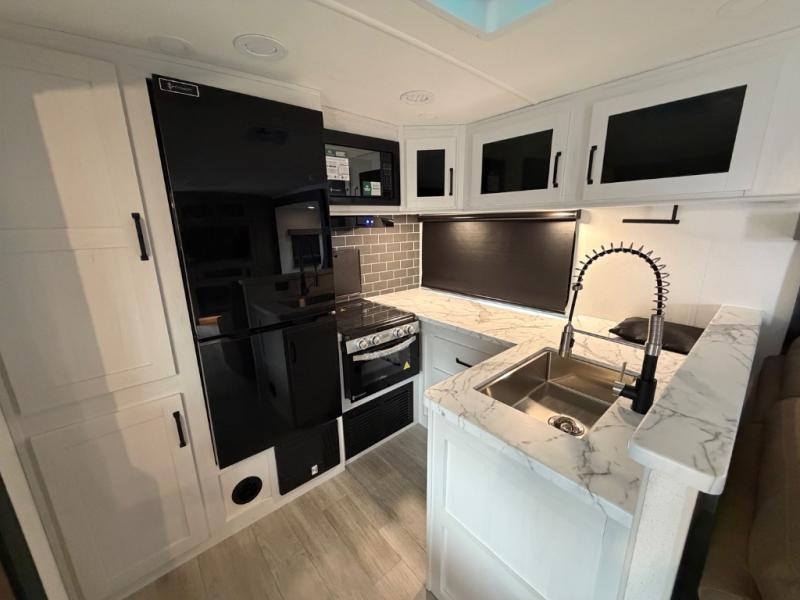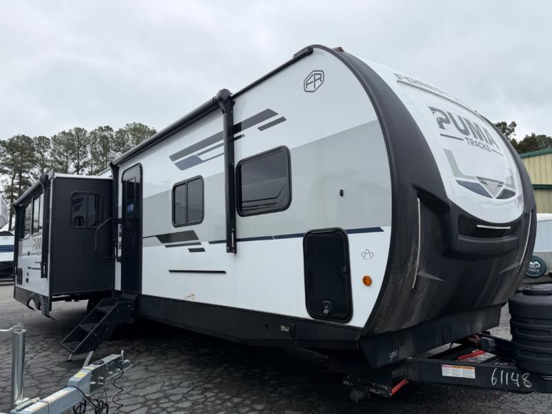 Each Puma Tracks travel trailer by Forest River is constructed with a fully enclosed/heated underbelly for added protection against the elements, plus a fully laminated roof and rear wall for durability. The slam latch baggage doors with magnets will make it easier than ever to pack up your camp gear, and the power awning with LED lights will provide shade during the day and inviting ambiance at night. Head inside to enjoy the roller shades, smoked glass kitchen cabinet doors, stainless-steel sink, and LED lights to keep your space well lit. Some of the available options include a bedroom A/C, a Wi-Fi booster, heated holding tanks, and more!