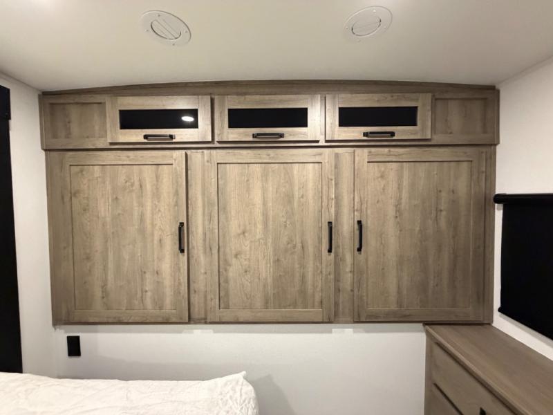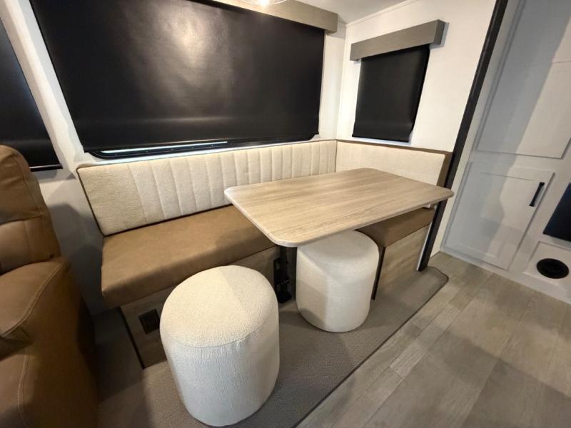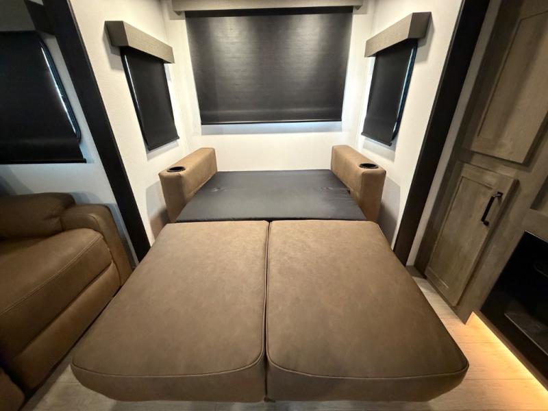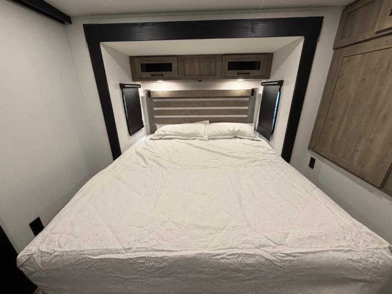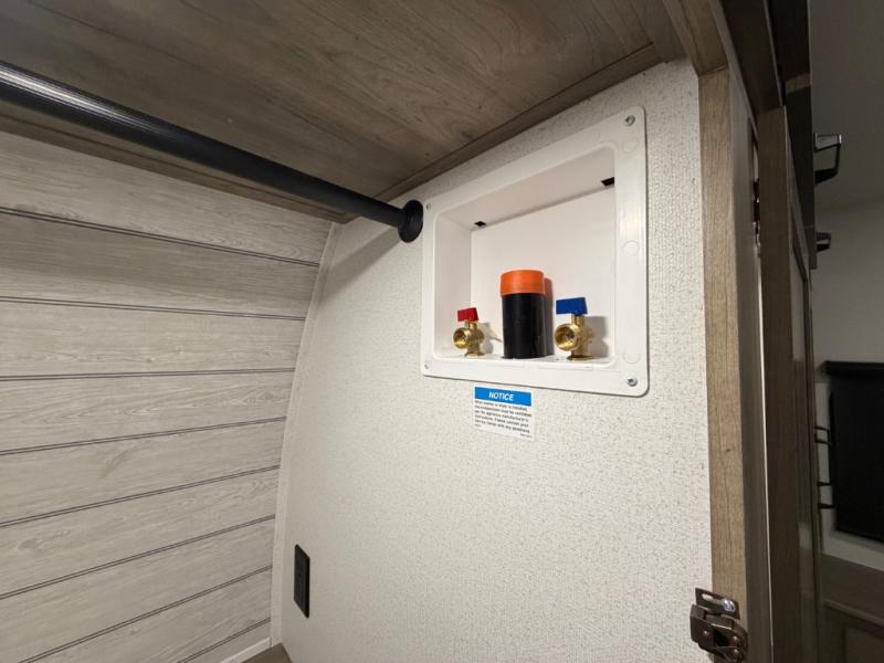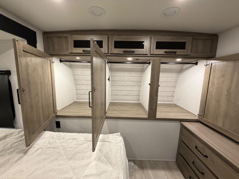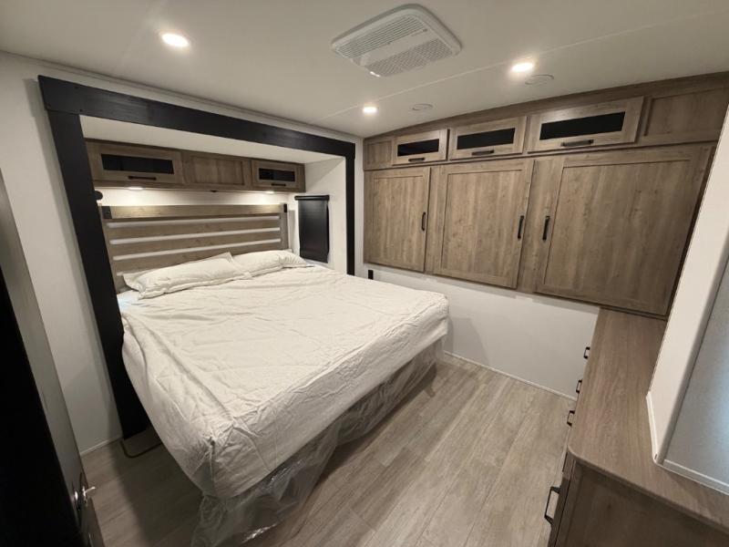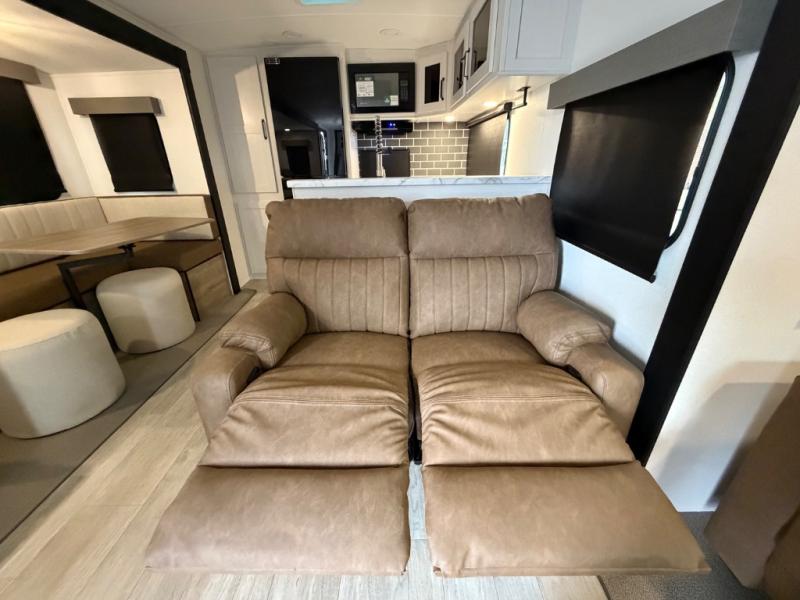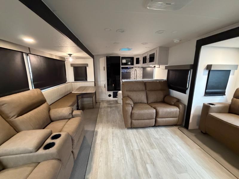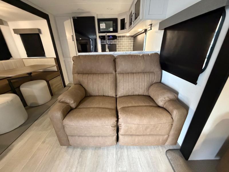 One look at this spacious travel trailer and you'll be sold! The rear kitchen features a U-shaped counter, an 11-cu. ft. refrigerator, plus a pantry for dry goods and snacks. There is a 1/2 dinette with bench seating, plus a tri-fold sofa and two theater seats. Everyone can take turns cleaning up in the full bath that includes a shower with a seat, then head outdoors to relax under the patio awnings with LED lights. When it's time for bed, you will enjoy the king bed slide out in the front bedroom. You'll also find a dresser and a closet here, plus a wardrobe with washer and dryer prep if you choose to add those appliances!