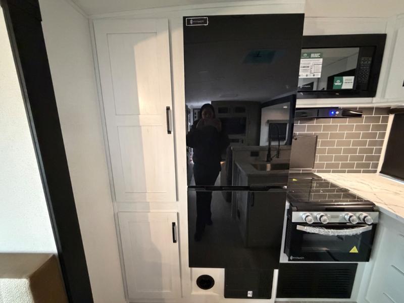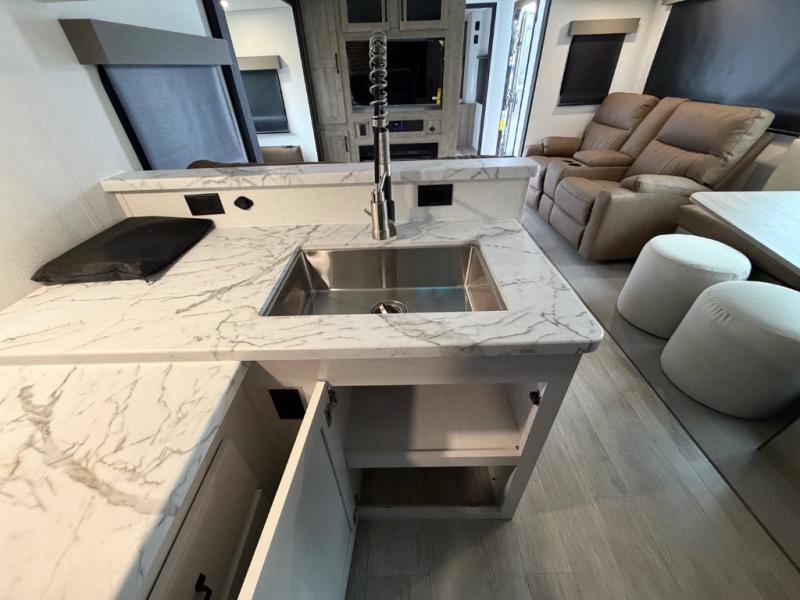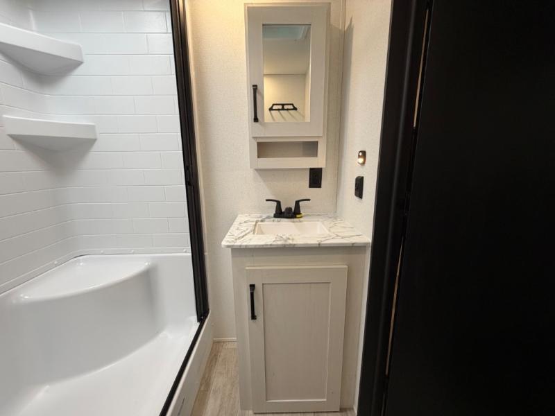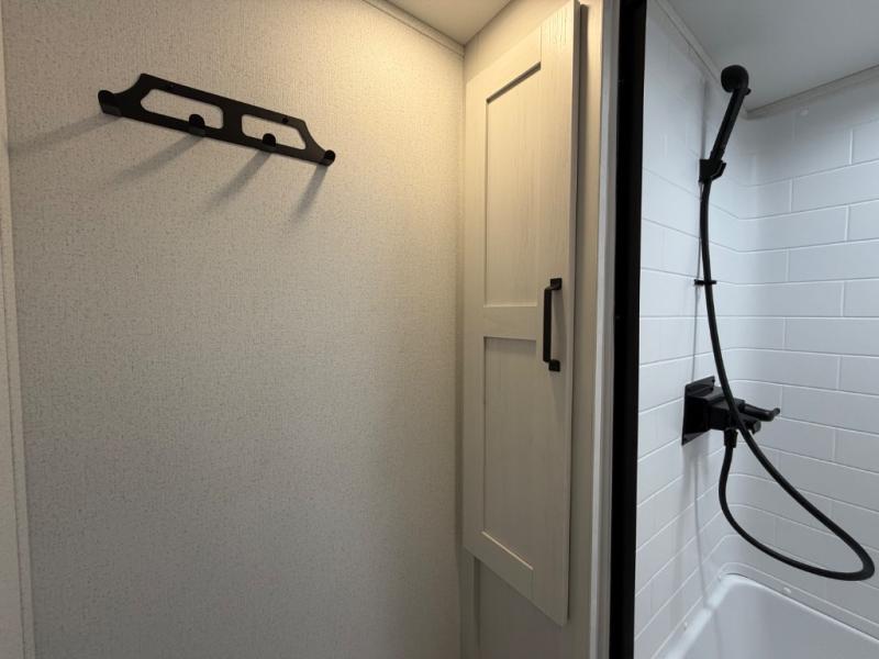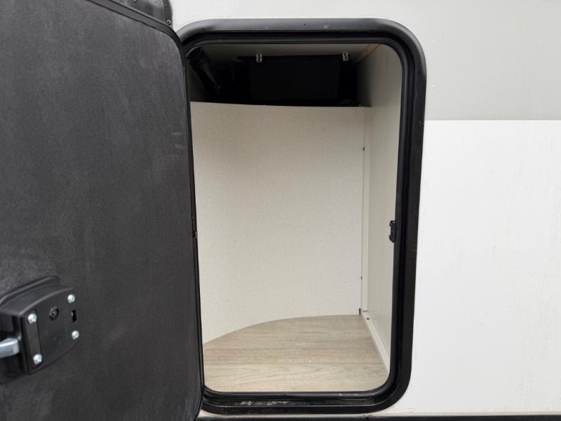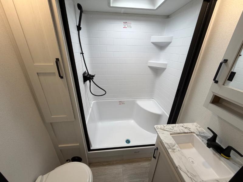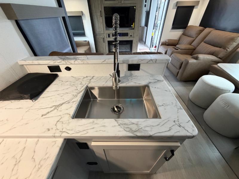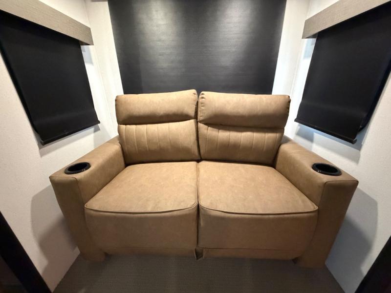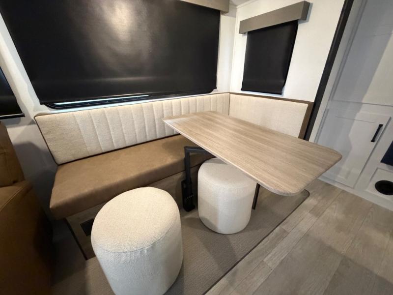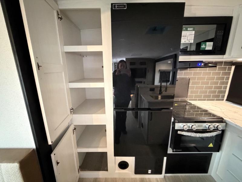 One look at this spacious travel trailer and you'll be sold! The rear kitchen features a U-shaped counter, an 11-cu. ft. refrigerator, plus a pantry for dry goods and snacks. There is a 1/2 dinette with bench seating, plus a tri-fold sofa and two theater seats. Everyone can take turns cleaning up in the full bath that includes a shower with a seat, then head outdoors to relax under the patio awnings with LED lights. When it's time for bed, you will enjoy the king bed slide out in the front bedroom. You'll also find a dresser and a closet here, plus a wardrobe with washer and dryer prep if you choose to add those appliances!