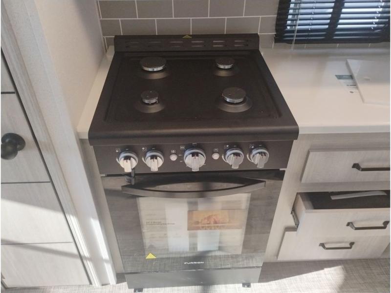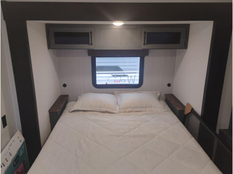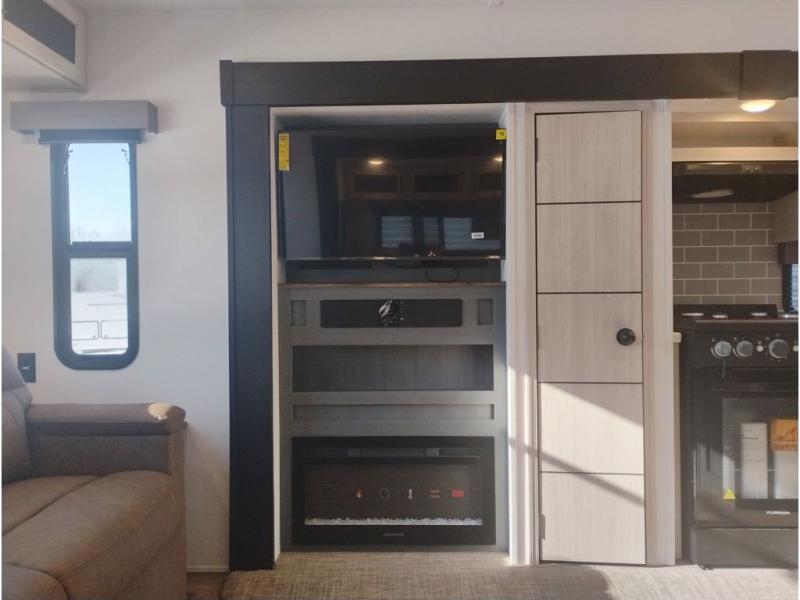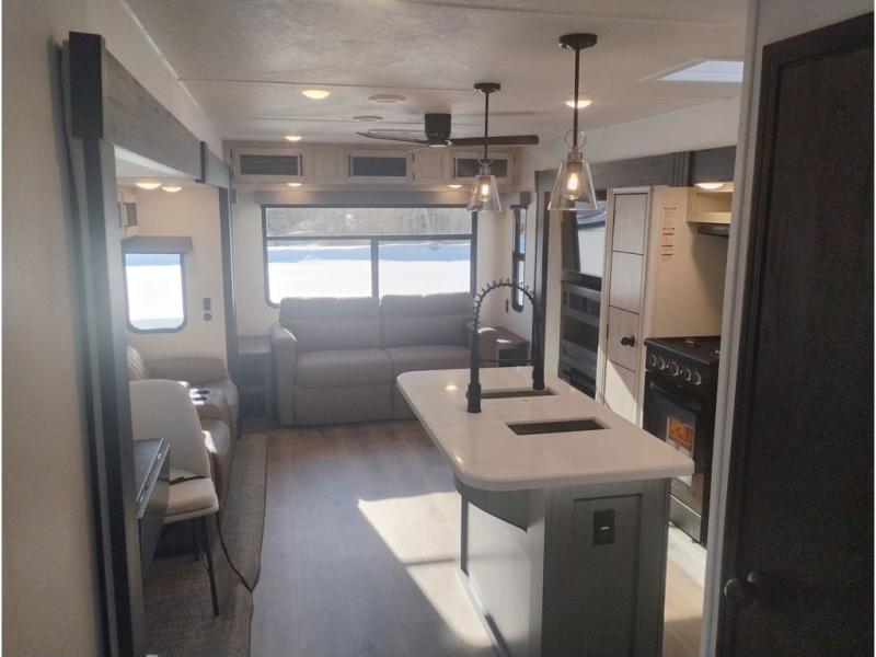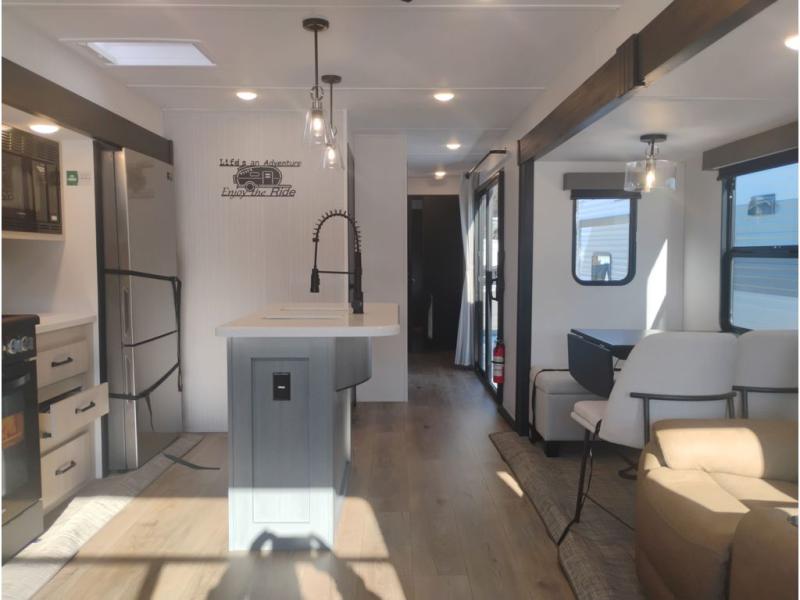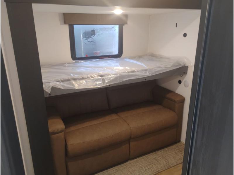 Everyone will want to join you when you head back out to the lake to stay in this trailer! With the middle bunkhouse that includes a bunk above a jiffy sofa and a closet, this can be your kids room or guests headquarters. You will have your own privacy when needed in the front bedroom which includes a queen bed slide and two closets. There is also a dresser and a space within a closet for a washer/dryer prep option. The full bathroom is conveniently located between the two rooms, and the rear of the destination trailer offers a combined living and kitchen area. The dual slides give you lots of floor space around the kitchen island to relax on the booth dinette or sofa, and the cook will have full kitchen amenities including a residential style refrigerator.