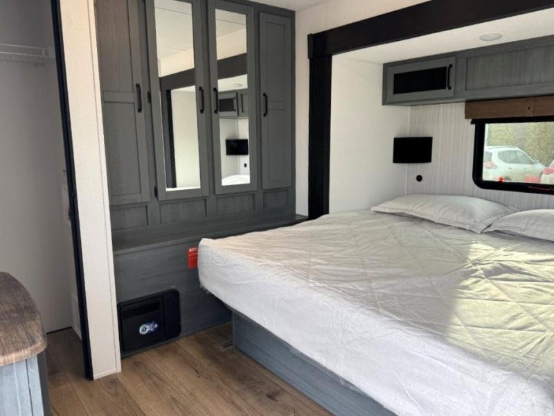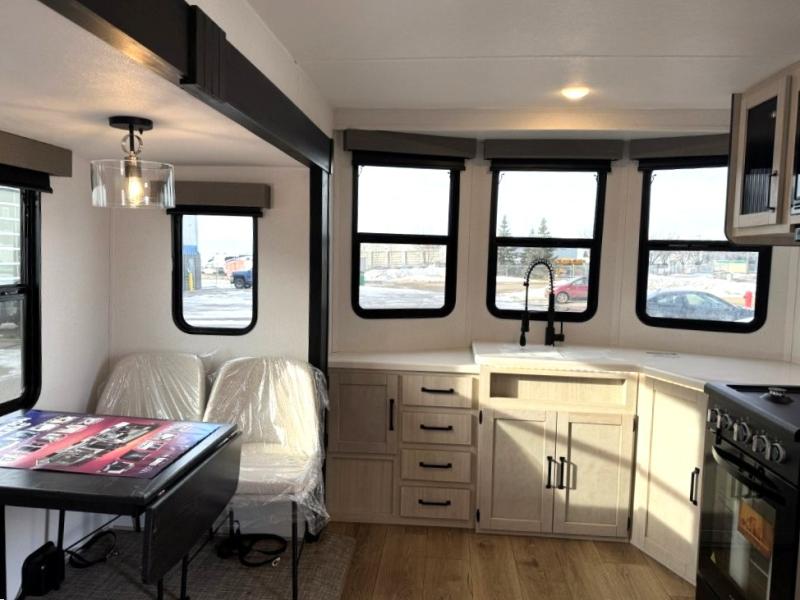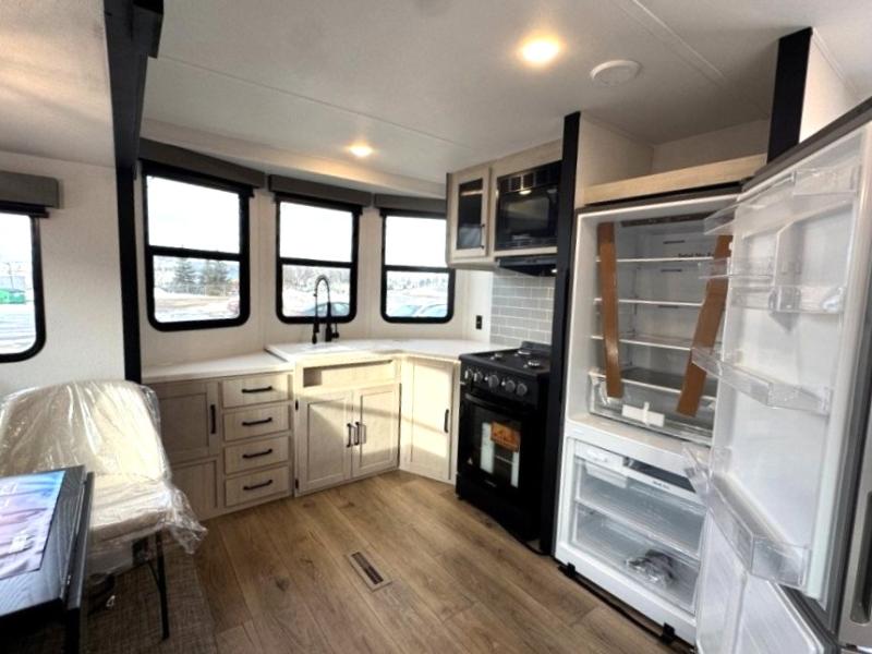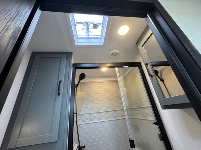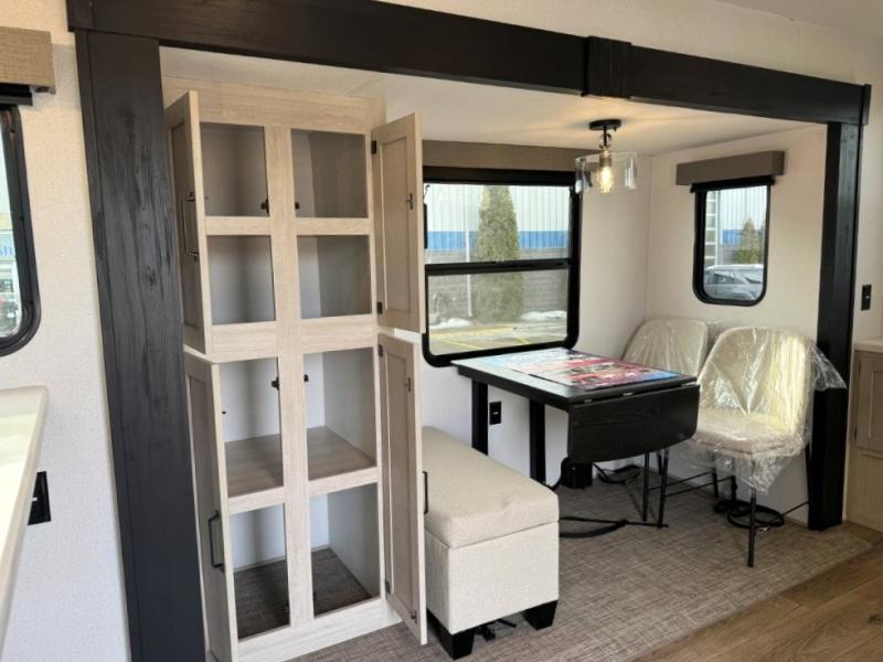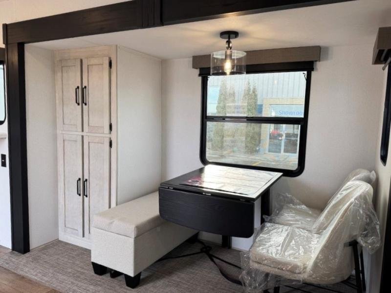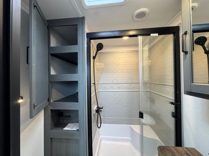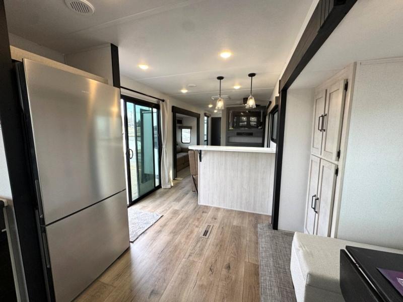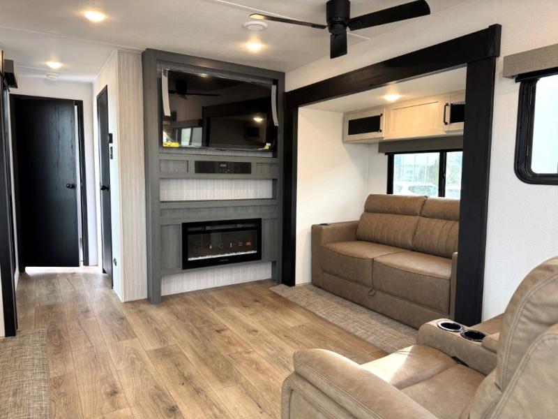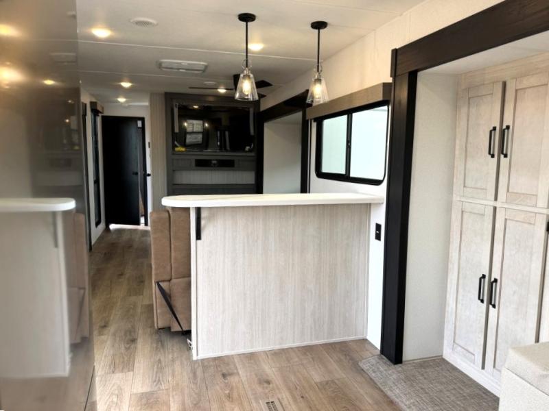 If you are looking for your own space in your next destination trailer, you have found it! With a front separate kitchen, a middle separate living area, a full bathroom and a rear bedroom, you can call one of these spaces your own. The cook will love the front counter space and appliances, and you can dine at the table and chairs or the breakfast nook. Someone can be visiting with friends and family while sitting on the two sofa slides or the theater seating, while another is getting ready in the full bathroom. You will sleep soundly on the king bed slide out, and the closet with washer and dryer prep will make full-time RV living easier than ever.