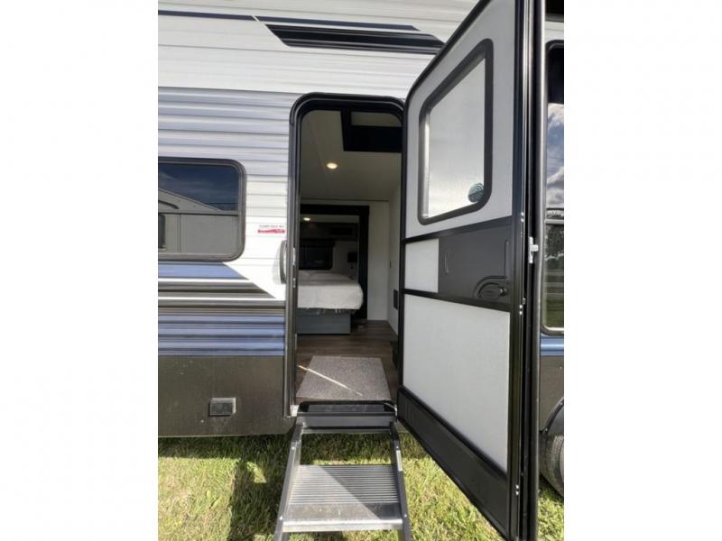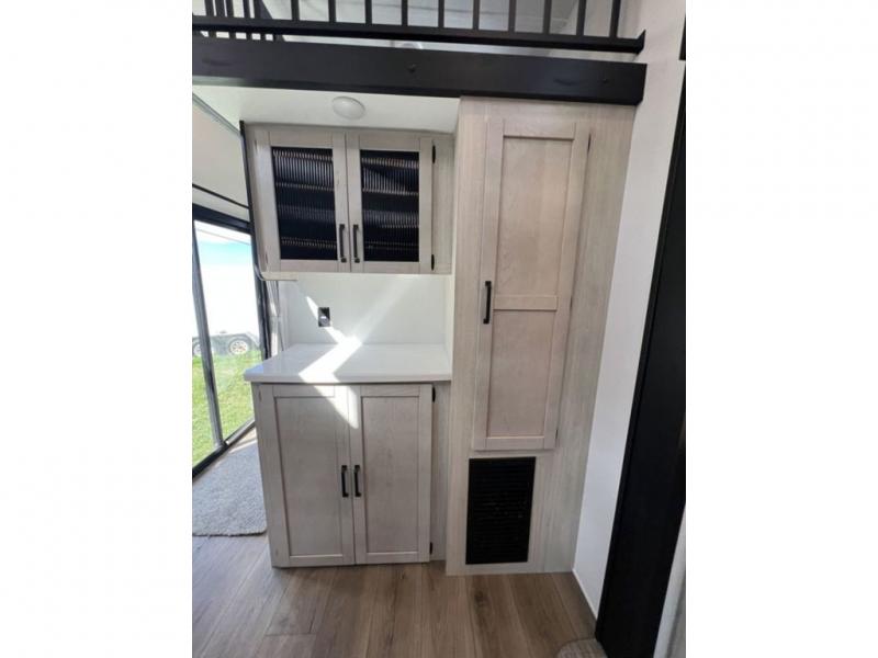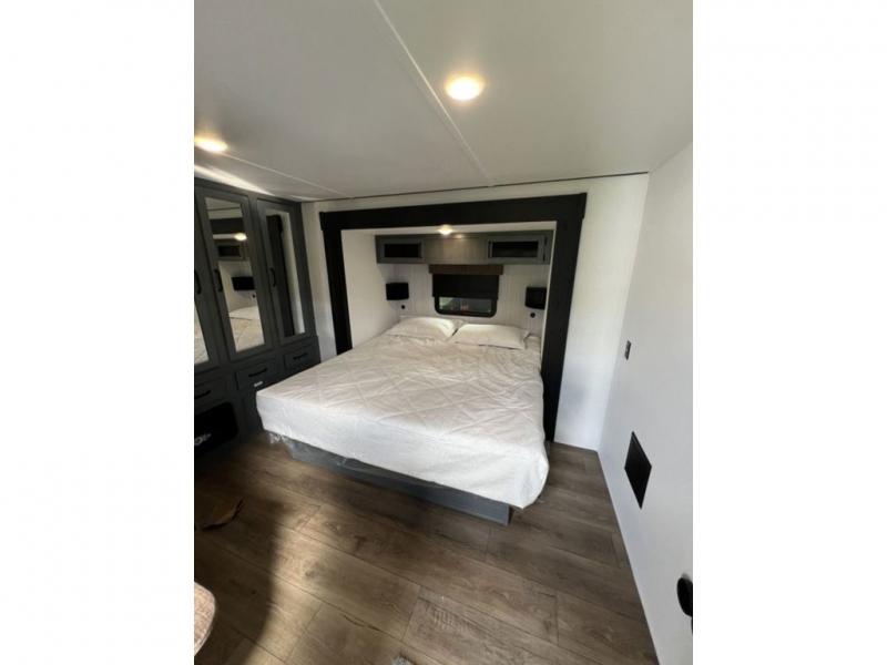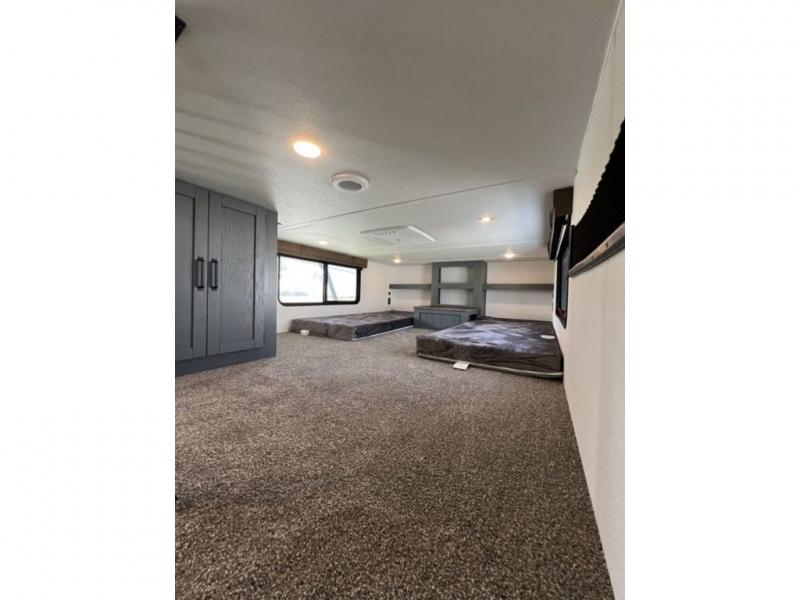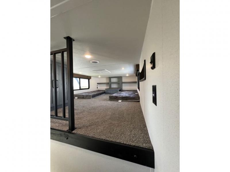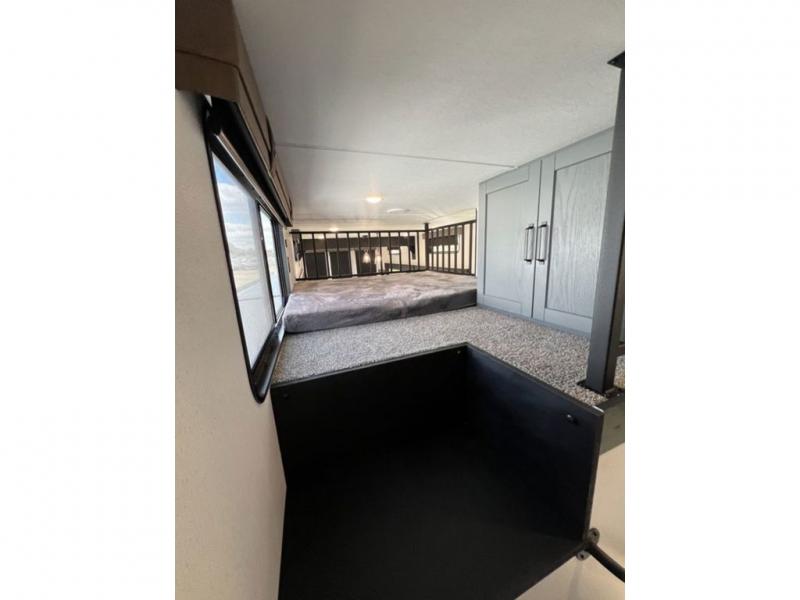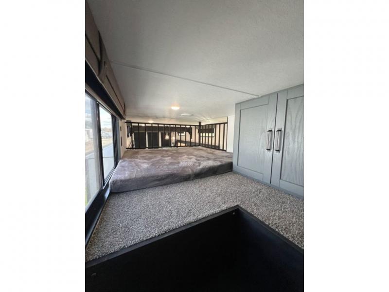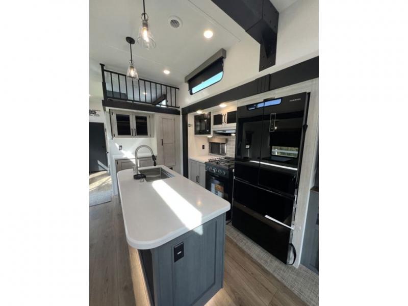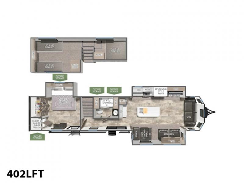 Wherever your destination may be, you can be sure to enjoy it to the fullest with this trailer in tow! With two entry doors, you can enter in through the rear private bedroom or the main living area. The bedroom includes a king bed slide out, a wardrobe/closet to keep your clothes organized, plus a closet with washer and dryer prep. Just outside this room are steps that lead to the large loft area with a 58" x 58" bunk mat and a cabinet on one side, plus two 32" x 69" bunk mats on the other. There is also a cabinet and a wardrobe/closet for plenty of storage space. Once you've headed back downstairs, you can relax on the theater seating, front sofa, or table and chairs with a bench seating. And the chef of your group will love the kitchen with its residential style refrigerator and pantry, kitchen island, and four burner cooktop!