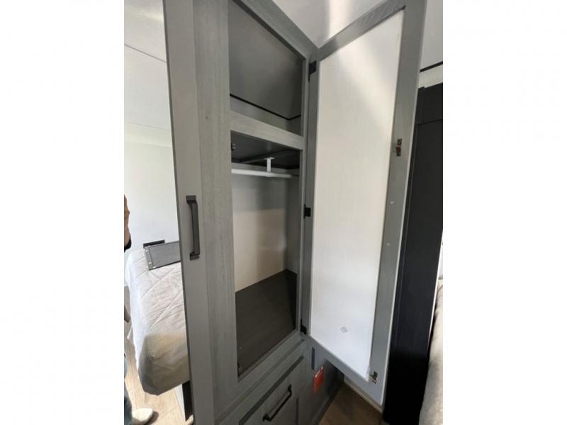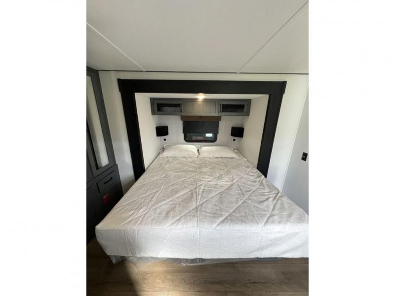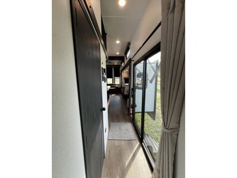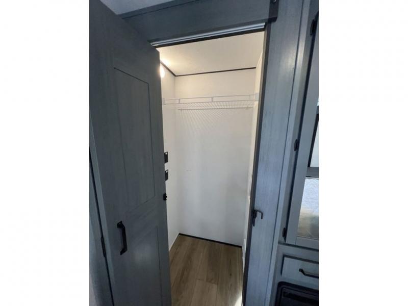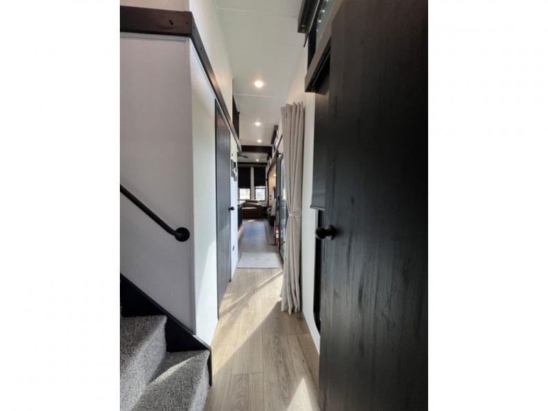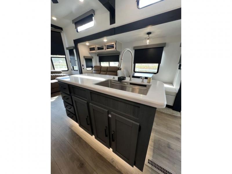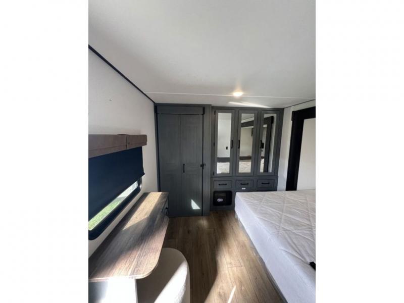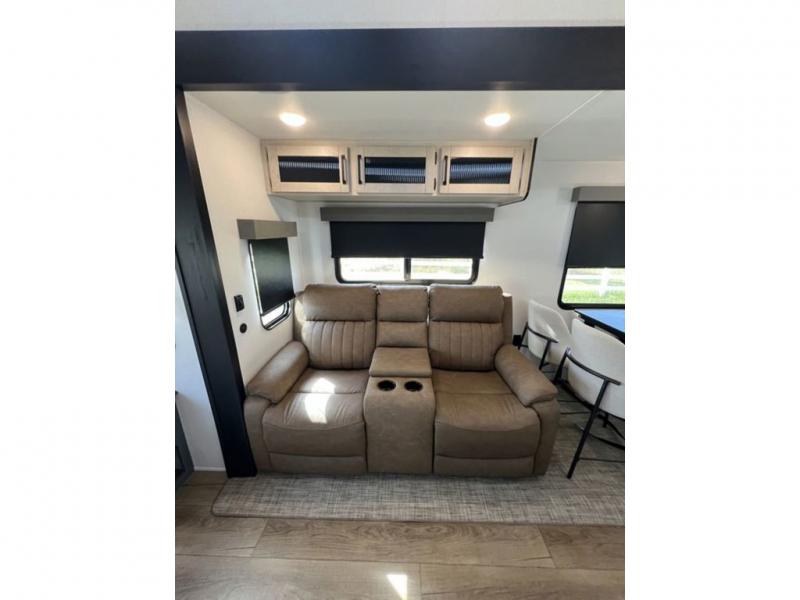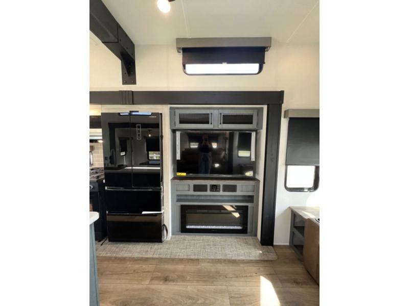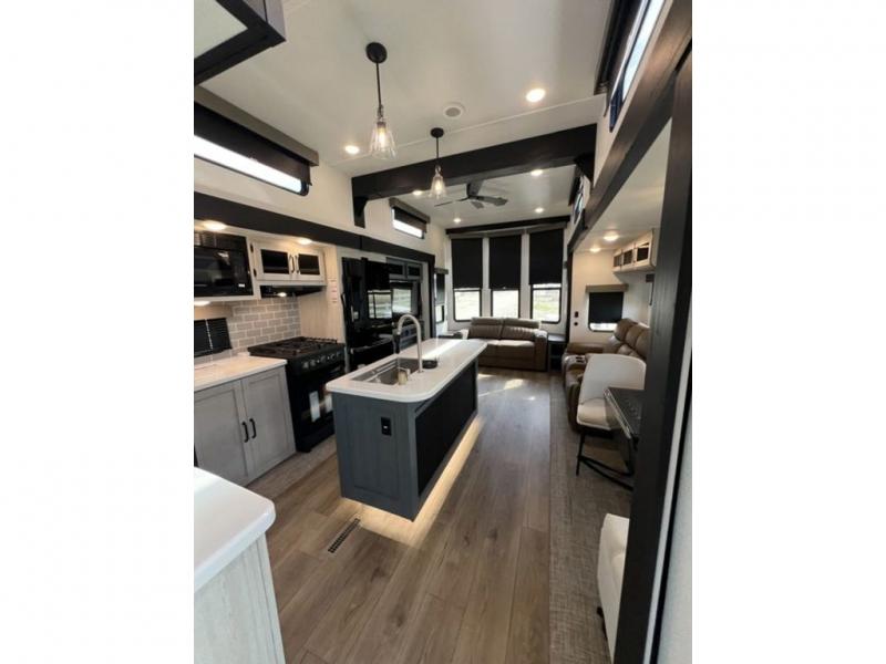 Wherever your destination may be, you can be sure to enjoy it to the fullest with this trailer in tow! With two entry doors, you can enter in through the rear private bedroom or the main living area. The bedroom includes a king bed slide out, a wardrobe/closet to keep your clothes organized, plus a closet with washer and dryer prep. Just outside this room are steps that lead to the large loft area with a 58" x 58" bunk mat and a cabinet on one side, plus two 32" x 69" bunk mats on the other. There is also a cabinet and a wardrobe/closet for plenty of storage space. Once you've headed back downstairs, you can relax on the theater seating, front sofa, or table and chairs with a bench seating. And the chef of your group will love the kitchen with its residential style refrigerator and pantry, kitchen island, and four burner cooktop!