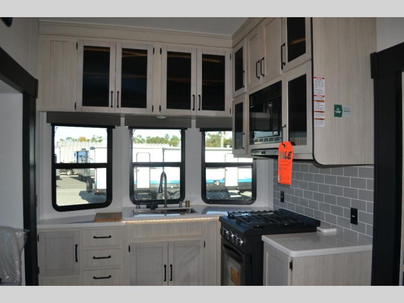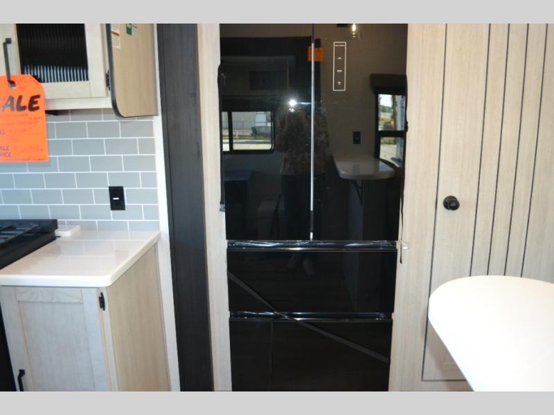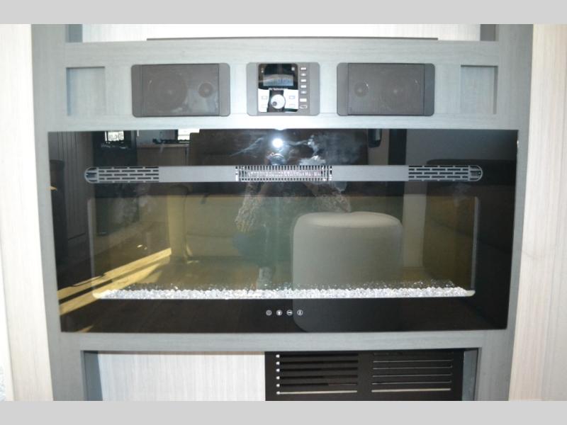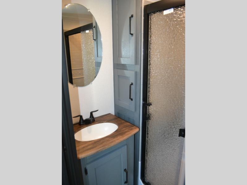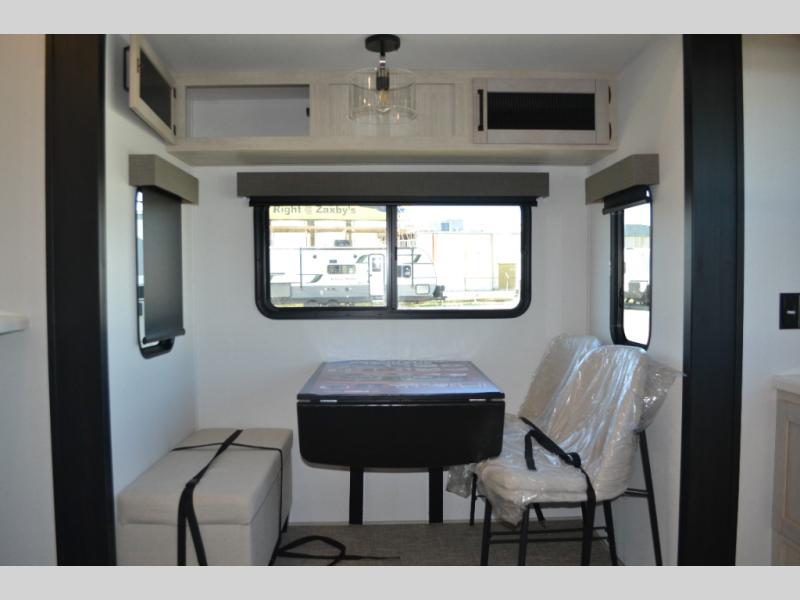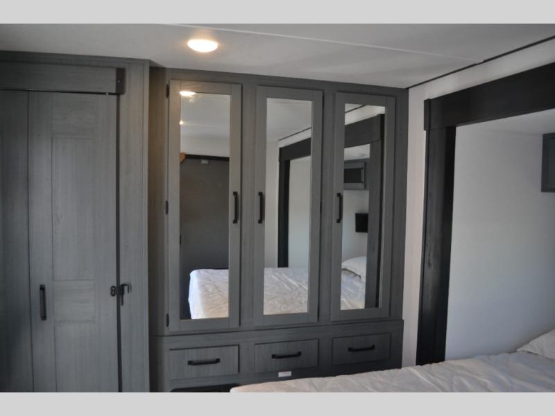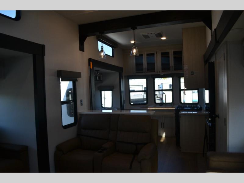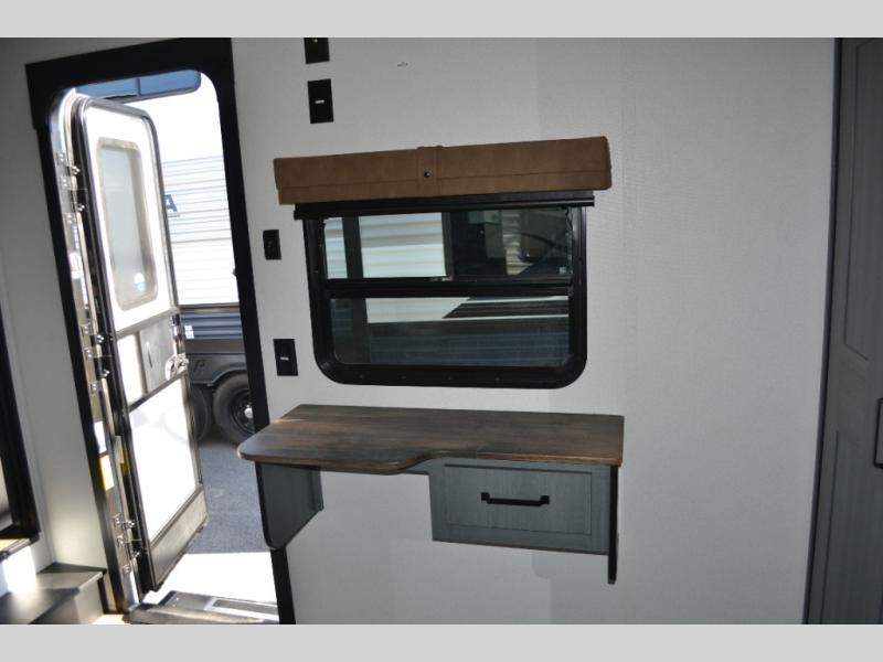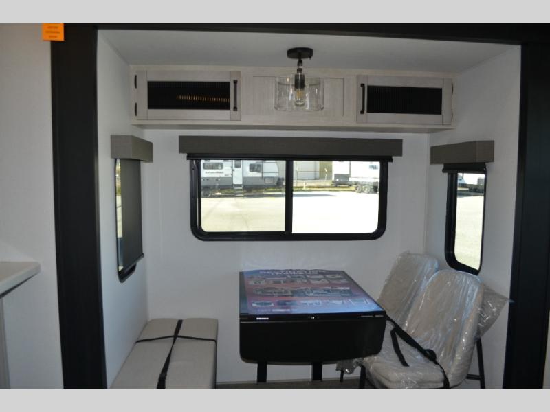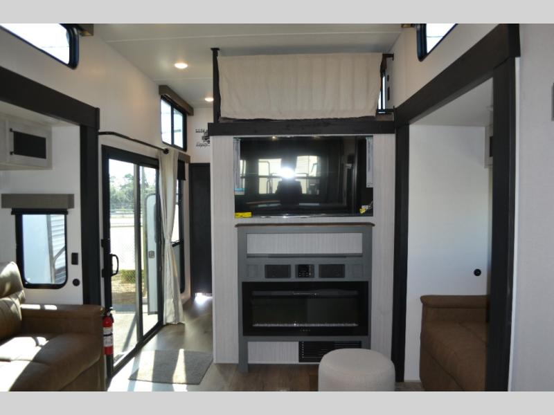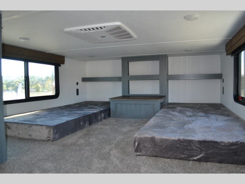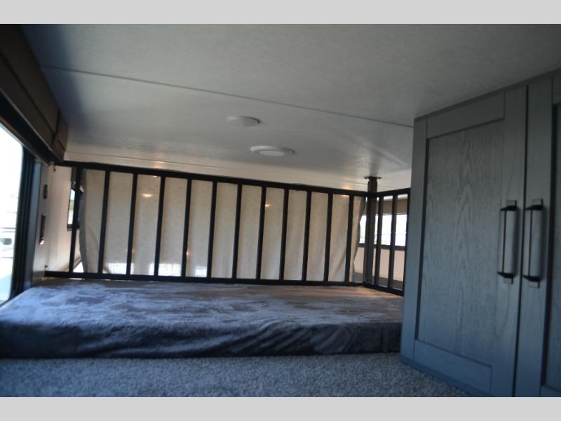 This is the perfect destination trailer for a larger group since it can sleep up to nine campers each night. The little ones will love the double loft areas with three bunk mats and storage space for their things, while you take the rear private bedroom. There is a king bed slide out here, along with a wardrobe/closet for your clothes, plus a second closet with washer and dryer prep. Everyone can meet in the middle living room to relax on the dual opposing sofas or theater seating across from the fireplace and entertainment center. Head to the front of the unit where you'll find the kitchen that includes ample counter space to prep meals, a residential style refrigerator and pantry for food storage, and a free-standing table to dine at. There is also a breakfast nook that overlooks the living area so you can visit with the cook and watch a movie at the same time!