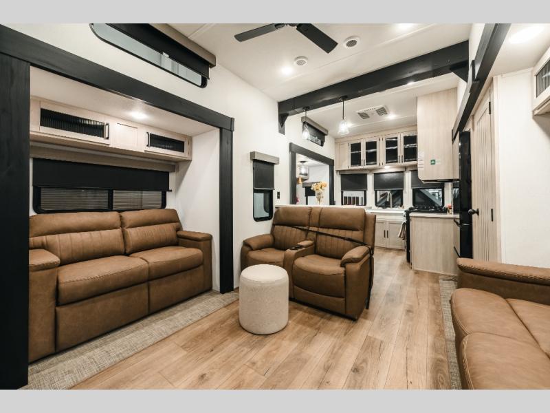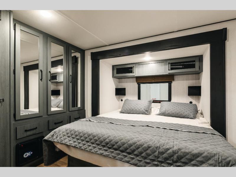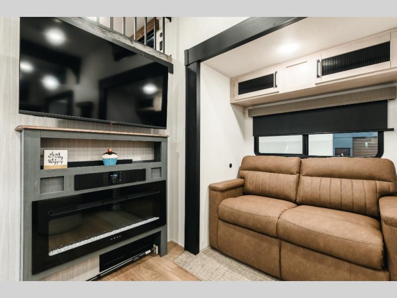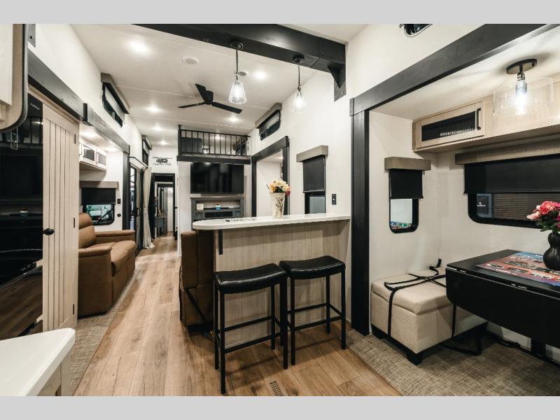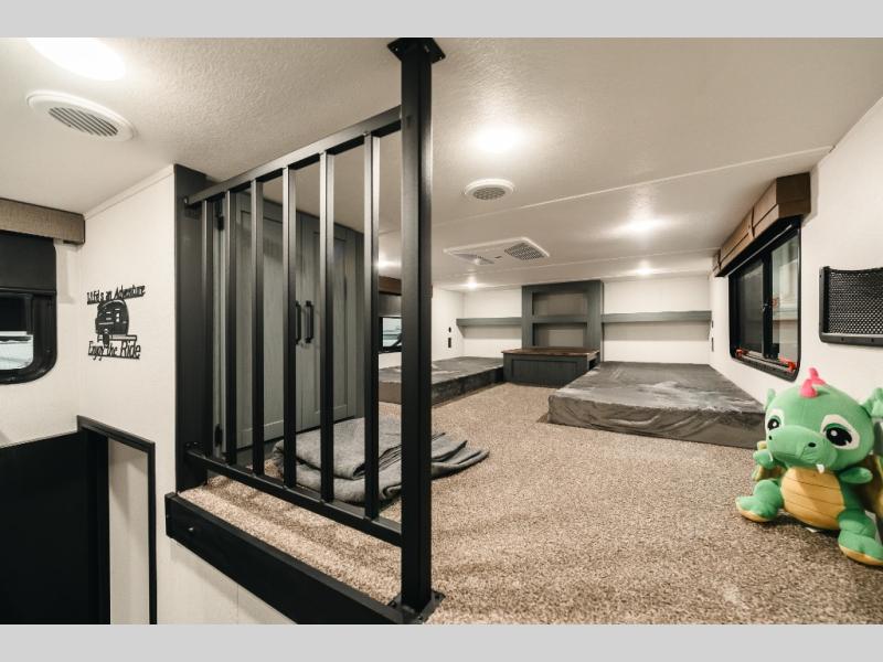 This is the perfect destination trailer for a larger group since it can sleep up to nine campers each night. The little ones will love the double loft areas with three bunk mats and storage space for their things, while you take the rear private bedroom. There is a king bed slide out here, along with a wardrobe/closet for your clothes, plus a second closet with washer and dryer prep. Everyone can meet in the middle living room to relax on the dual opposing sofas or theater seating across from the fireplace and entertainment center. Head to the front of the unit where you'll find the kitchen that includes ample counter space to prep meals, a residential style refrigerator and pantry for food storage, and a free-standing table to dine at. There is also a breakfast nook that overlooks the living area so you can visit with the cook and watch a movie at the same time!