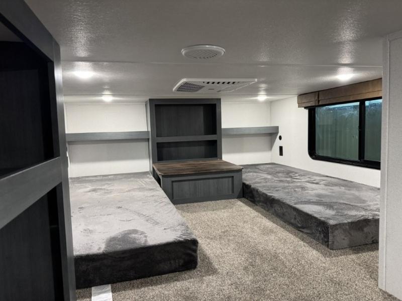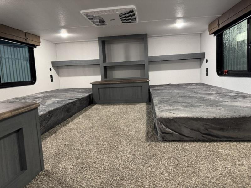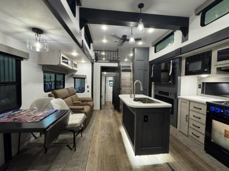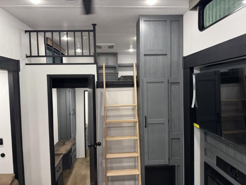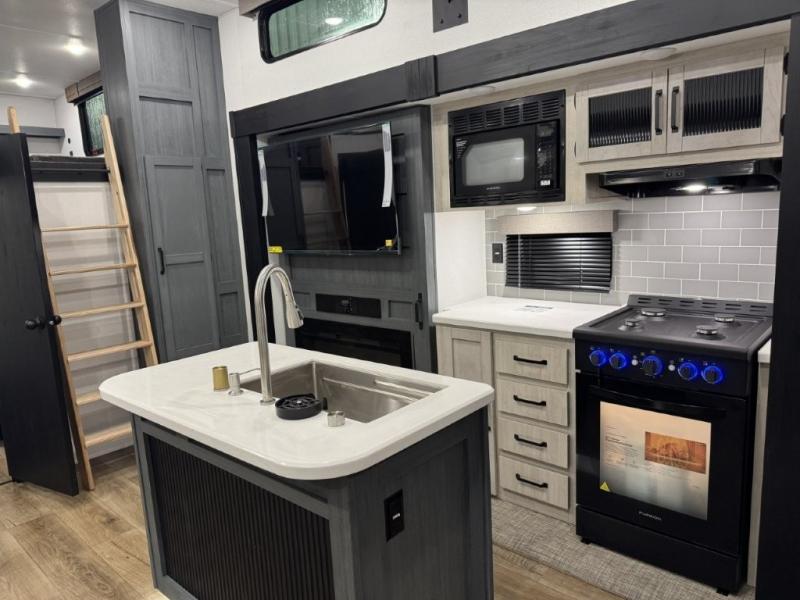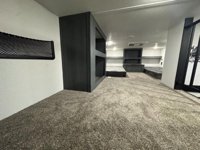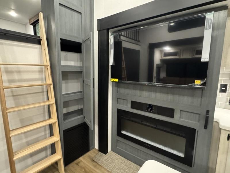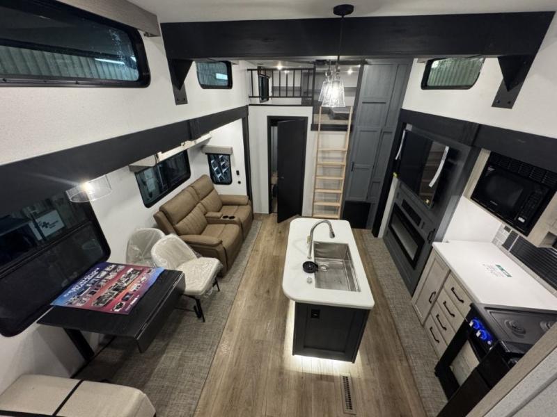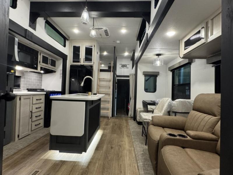 You won't believe the amount of comfort found in this destination trailer! There are two separate loft areas; one up front with a ladder, two bunk mats, storage space, and an optional fireplace, and one in the back with a ladder, two bunk mats, storage space, and a nightstand! On the main level, you'll find your own space in the front private bedroom, complete with a king bed slide, a countertop, dresser, and even washer and dryer prep. And a full bath is right next to the bedroom for easy nighttime use. Head to the full kitchen where you'll find all the appliances to cook meals, a kitchen island with an extension for more prep space, plus two pantries, one being hidden behind the TV! The comfort continues on in the rear master bedroom, complete with a queen bed slide, a desk with a chair, and a wardrobe for clothes. And the second full bath is found in the very back for added convenience!