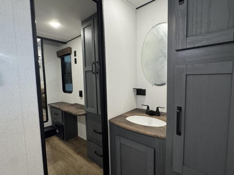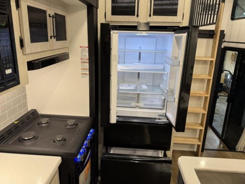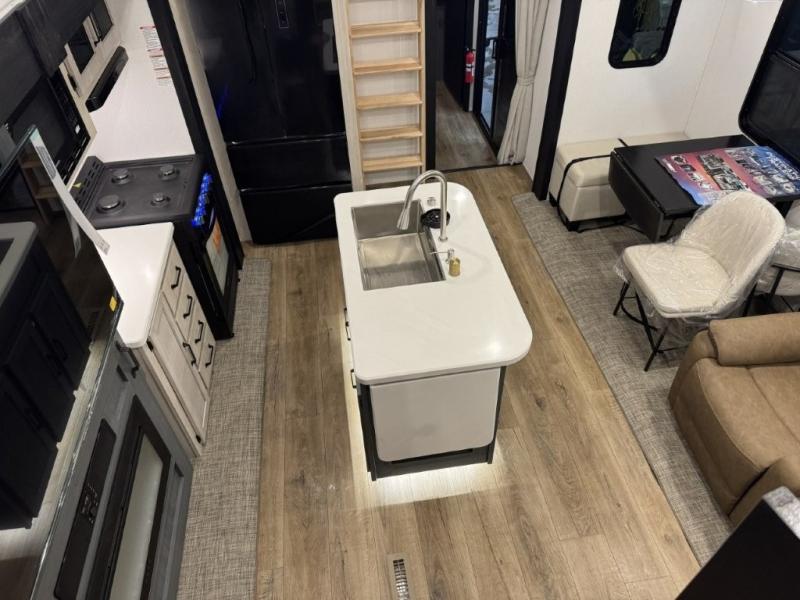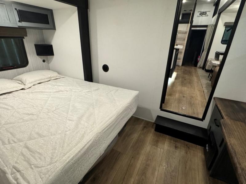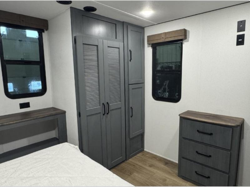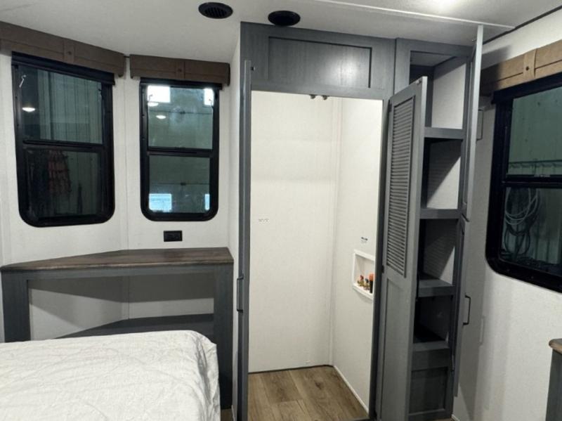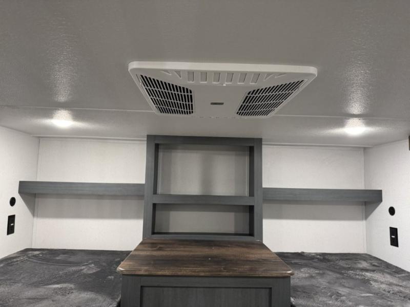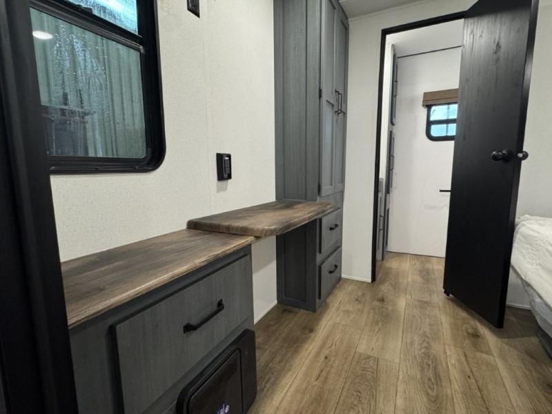 You won't believe the amount of comfort found in this destination trailer! There are two separate loft areas; one up front with a ladder, two bunk mats, storage space, and an optional fireplace, and one in the back with a ladder, two bunk mats, storage space, and a nightstand! On the main level, you'll find your own space in the front private bedroom, complete with a king bed slide, a countertop, dresser, and even washer and dryer prep. And a full bath is right next to the bedroom for easy nighttime use. Head to the full kitchen where you'll find all the appliances to cook meals, a kitchen island with an extension for more prep space, plus two pantries, one being hidden behind the TV! The comfort continues on in the rear master bedroom, complete with a queen bed slide, a desk with a chair, and a wardrobe for clothes. And the second full bath is found in the very back for added convenience!