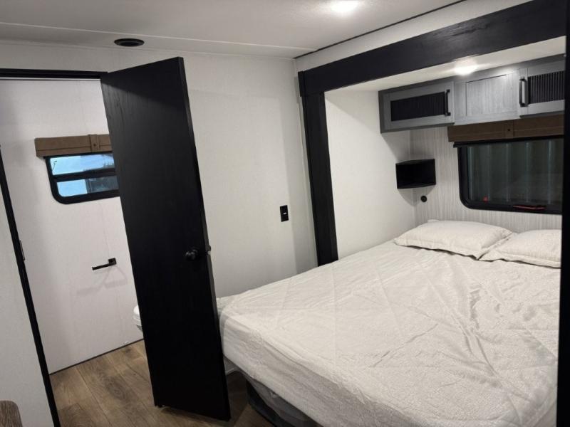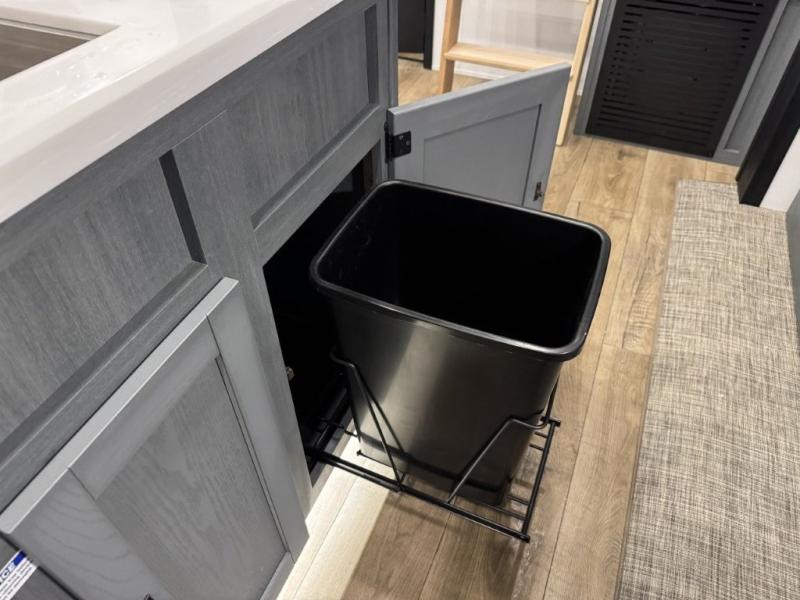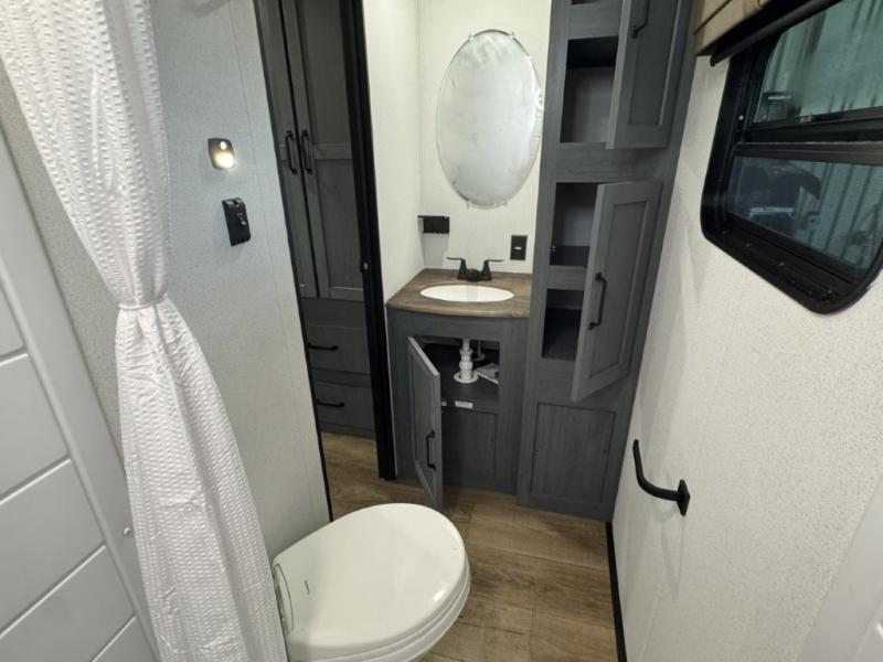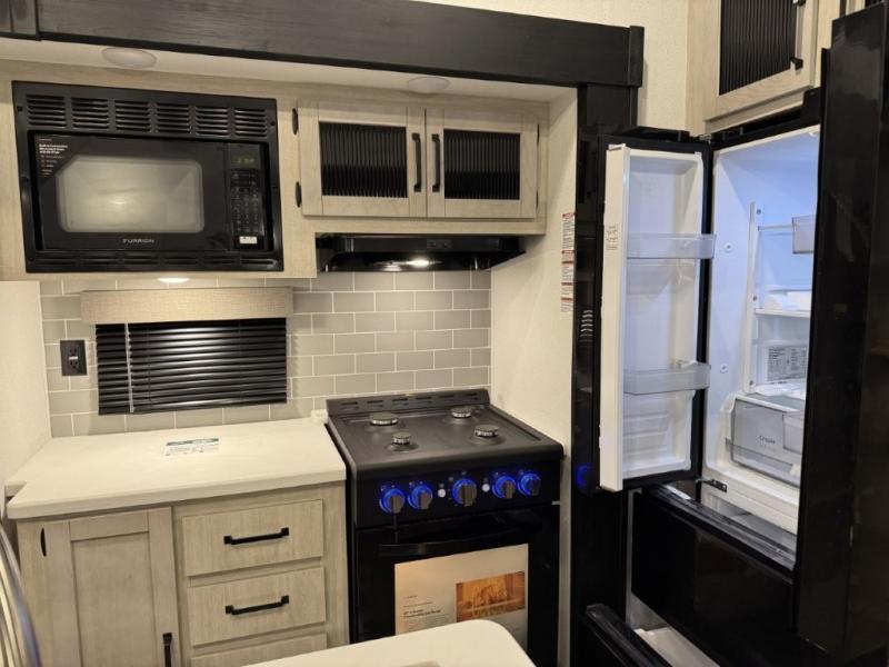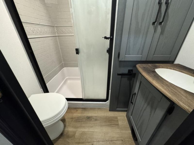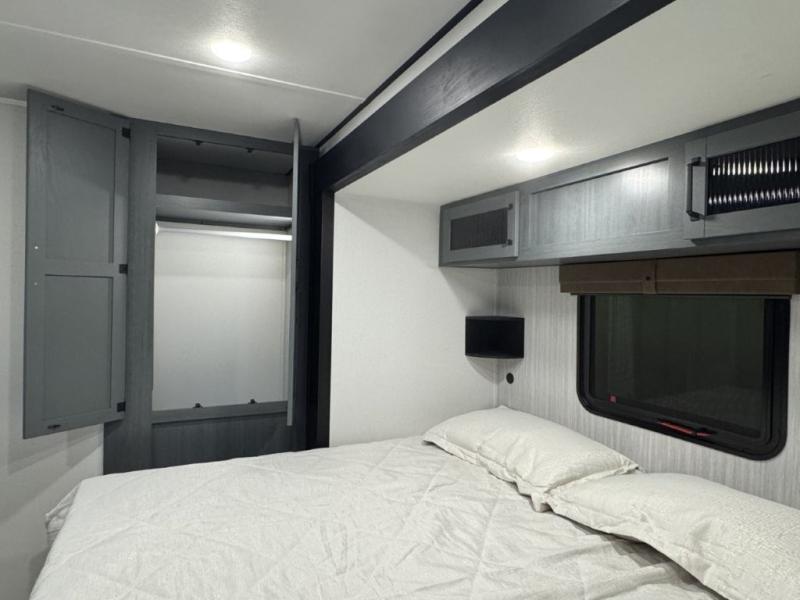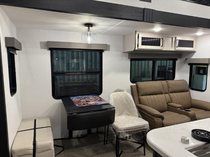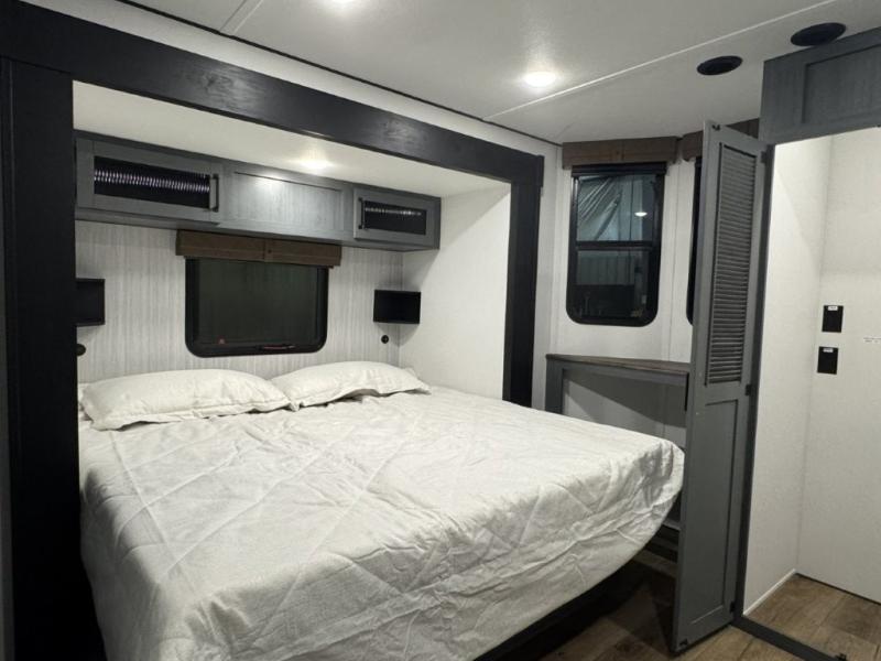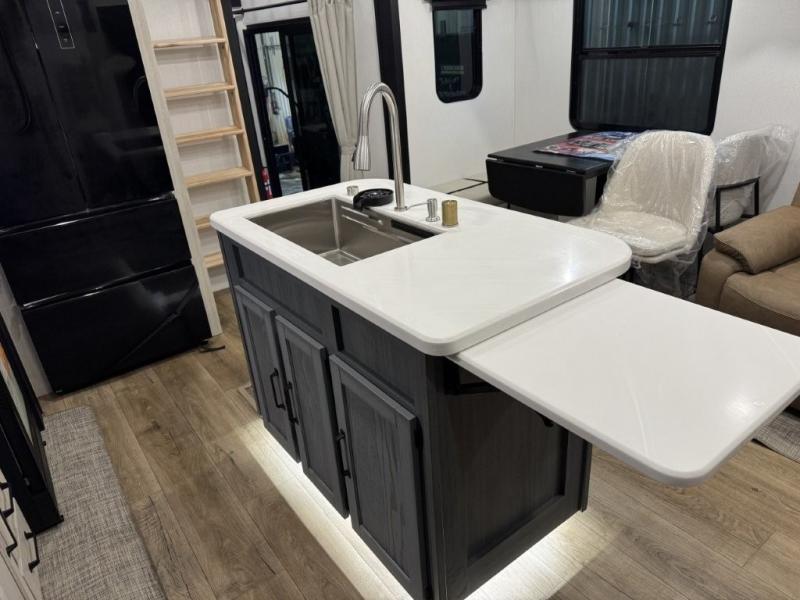 You won't believe the amount of comfort found in this destination trailer! There are two separate loft areas; one up front with a ladder, two bunk mats, storage space, and an optional fireplace, and one in the back with a ladder, two bunk mats, storage space, and a nightstand! On the main level, you'll find your own space in the front private bedroom, complete with a king bed slide, a countertop, dresser, and even washer and dryer prep. And a full bath is right next to the bedroom for easy nighttime use. Head to the full kitchen where you'll find all the appliances to cook meals, a kitchen island with an extension for more prep space, plus two pantries, one being hidden behind the TV! The comfort continues on in the rear master bedroom, complete with a queen bed slide, a desk with a chair, and a wardrobe for clothes. And the second full bath is found in the very back for added convenience!