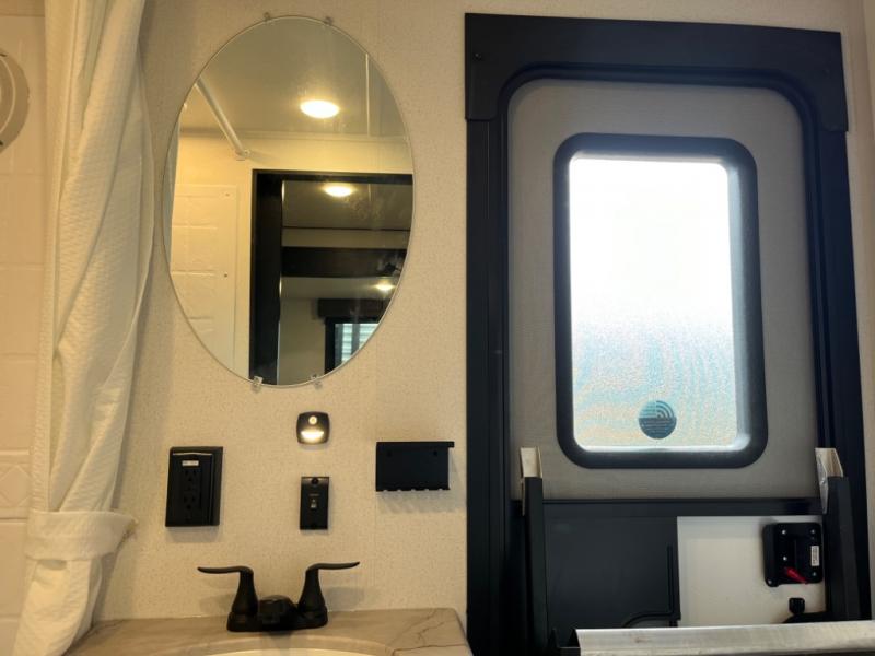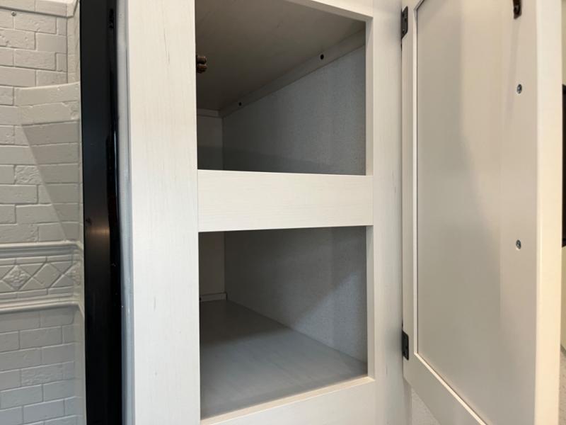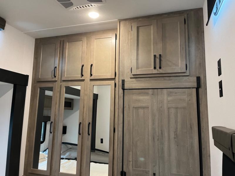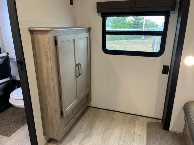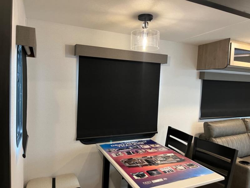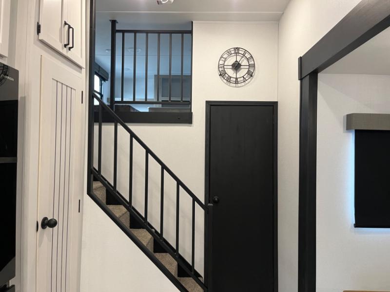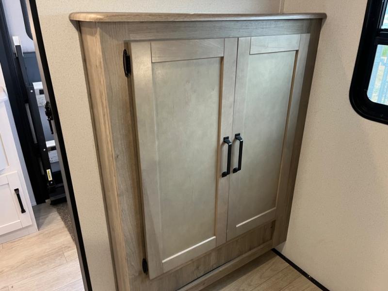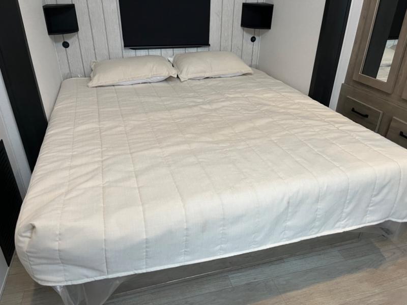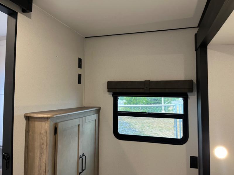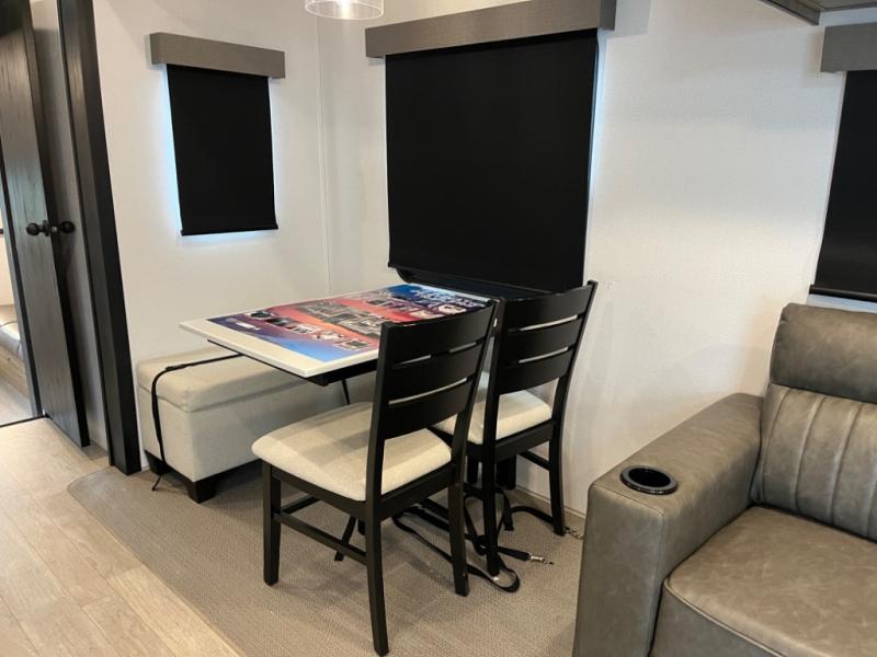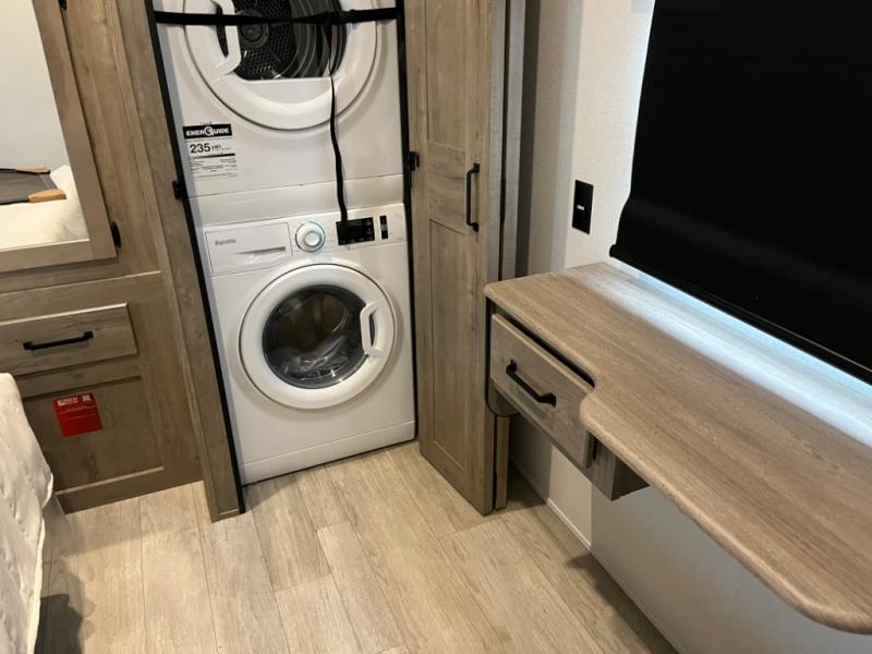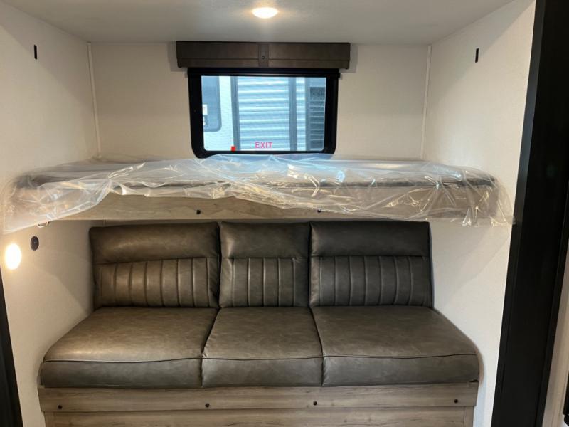 If you're planning to camp with a larger group or your family, this destination trailer will provide everything you're looking for! Your guests can take the rear bunkhouse suite that includes a slide out with a jiffy sofa and bunk bed, an entertainment center, and a full bath. You'll also find one of the dual entry doors here for added convenience. There are steps just outside the bunkhouse that lead to the loft with two bunk mats and storage space to keep this space tidy! The front private bedroom will be perfect for you with its king bed slide out, wardrobe/closet, and bedroom desk if you're needing to work from home. There is even a closet with the option to add washer and dryer prep. In the morning, everyone can meet in the combined middle living area and kitchen. A large slide out here houses the free-standing table and sofa, and the fireplace is close by to make it feel a little more like home!