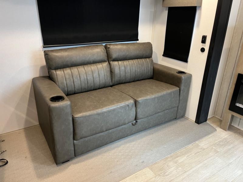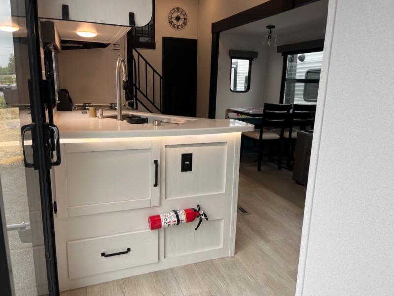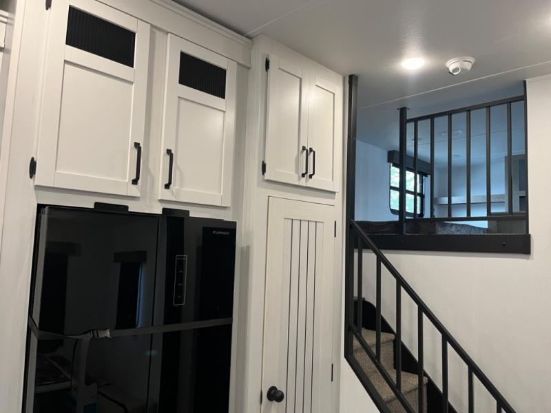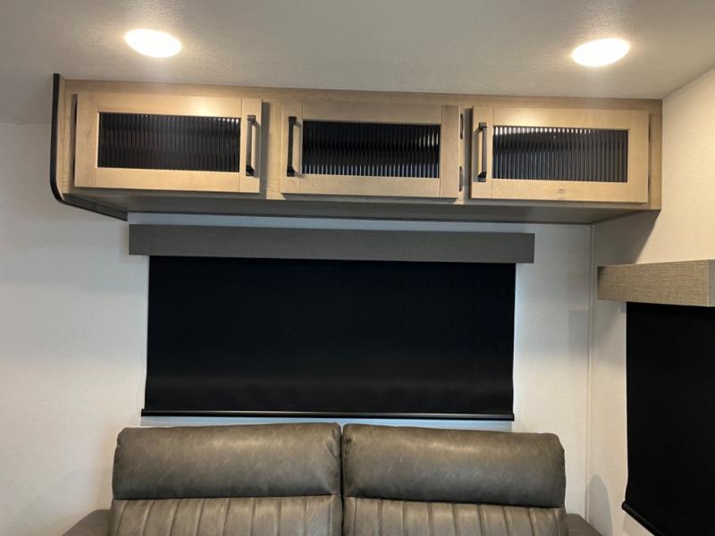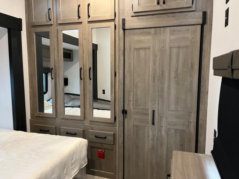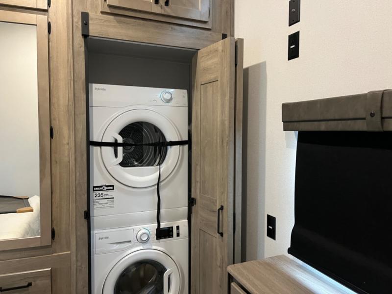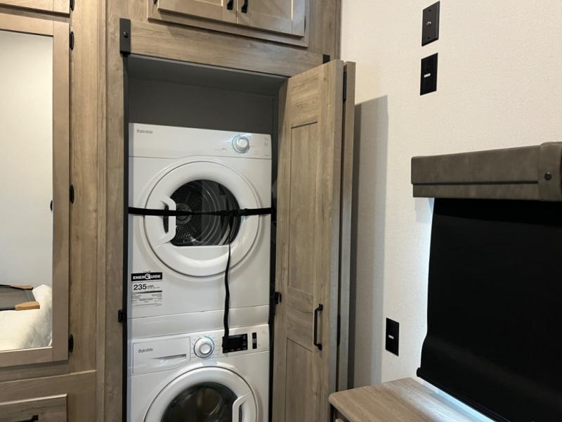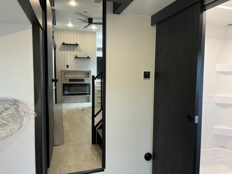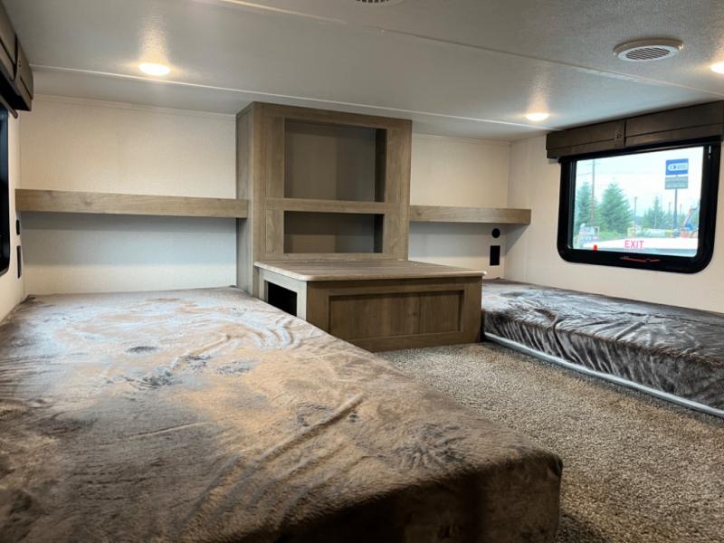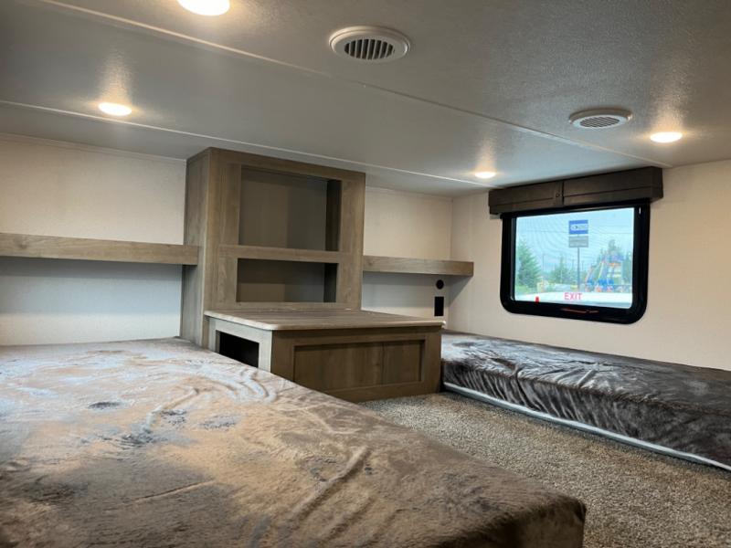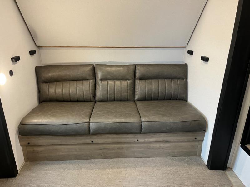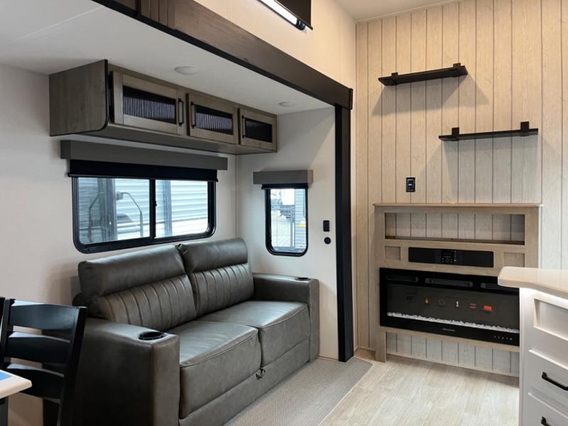 If you're planning to camp with a larger group or your family, this destination trailer will provide everything you're looking for! Your guests can take the rear bunkhouse suite that includes a slide out with a jiffy sofa and bunk bed, an entertainment center, and a full bath. You'll also find one of the dual entry doors here for added convenience. There are steps just outside the bunkhouse that lead to the loft with two bunk mats and storage space to keep this space tidy! The front private bedroom will be perfect for you with its king bed slide out, wardrobe/closet, and bedroom desk if you're needing to work from home. There is even a closet with the option to add washer and dryer prep. In the morning, everyone can meet in the combined middle living area and kitchen. A large slide out here houses the free-standing table and sofa, and the fireplace is close by to make it feel a little more like home!