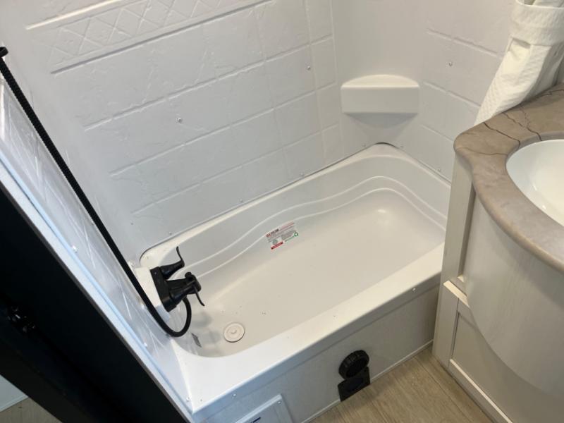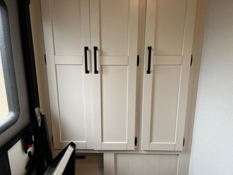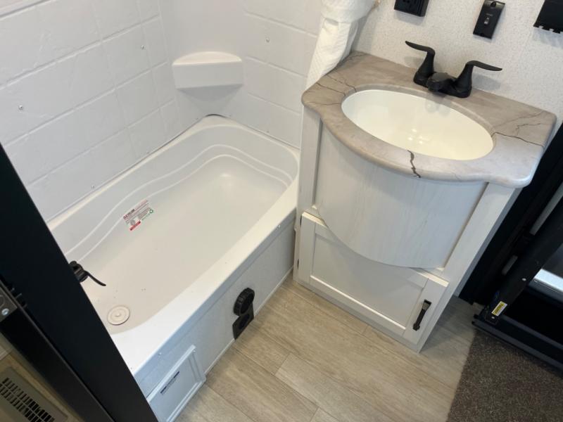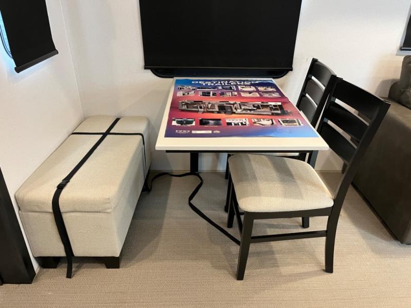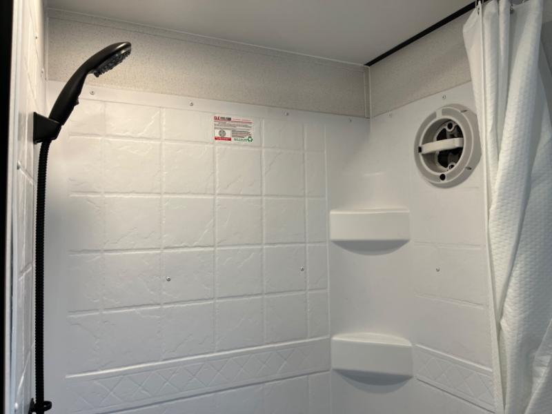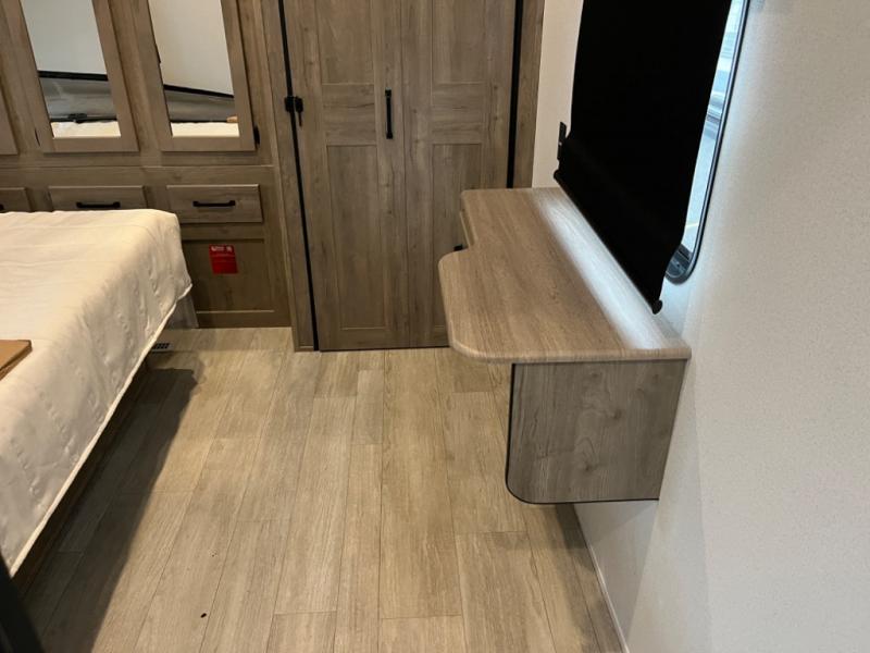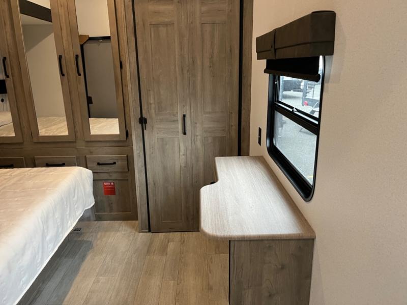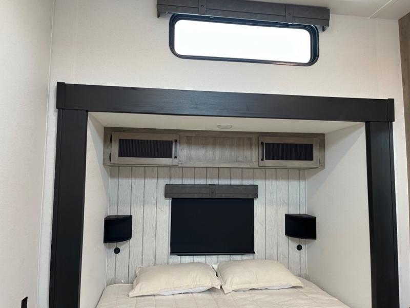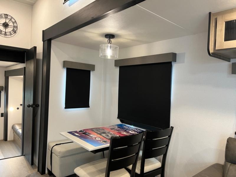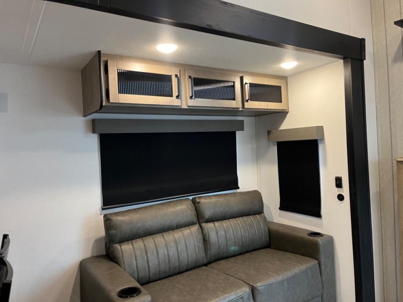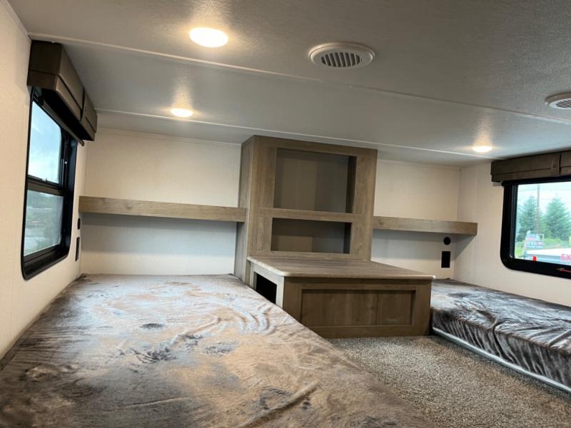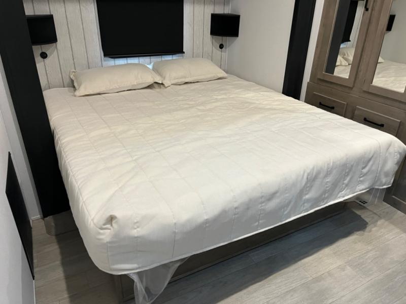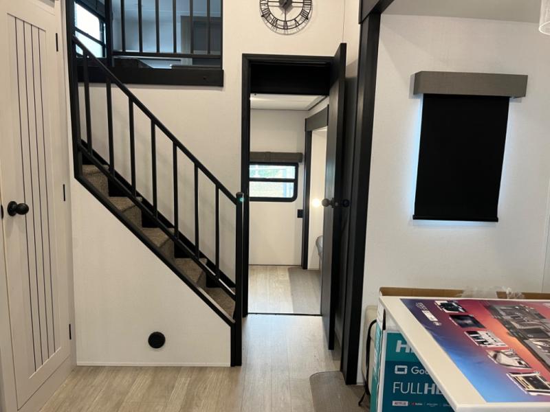 If you're planning to camp with a larger group or your family, this destination trailer will provide everything you're looking for! Your guests can take the rear bunkhouse suite that includes a slide out with a jiffy sofa and bunk bed, an entertainment center, and a full bath. You'll also find one of the dual entry doors here for added convenience. There are steps just outside the bunkhouse that lead to the loft with two bunk mats and storage space to keep this space tidy! The front private bedroom will be perfect for you with its king bed slide out, wardrobe/closet, and bedroom desk if you're needing to work from home. There is even a closet with the option to add washer and dryer prep. In the morning, everyone can meet in the combined middle living area and kitchen. A large slide out here houses the free-standing table and sofa, and the fireplace is close by to make it feel a little more like home!