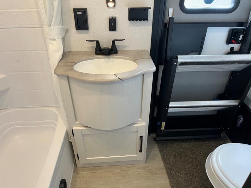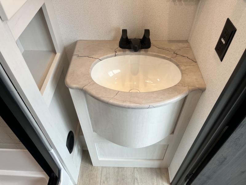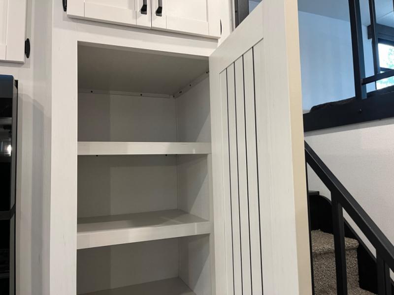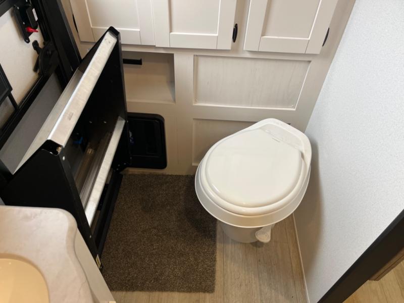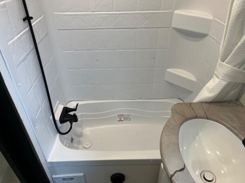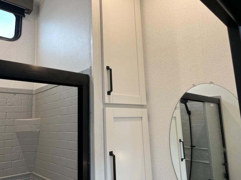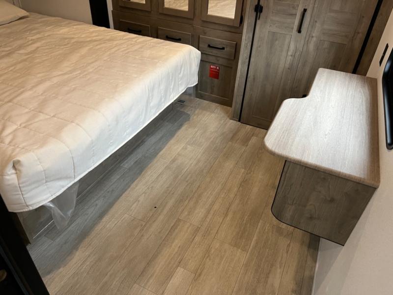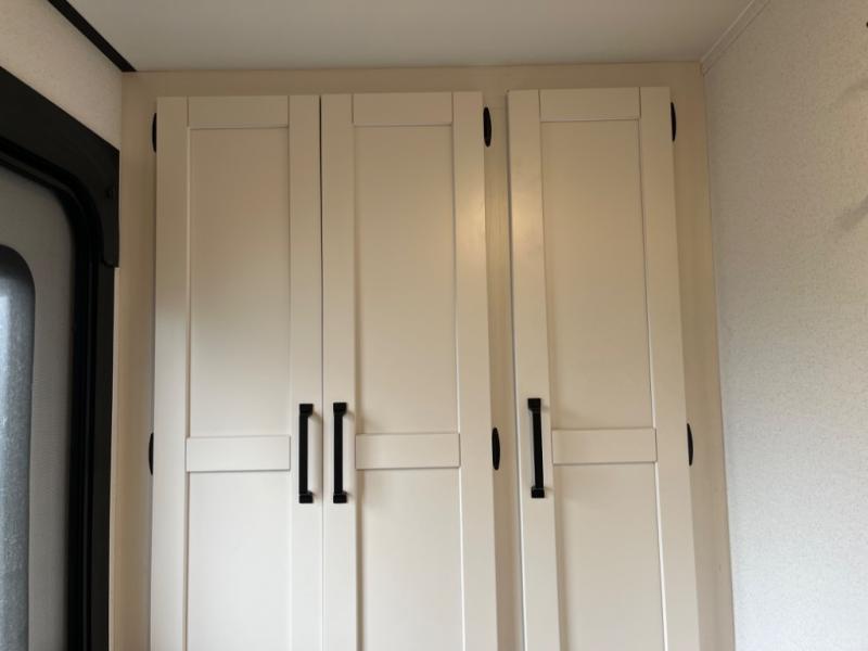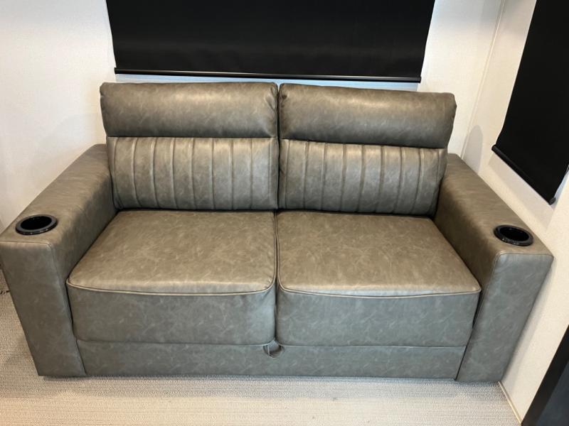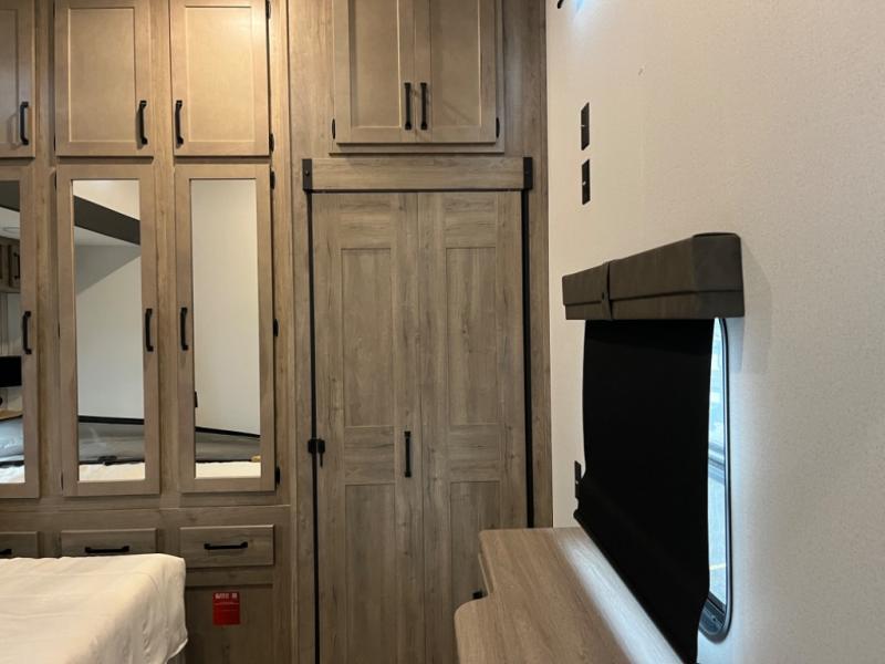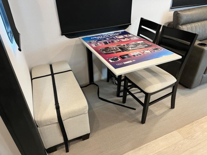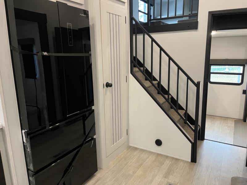 If you're planning to camp with a larger group or your family, this destination trailer will provide everything you're looking for! Your guests can take the rear bunkhouse suite that includes a slide out with a jiffy sofa and bunk bed, an entertainment center, and a full bath. You'll also find one of the dual entry doors here for added convenience. There are steps just outside the bunkhouse that lead to the loft with two bunk mats and storage space to keep this space tidy! The front private bedroom will be perfect for you with its king bed slide out, wardrobe/closet, and bedroom desk if you're needing to work from home. There is even a closet with the option to add washer and dryer prep. In the morning, everyone can meet in the combined middle living area and kitchen. A large slide out here houses the free-standing table and sofa, and the fireplace is close by to make it feel a little more like home!