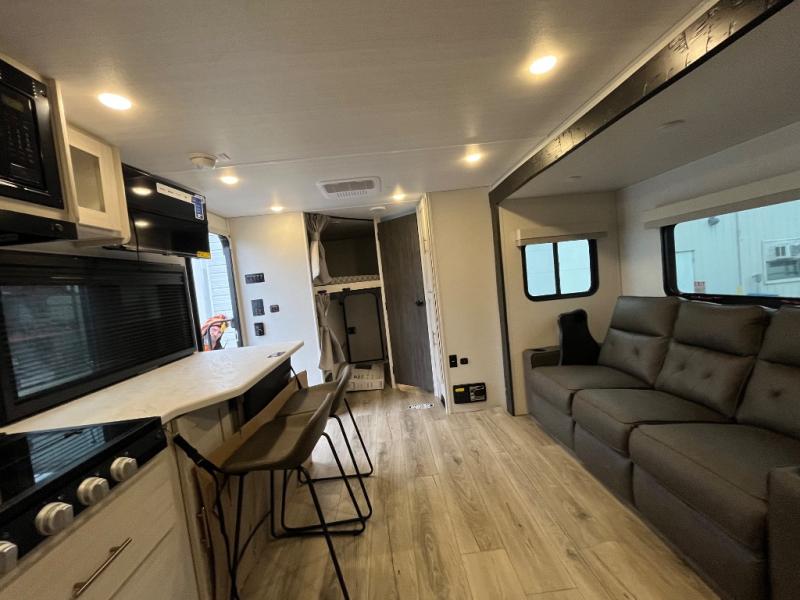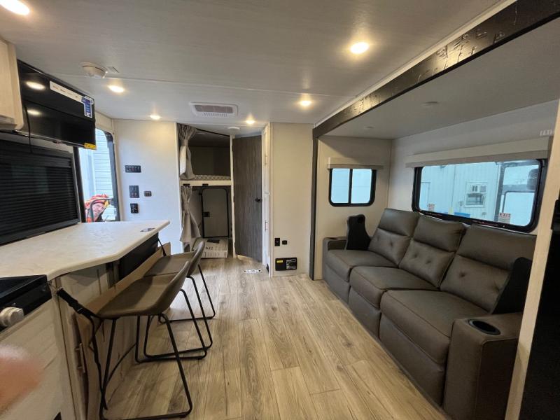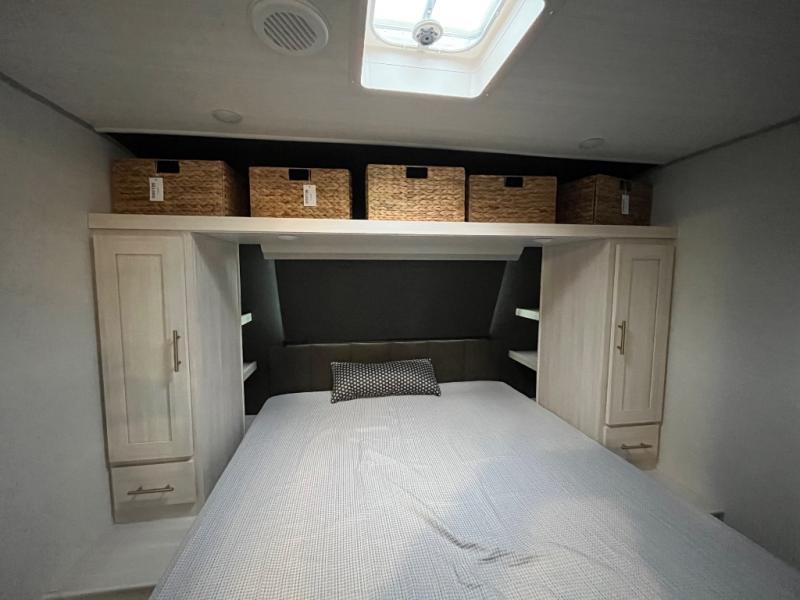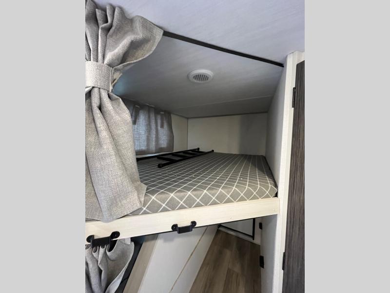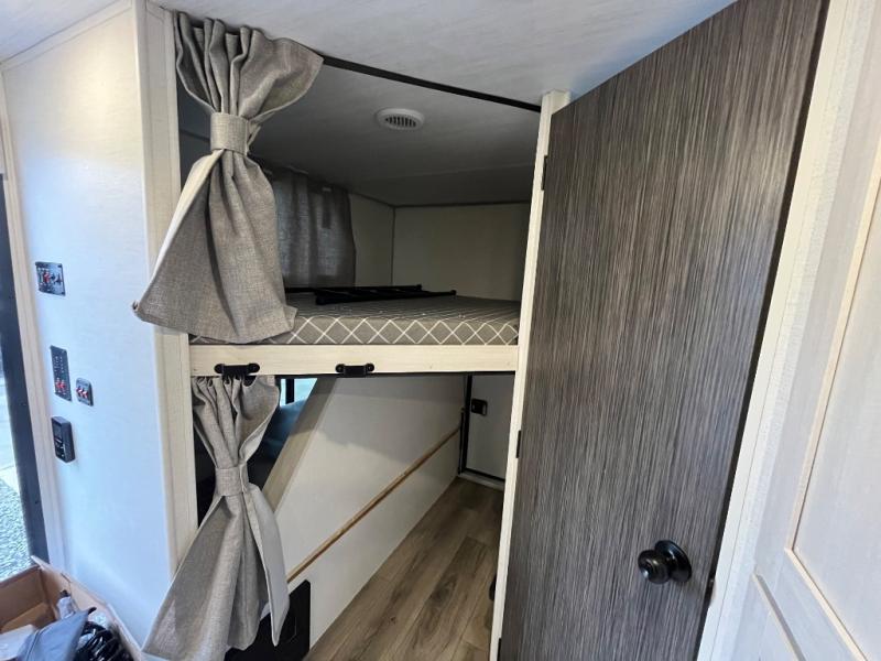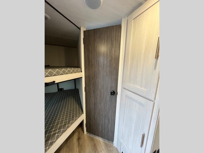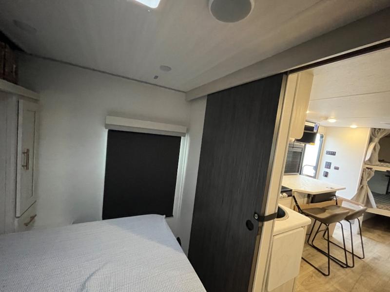 Discover ultimate comfort and functionality in travel with this incredible travel trailer. The full bathroom is a practical and functional space for personal care, ensuring comfort on every journey. Double bunk beds are ideal for families or travelers seeking additional cozy sleeping options. You can cook like a Michelin-star chef with the complete kitchen that comes with a pantry, fridge, an air fryer/microwave, and a countertop extension that adds extra space for culinary prep and serving meals with ease. Further, the dreamy primary bedroom features a custom king bed with wardrobes and end tables on each side of the bed, offering storage and practical spaces for optimal comfort and accessibility.