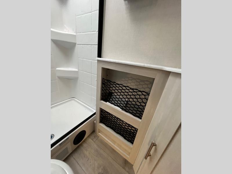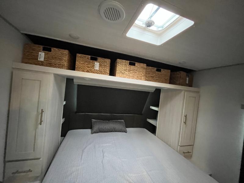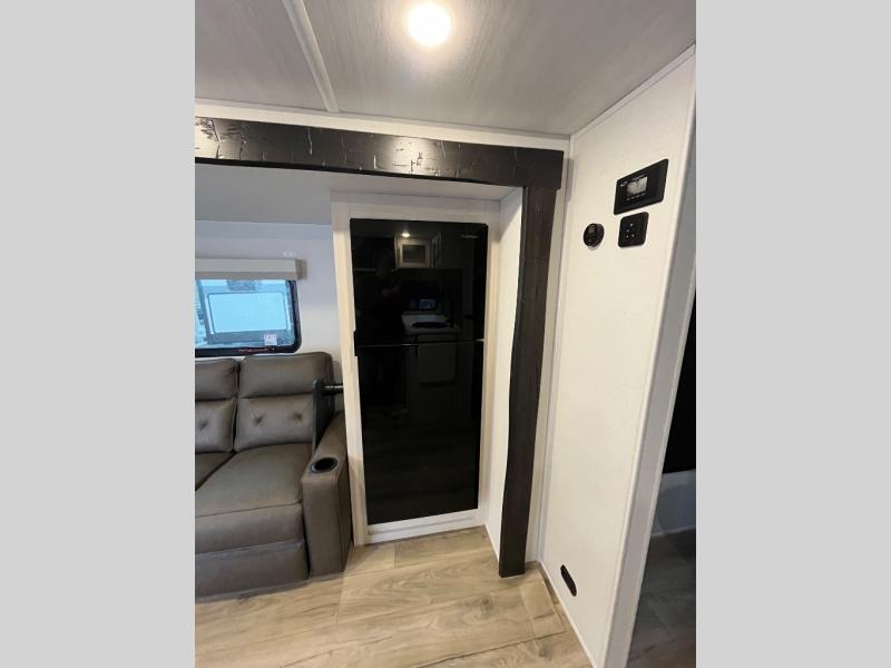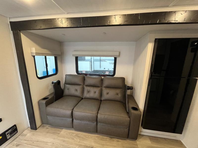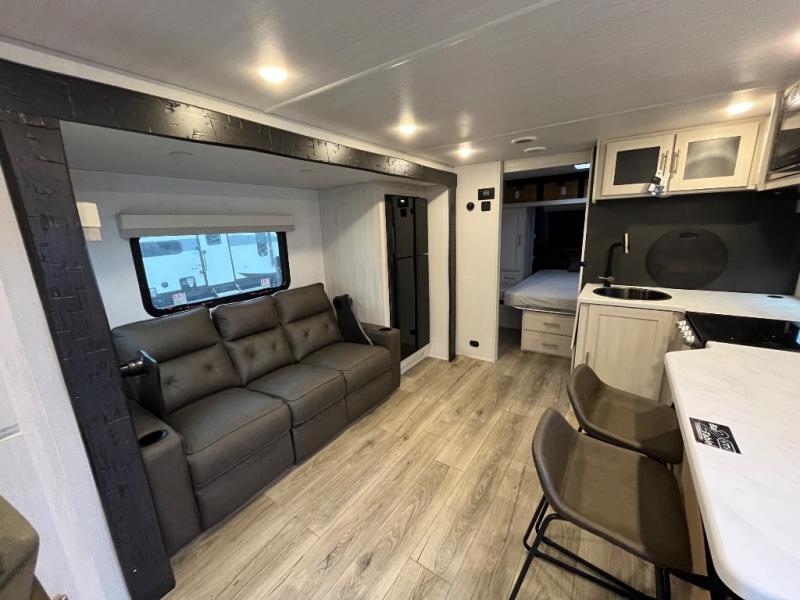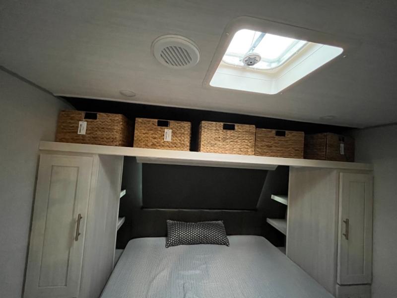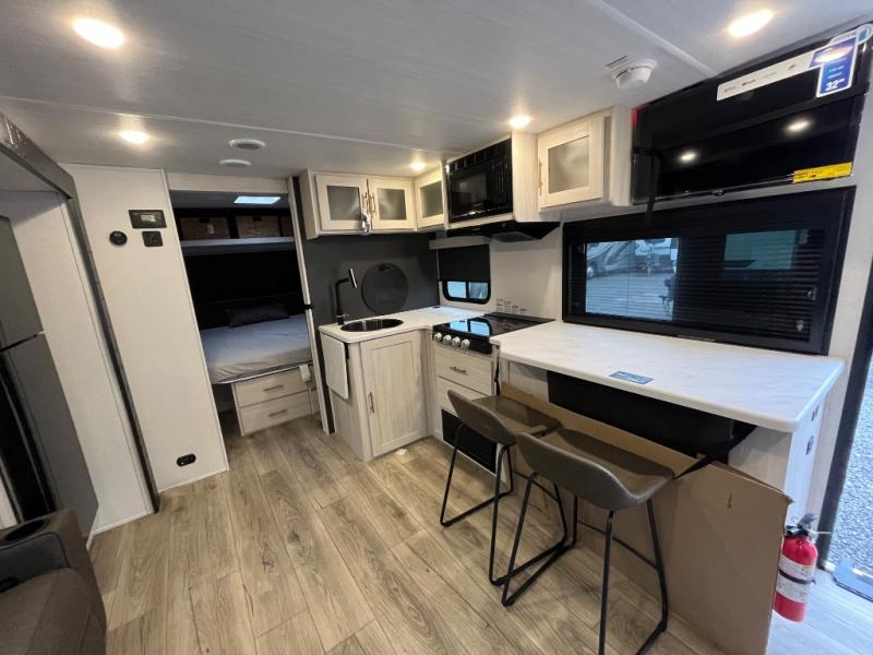 Discover ultimate comfort and functionality in travel with this incredible travel trailer. The full bathroom is a practical and functional space for personal care, ensuring comfort on every journey. Double bunk beds are ideal for families or travelers seeking additional cozy sleeping options. You can cook like a Michelin-star chef with the complete kitchen that comes with a pantry, fridge, an air fryer/microwave, and a countertop extension that adds extra space for culinary prep and serving meals with ease. Further, the dreamy primary bedroom features a custom king bed with wardrobes and end tables on each side of the bed, offering storage and practical spaces for optimal comfort and accessibility.