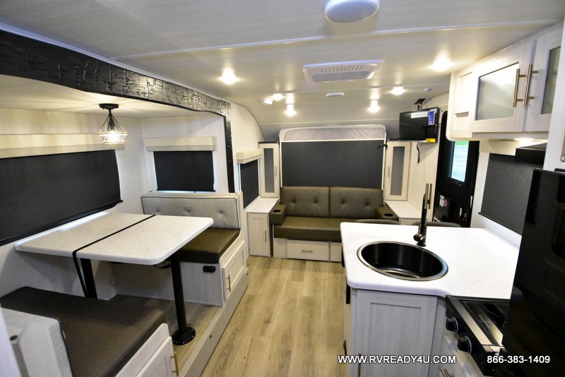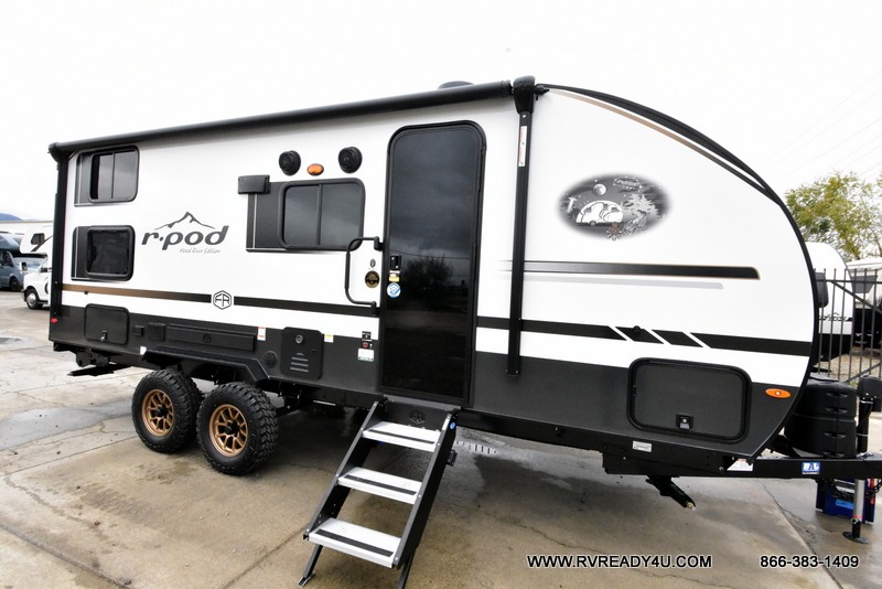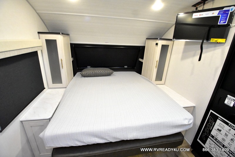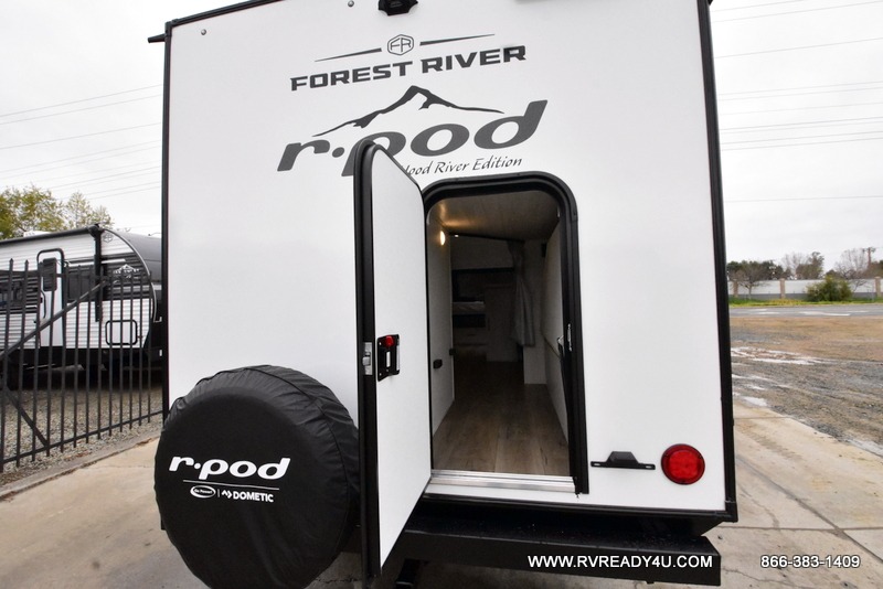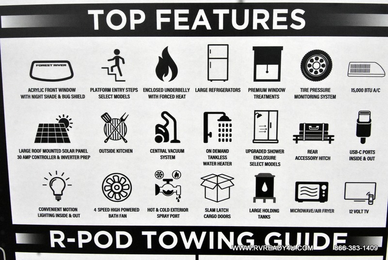 With any R-Pod travel trailer by Forest River, you will enjoy affordable luxury at the lowest tow weight in its class! There is a sealed underbelly with forced heat, a curved dual-pane acrylic front window with a bug screen and night shade, plus a large roof mounted solar panel for off-grid capabilities. The 15K A/C unit will keep you comfortable during the summer camping months, and the tankless water heater will provide endless hot showers after hiking, biking, swimming and more! Each model also includes a black glass friction hinge entrance door, roof ladder prep, exterior motion lighting, plus a hot and cold exterior spray port to wash off sand from the beach. Inside, you'll enjoy seamless Surf-X kitchen countertops, blackout roller shades, and a central vacuum system for hassle-free cleaning!
