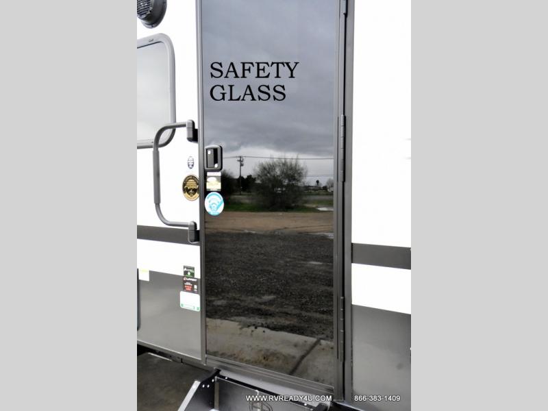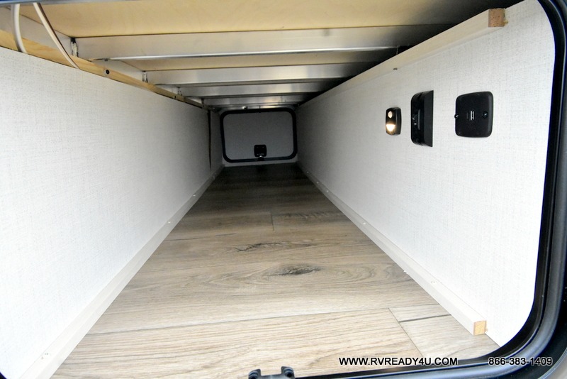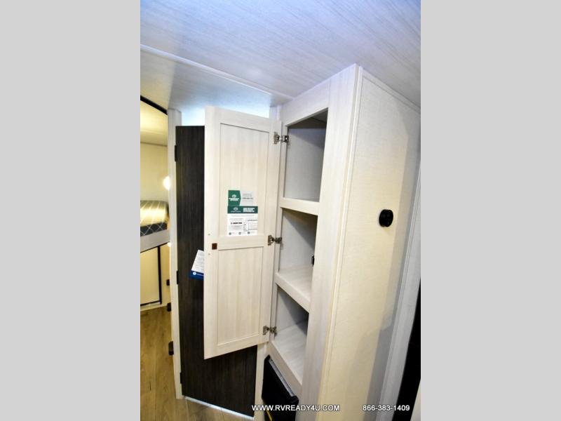 This travel trailer offers a great flexible floorplan. The living area sofa hides a queen-size Murphy bed which can be folded down at night, giving you full use of the room during the day. At the rear is a pair of double-size bunks which provide a spacious private sleeping area for children or guests. The booth dinette can also be used for an additional bed as needed. An efficient kitchen includes a bar top with high chairs plus a convection microwave and cooktop to cook meals each day.