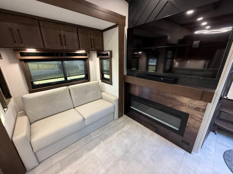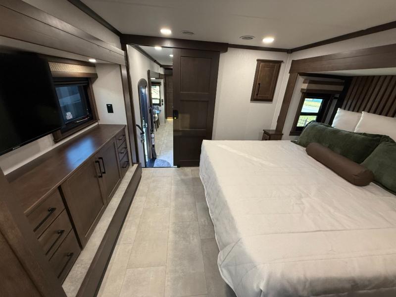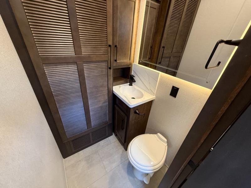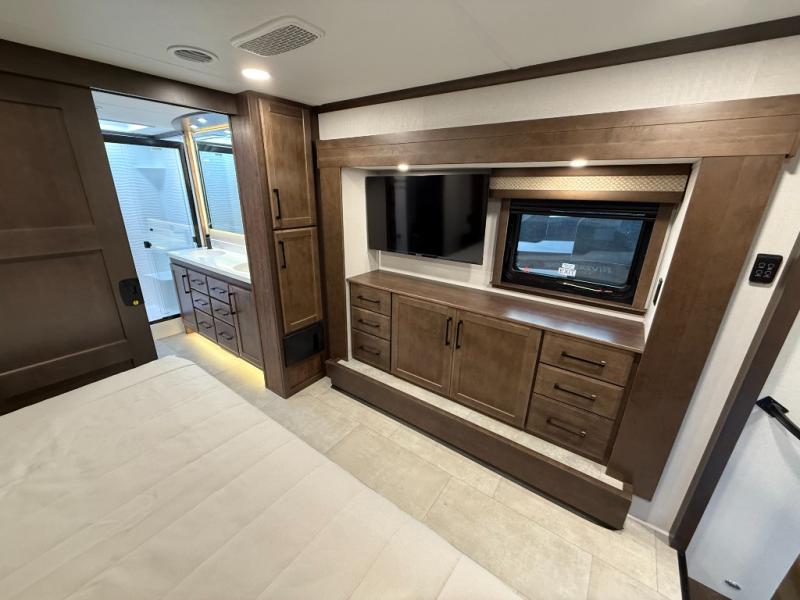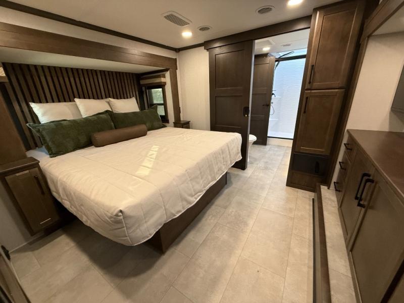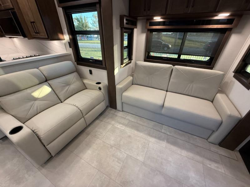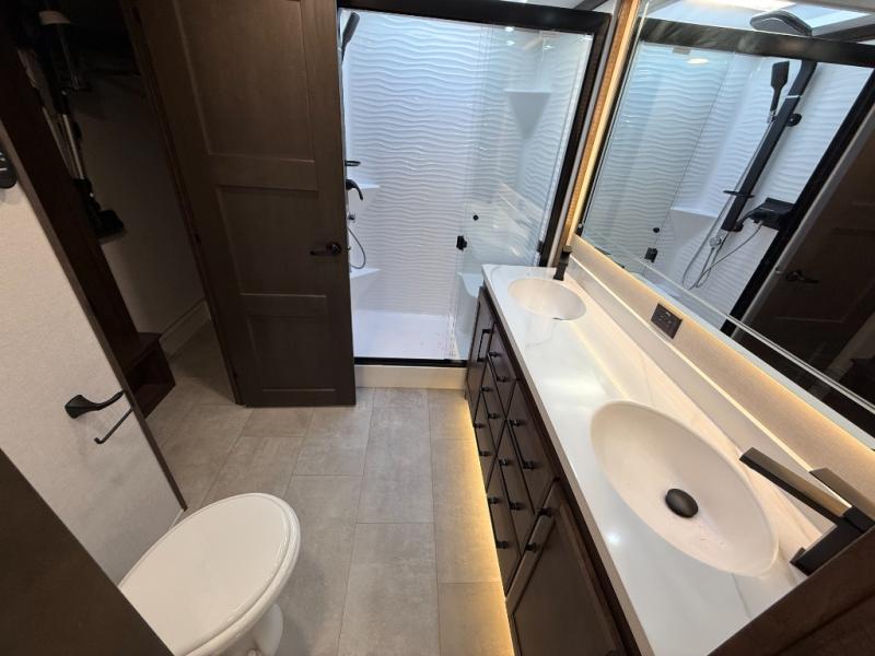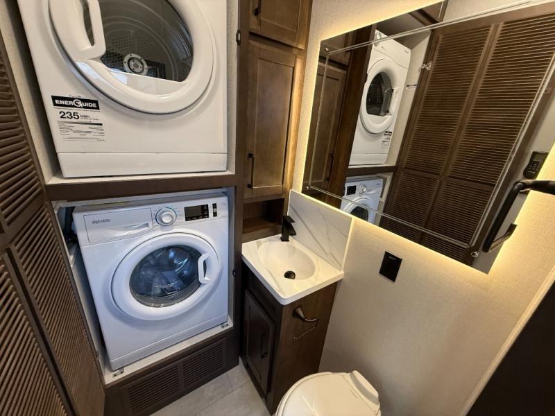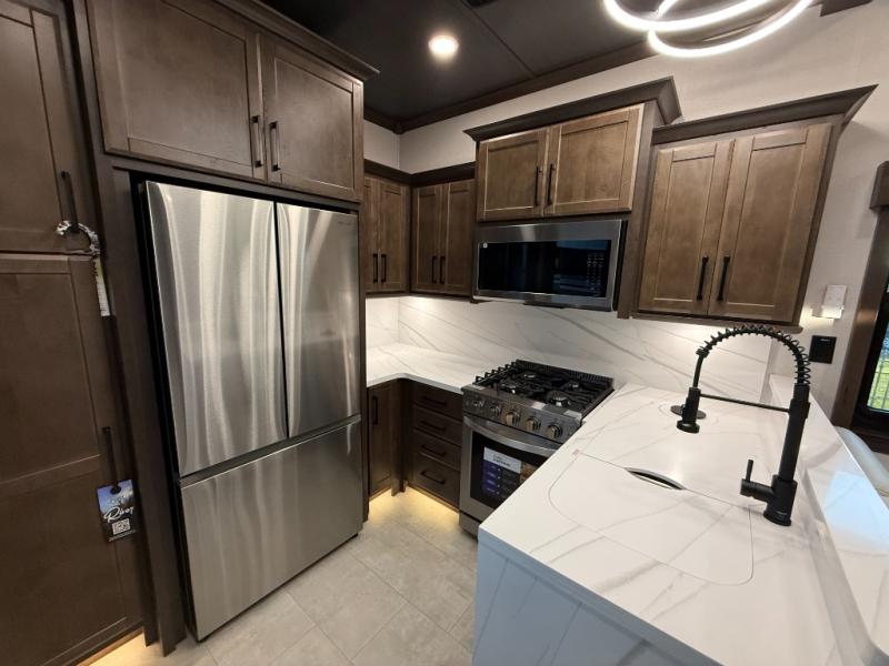 The Forest River RiverStone fifth wheels and toy haulers are luxurious units that have it all! You'll find an automatic six-point hydraulic level-up system to keep your unit in place, and there is preparation for a four-camera observation system. The TravlFi Journey XTR 4G/LTE router and WiFi extender will help you stay connected to the outside world, and you'll never have to overpack again since the Splendid “Astral” stackable washer and dryer will let you clean the small amount of clothes you've brought with you. Another high luxury is the Fischer Paykal dishwasher which will allow you to spend more time enjoying your camp life and less time cleaning up. Each unit is built with an LCI Road Armour suspension system, dual-pane frameless windows, a full docking station, a 200W solar panel, and a BMPro touch control system.