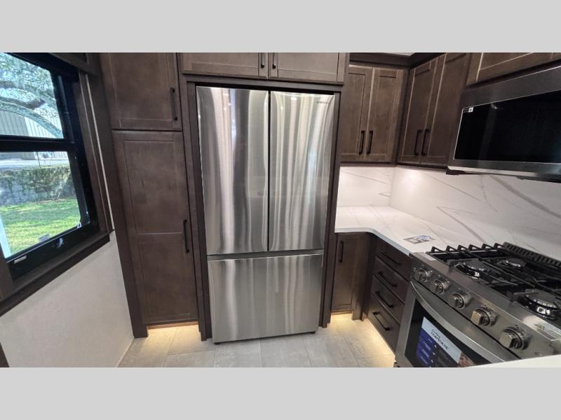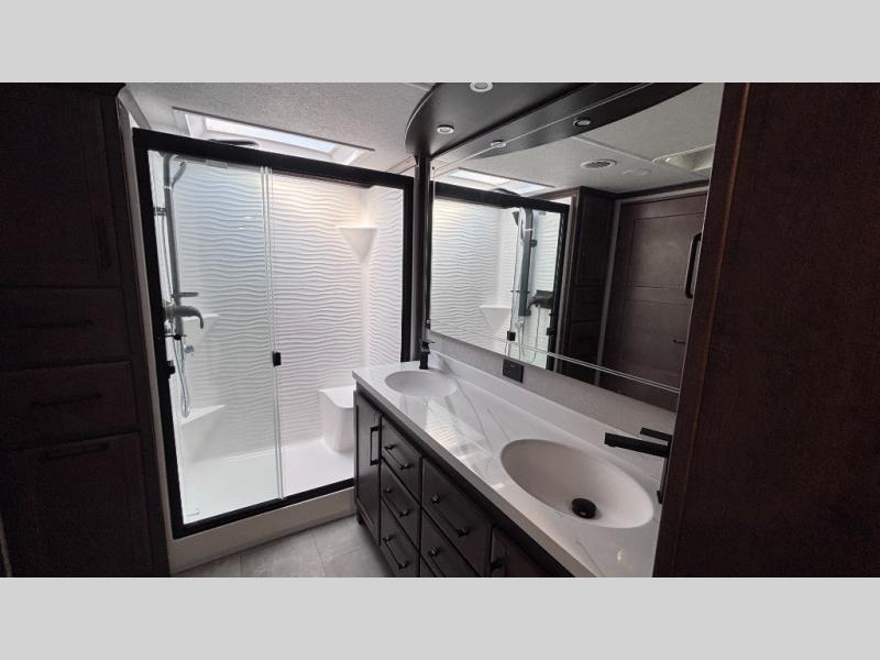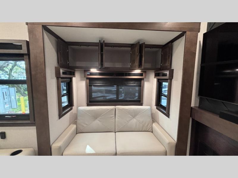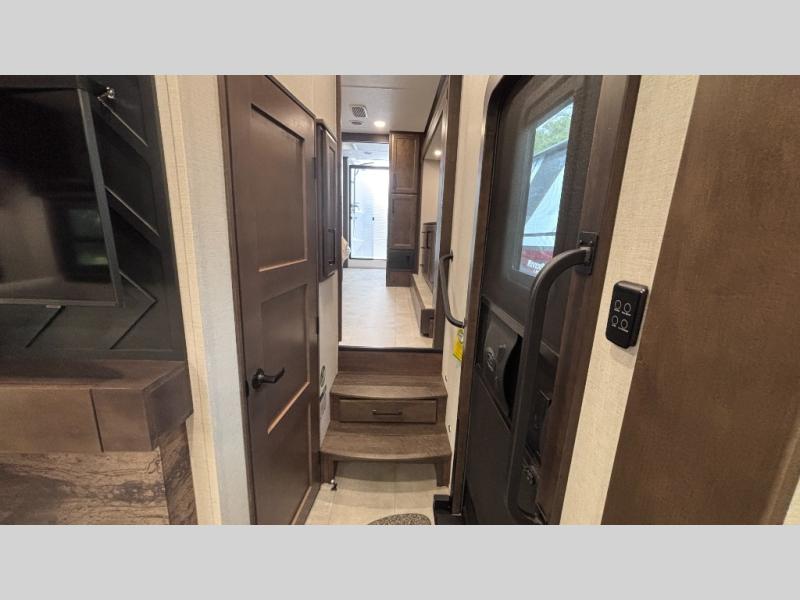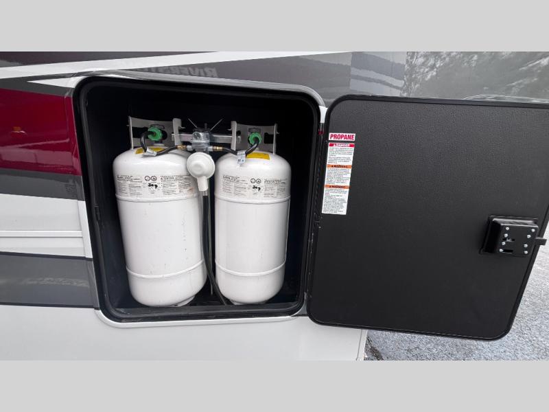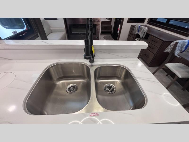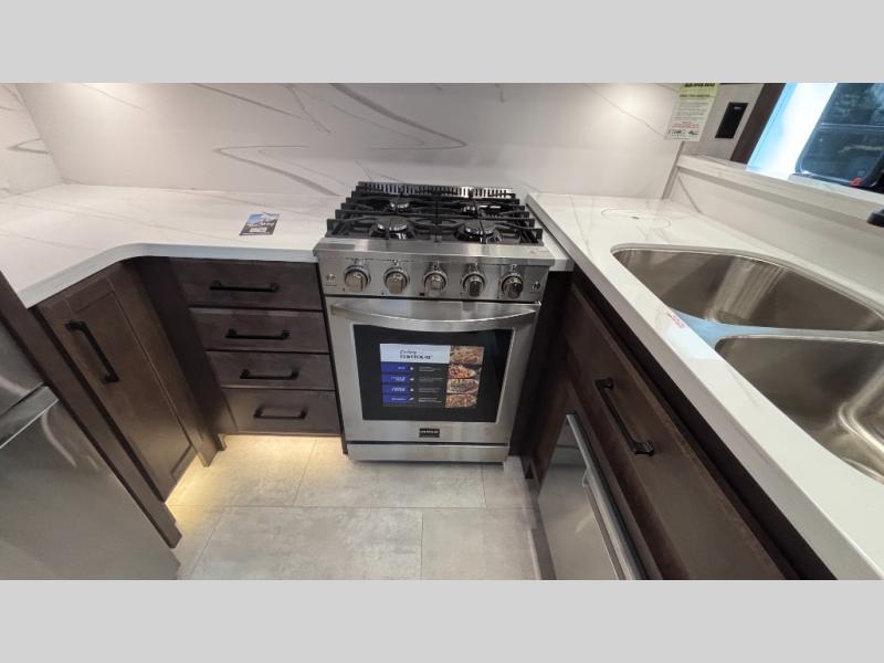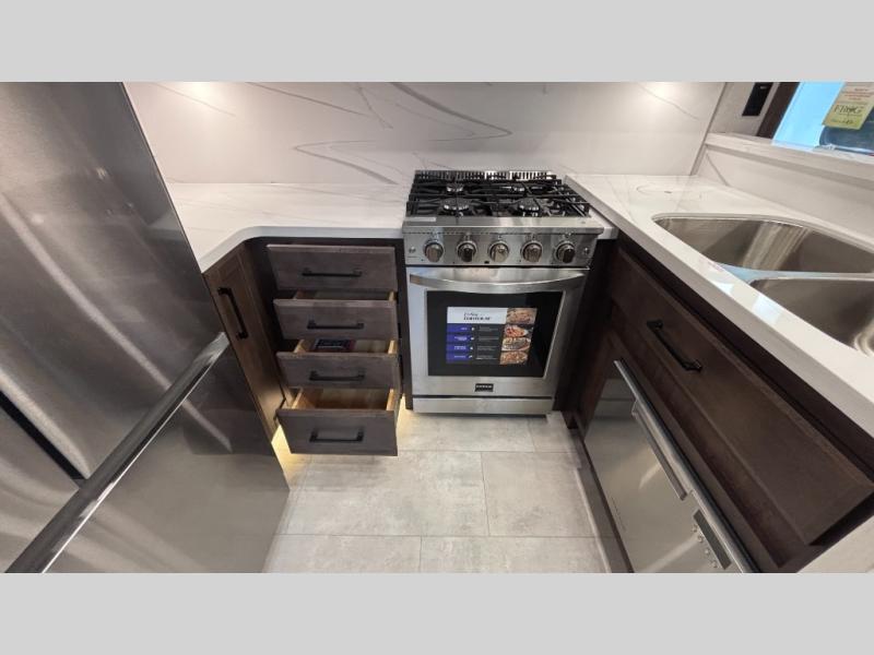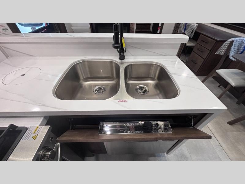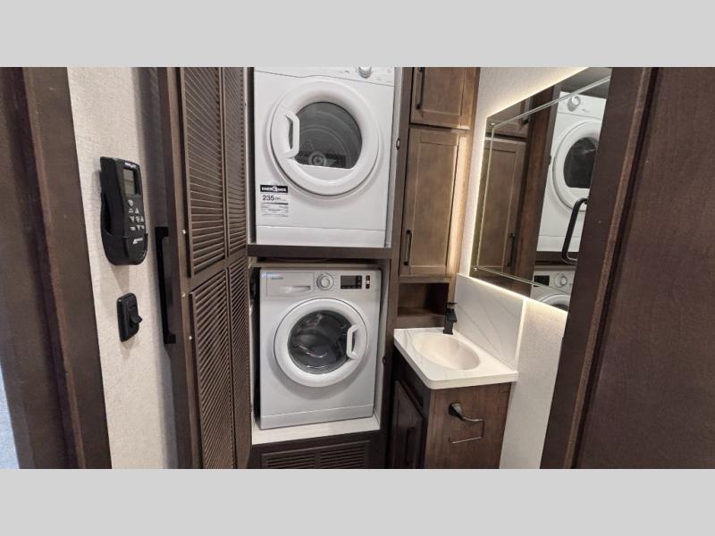 The Forest River RiverStone fifth wheels and toy haulers are luxurious units that have it all! You'll find an automatic six-point hydraulic level-up system to keep your unit in place, and there is preparation for a four-camera observation system. The TravlFi Journey XTR 4G/LTE router and WiFi extender will help you stay connected to the outside world, and you'll never have to overpack again since the Splendid “Astral” stackable washer and dryer will let you clean the small amount of clothes you've brought with you. Another high luxury is the Fischer Paykal dishwasher which will allow you to spend more time enjoying your camp life and less time cleaning up. Each unit is built with an LCI Road Armour suspension system, dual-pane frameless windows, a full docking station, a 200W solar panel, and a BMPro touch control system.