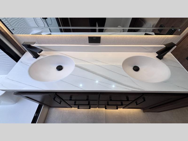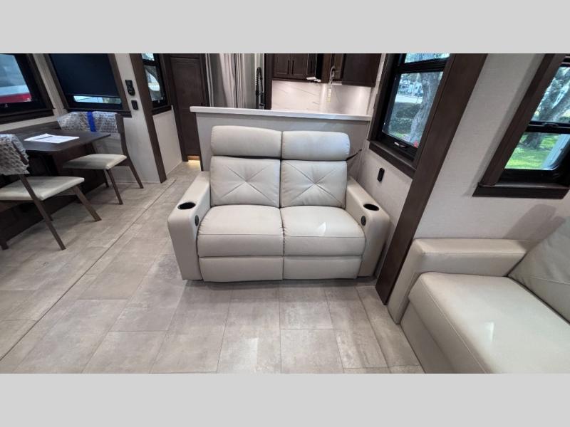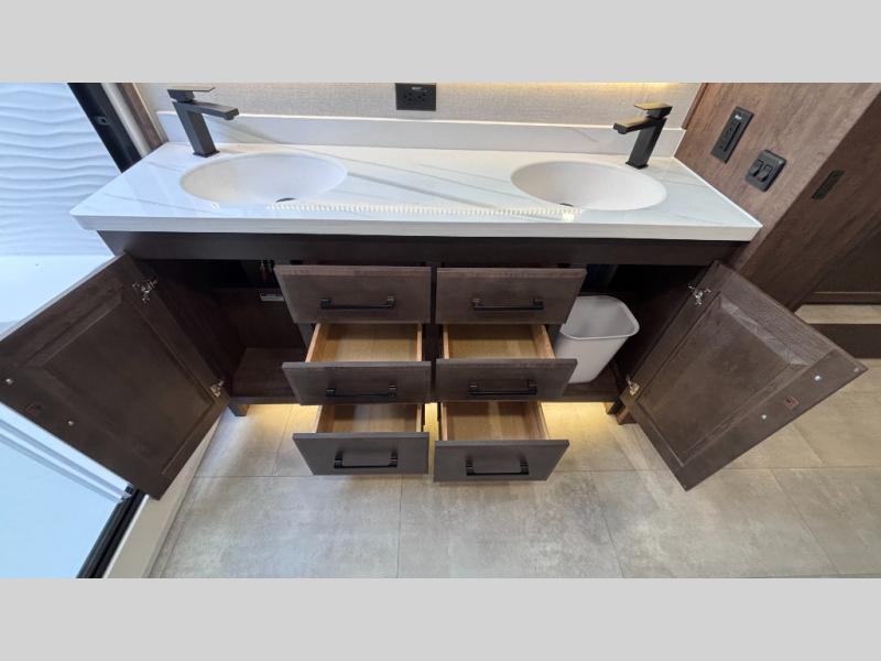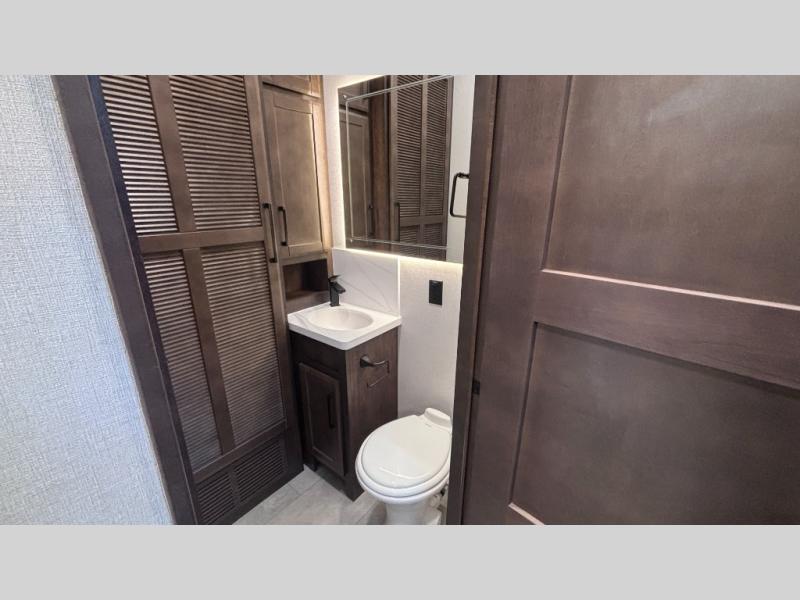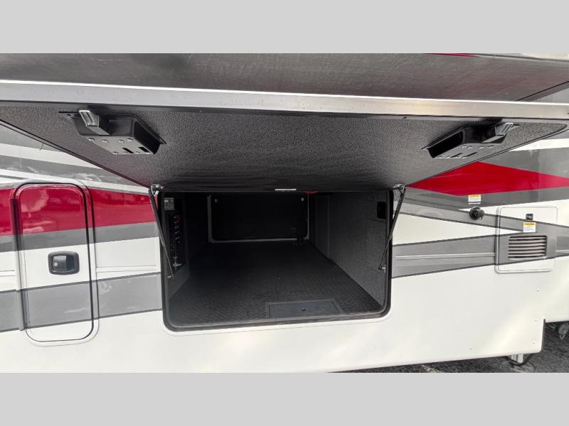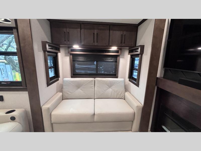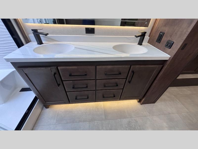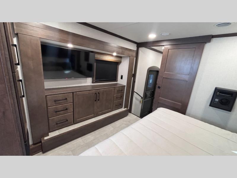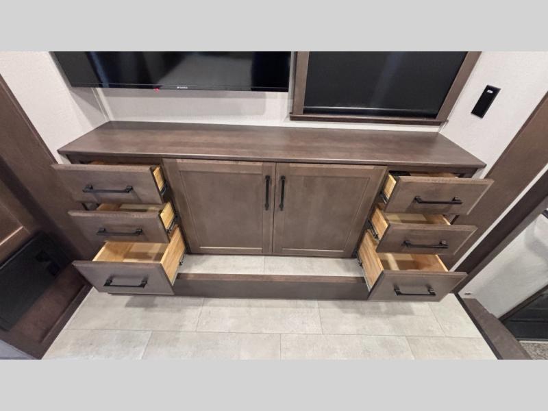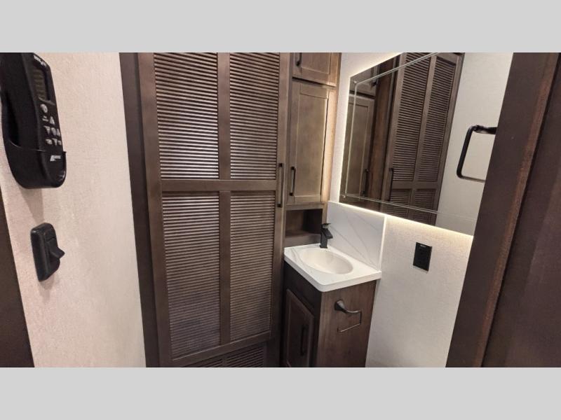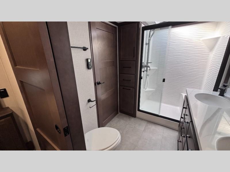 The Forest River RiverStone fifth wheels and toy haulers are luxurious units that have it all! You'll find an automatic six-point hydraulic level-up system to keep your unit in place, and there is preparation for a four-camera observation system. The TravlFi Journey XTR 4G/LTE router and WiFi extender will help you stay connected to the outside world, and you'll never have to overpack again since the Splendid “Astral” stackable washer and dryer will let you clean the small amount of clothes you've brought with you. Another high luxury is the Fischer Paykal dishwasher which will allow you to spend more time enjoying your camp life and less time cleaning up. Each unit is built with an LCI Road Armour suspension system, dual-pane frameless windows, a full docking station, a 200W solar panel, and a BMPro touch control system.
