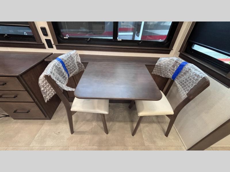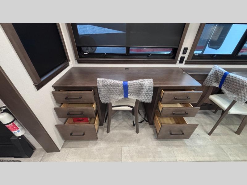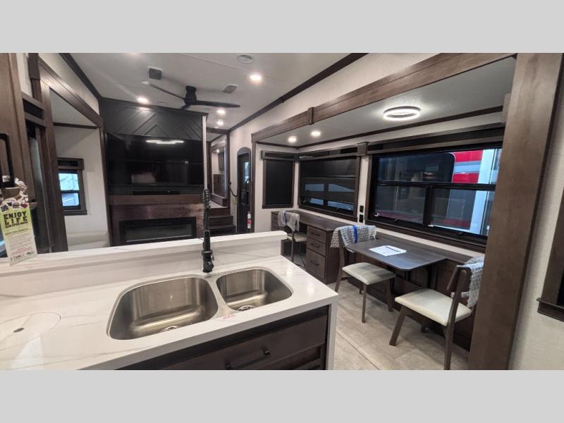 Show your family a good time with this RiverStone fifth wheel! You will get to stay in a super comfortable master suite at the front of this unit which has a dual-sink vanity in the full bathroom. The bedroom offers you a king-size bed that you can rest on while you watch the 40" LED TV across from you, and there is a half bathroom just outside the bedroom for your friends or family to use. If you've decided to bring work with you on the road, you'll be grateful to find a desk in the living area, and the pull-out dinette is a great place to sit down for meals. Work your magic in the kitchen and prepare something delicious on the four-burner range for everyone to eat.