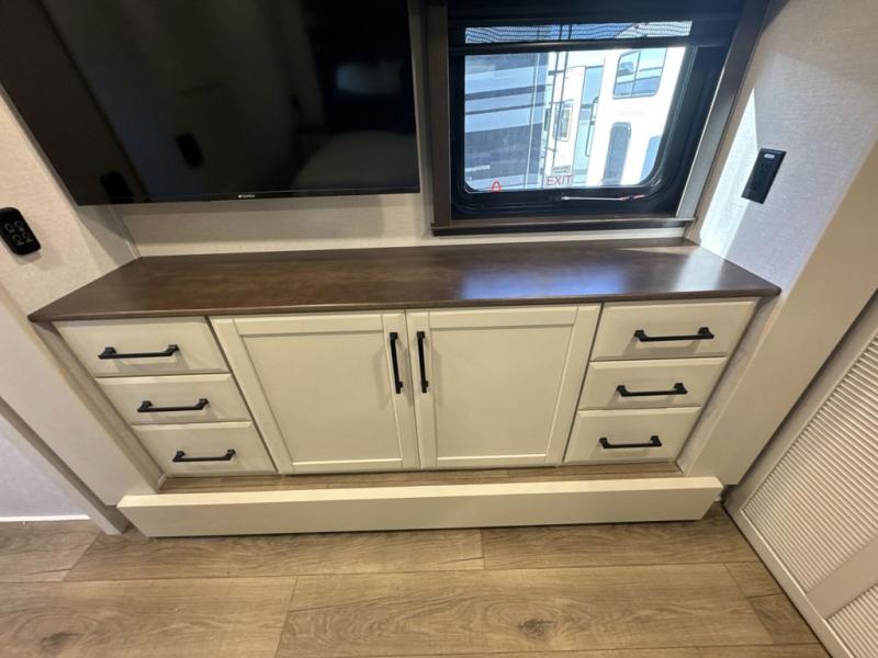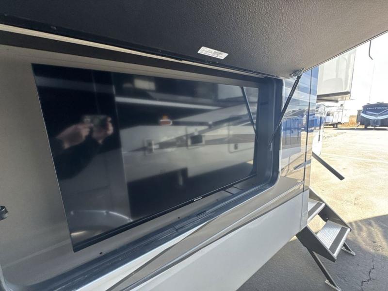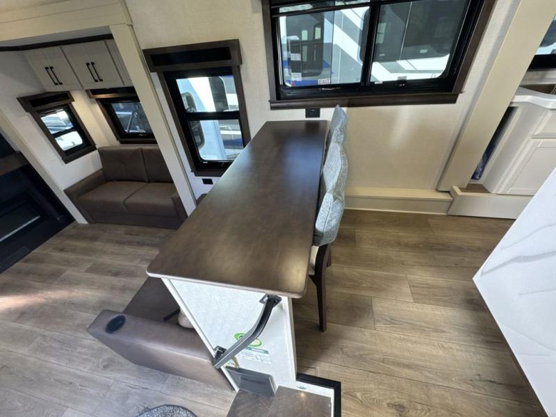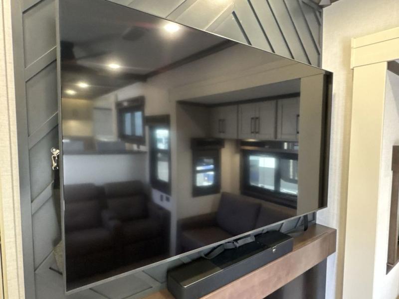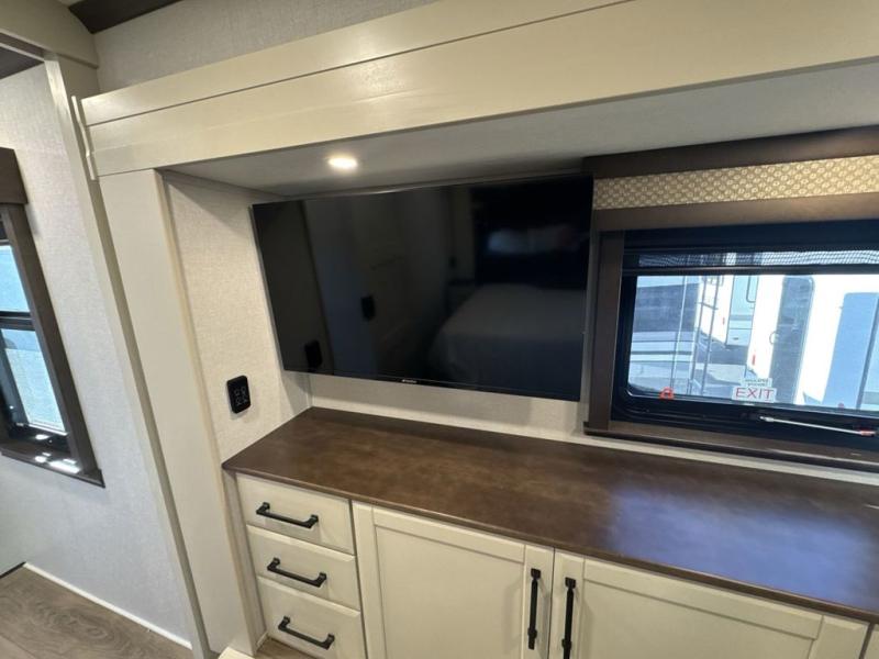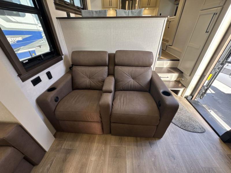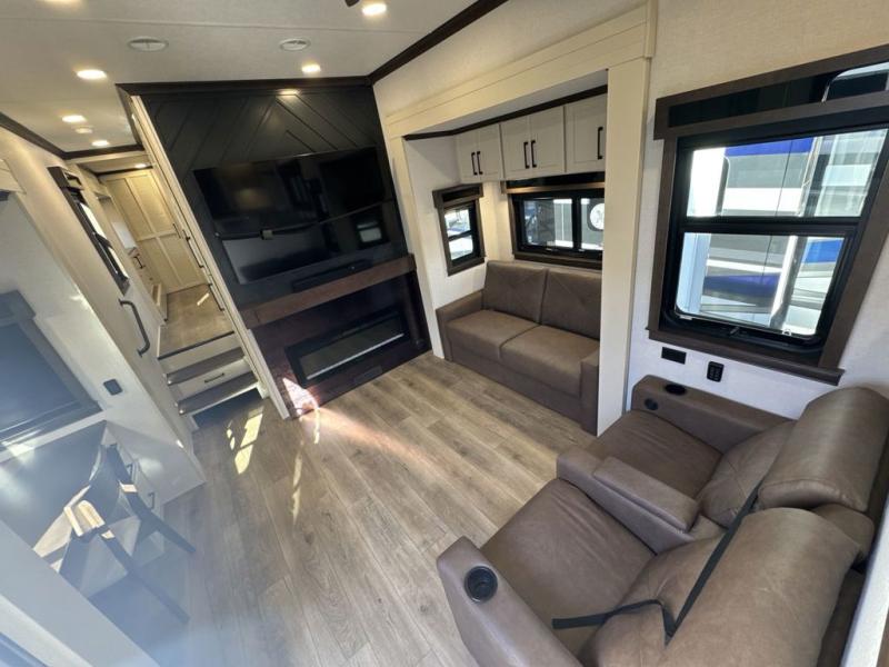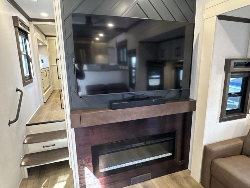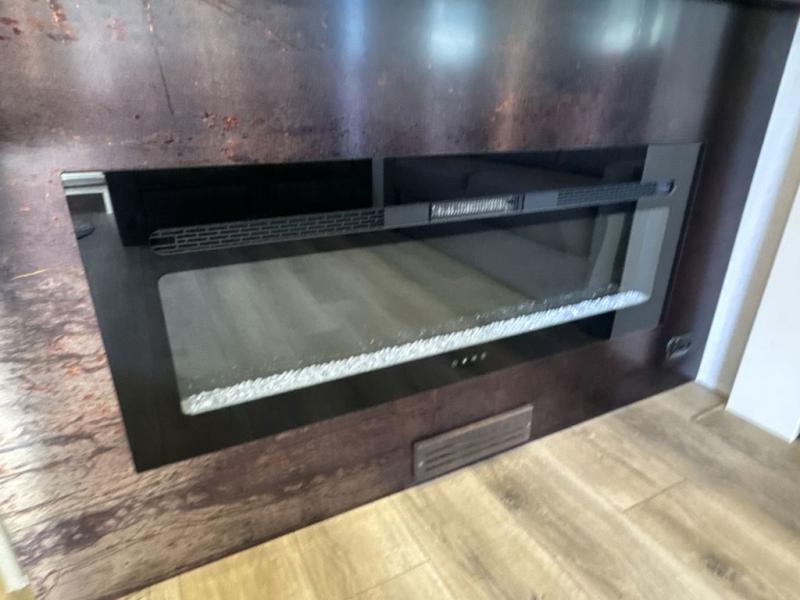 You will feel right at home in this fifth wheel! The rear private bedroom has a 72" x 80" king bed slide for a good night's rest, a rear large wardrobe with the washer and dryer next to it, and even a dresser with a 40" LED TV. And two can get ready at once in the full bathroom with the dual sink vanity. You can then head to either the desk slide to get some work done or whip up some scrambled eggs on the three burner cooktop at the island in the front kitchen. The kitchen even has a dishwasher for easy clean up and two bar stools at the high top dinette that overlooks the middle living area. Relax each night in true comfort on either the E-Z Glide sofa bed slide or the theater seating across from the entertainment center which has a fireplace and 65" Samsung LED Smart TV to watch your favorite movies!