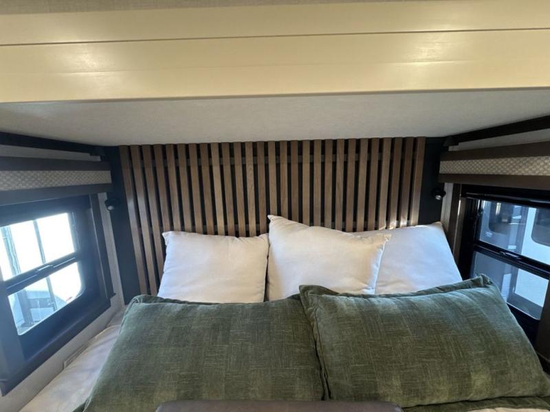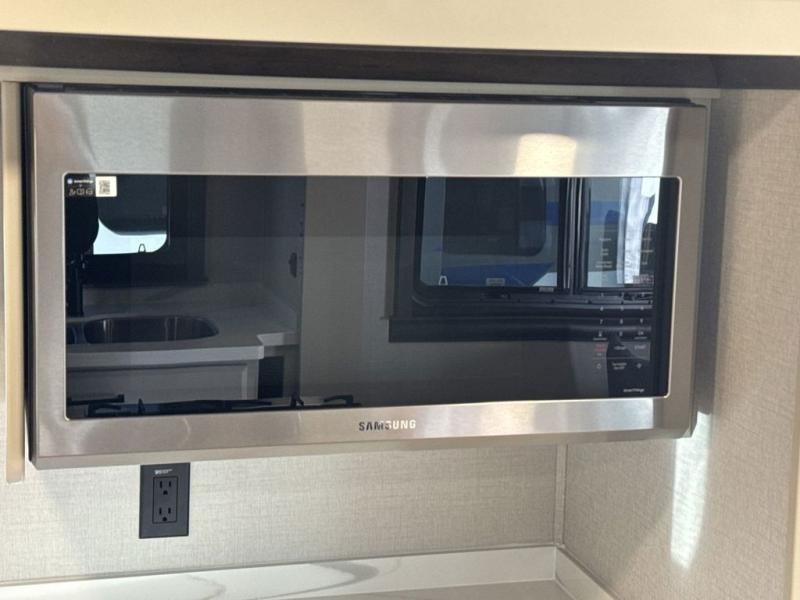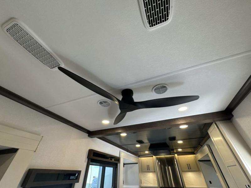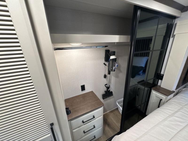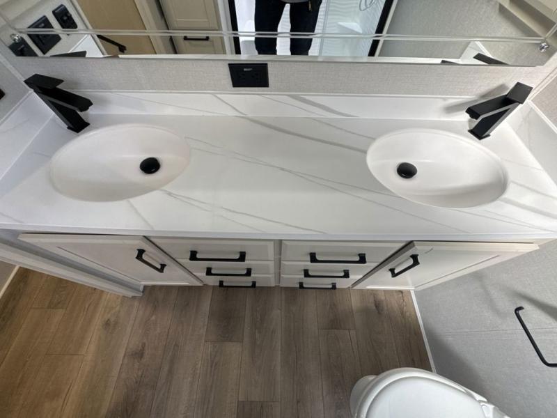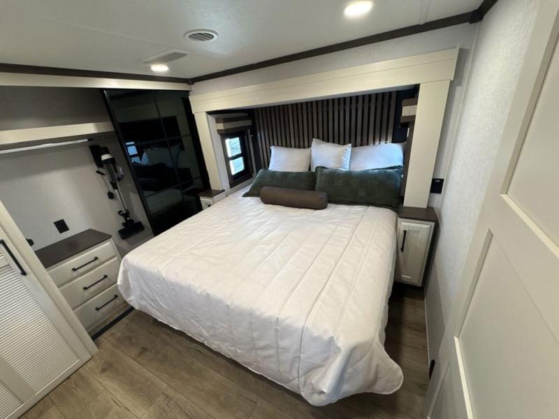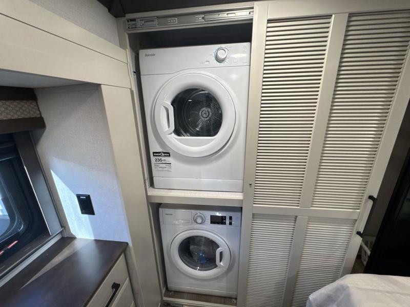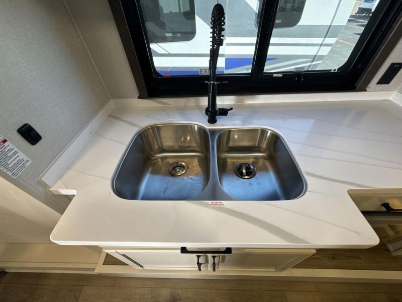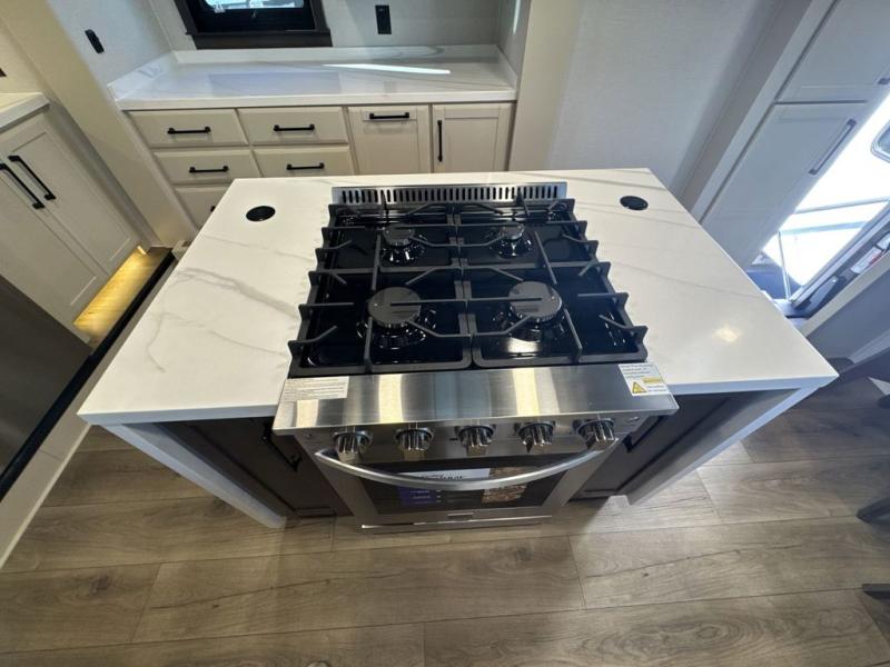 You will feel right at home in this fifth wheel! The rear private bedroom has a 72" x 80" king bed slide for a good night's rest, a rear large wardrobe with the washer and dryer next to it, and even a dresser with a 40" LED TV. And two can get ready at once in the full bathroom with the dual sink vanity. You can then head to either the desk slide to get some work done or whip up some scrambled eggs on the three burner cooktop at the island in the front kitchen. The kitchen even has a dishwasher for easy clean up and two bar stools at the high top dinette that overlooks the middle living area. Relax each night in true comfort on either the E-Z Glide sofa bed slide or the theater seating across from the entertainment center which has a fireplace and 65" Samsung LED Smart TV to watch your favorite movies!