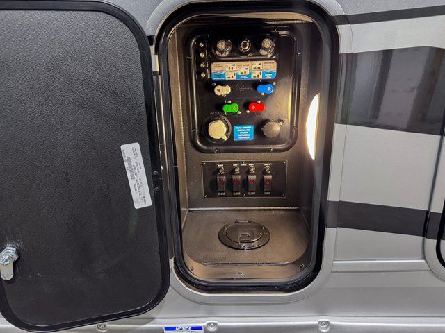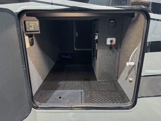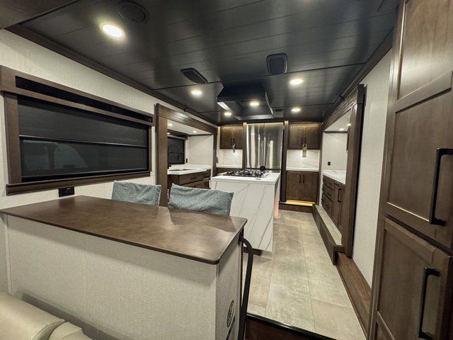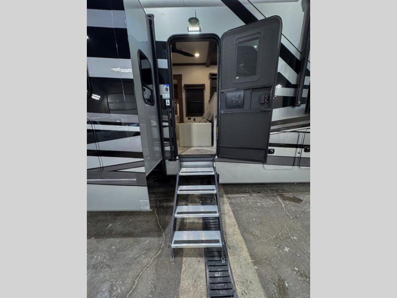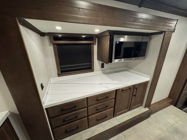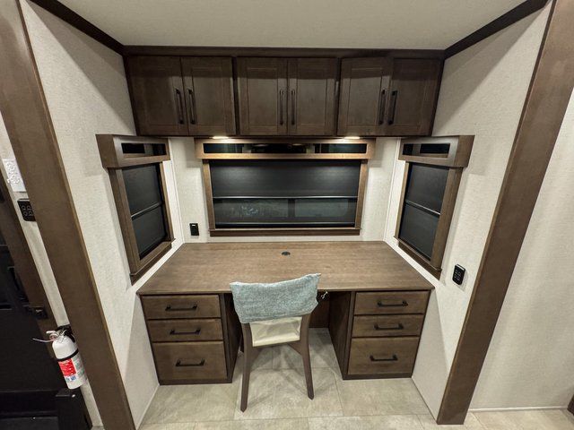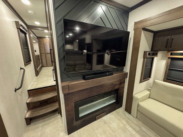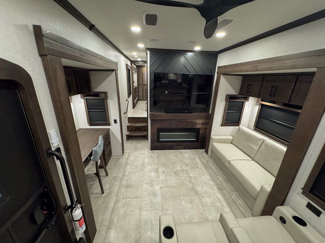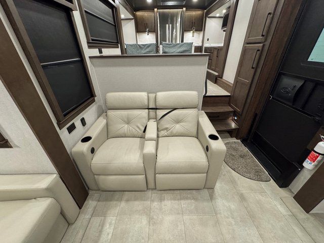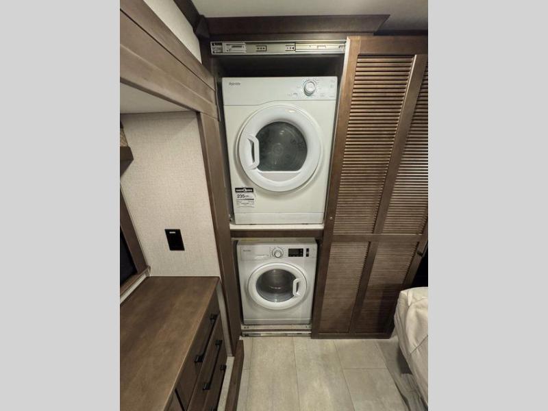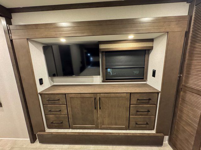 You will feel right at home in this fifth wheel! The rear private bedroom has a 72" x 80" king bed slide for a good night's rest, a rear large wardrobe with the washer and dryer next to it, and even a dresser with a 40" LED TV. And two can get ready at once in the full bathroom with the dual sink vanity. You can then head to either the desk slide to get some work done or whip up some scrambled eggs on the three burner cooktop at the island in the front kitchen. The kitchen even has a dishwasher for easy clean up and two bar stools at the high top dinette that overlooks the middle living area. Relax each night in true comfort on either the E-Z Glide sofa bed slide or the theater seating across from the entertainment center which has a fireplace and 65" Samsung LED Smart TV to watch your favorite movies!