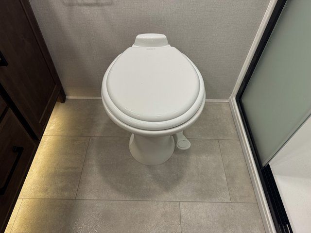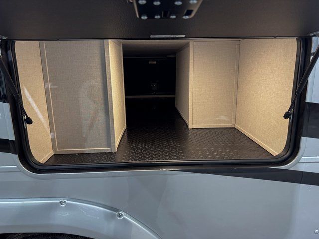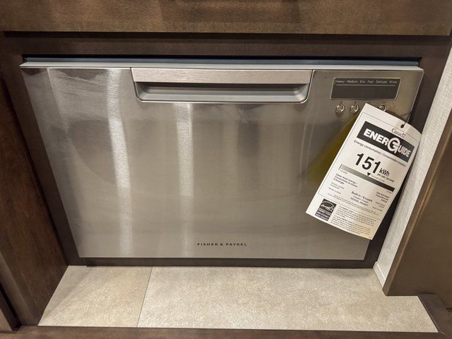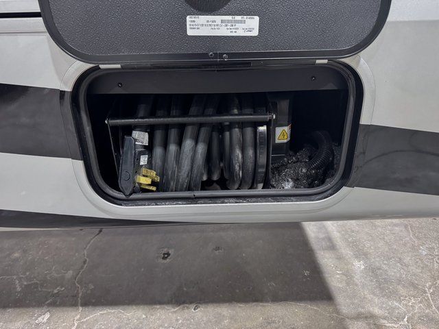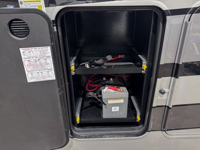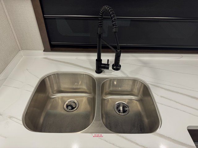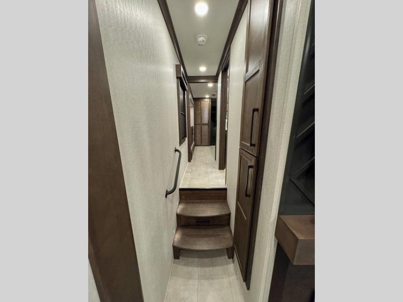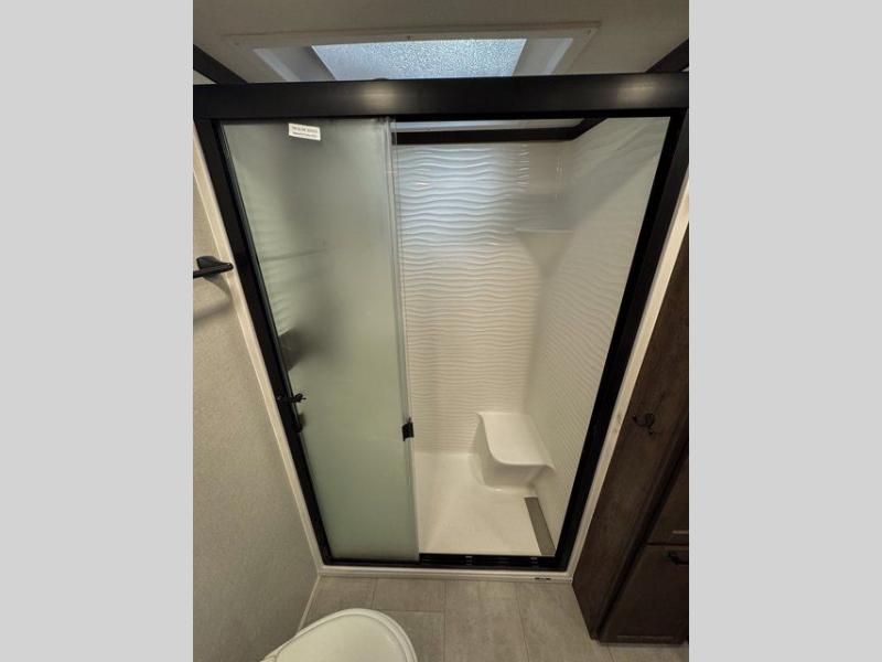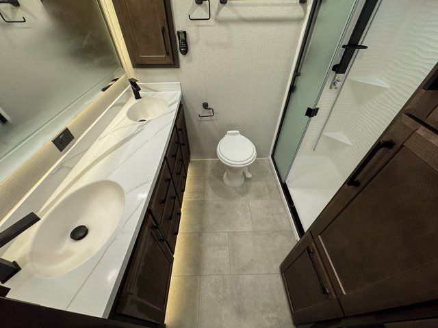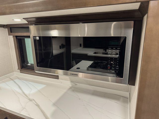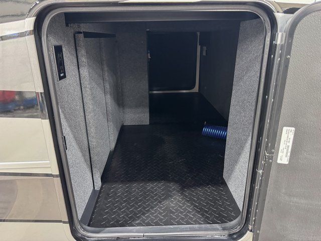 You will feel right at home in this fifth wheel! The rear private bedroom has a 72" x 80" king bed slide for a good night's rest, a rear large wardrobe with the washer and dryer next to it, and even a dresser with a 40" LED TV. And two can get ready at once in the full bathroom with the dual sink vanity. You can then head to either the desk slide to get some work done or whip up some scrambled eggs on the three burner cooktop at the island in the front kitchen. The kitchen even has a dishwasher for easy clean up and two bar stools at the high top dinette that overlooks the middle living area. Relax each night in true comfort on either the E-Z Glide sofa bed slide or the theater seating across from the entertainment center which has a fireplace and 65" Samsung LED Smart TV to watch your favorite movies!