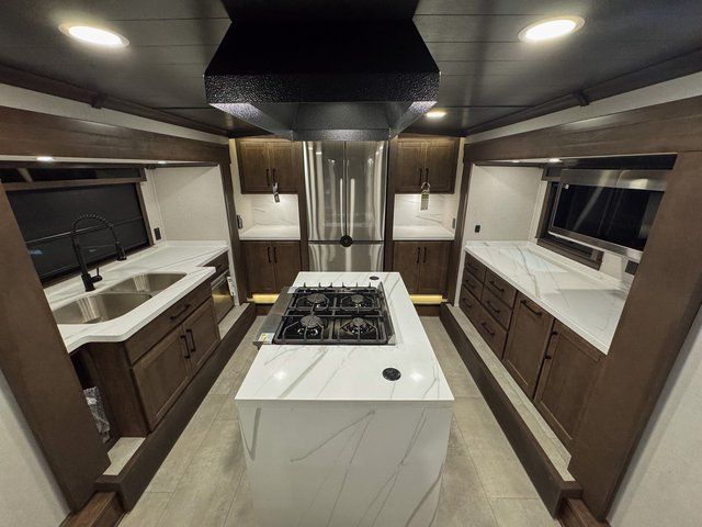 The Forest River RiverStone fifth wheels and toy haulers are luxurious units that have it all! You'll find an automatic six-point hydraulic level-up system to keep your unit in place, and there is preparation for a four-camera observation system. The TravlFi Journey XTR 4G/LTE router and WiFi extender will help you stay connected to the outside world, and you'll never have to overpack again since the Splendid “Astral” stackable washer and dryer will let you clean the small amount of clothes you've brought with you. Another high luxury is the Fischer Paykal dishwasher which will allow you to spend more time enjoying your camp life and less time cleaning up. Each unit is built with a LCI Road Armour suspension system, dual-pane frameless windows, a full docking station, a 200W solar panel, and a BMPro touch control system.