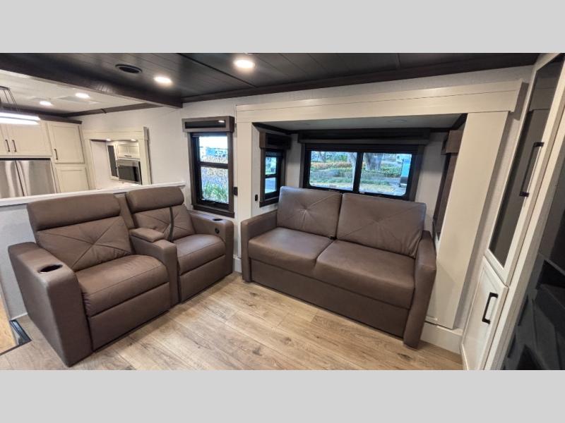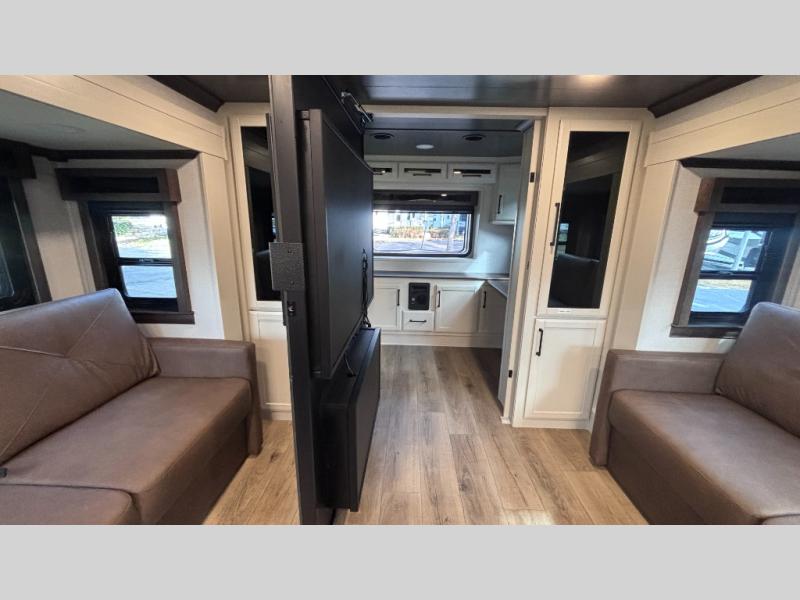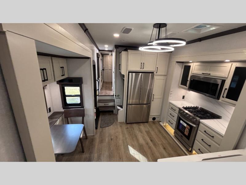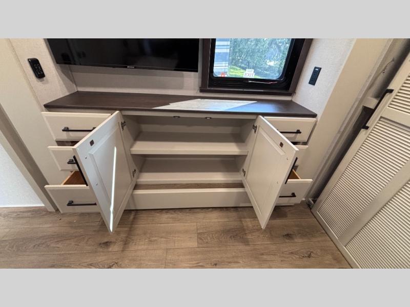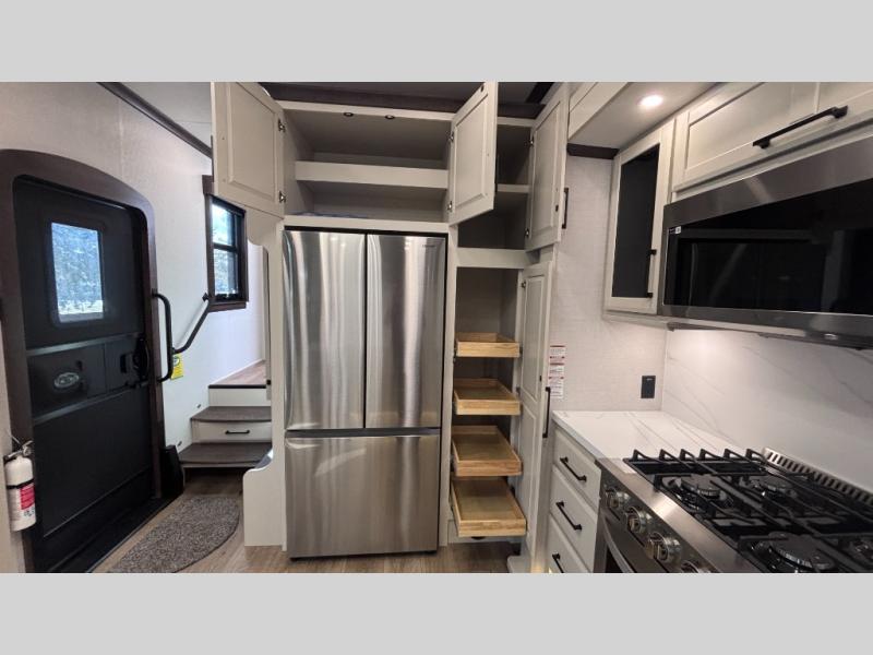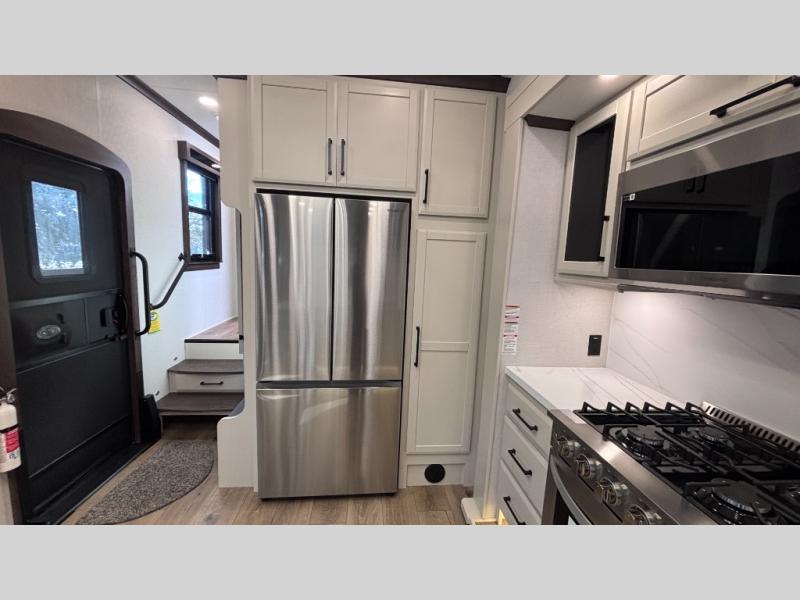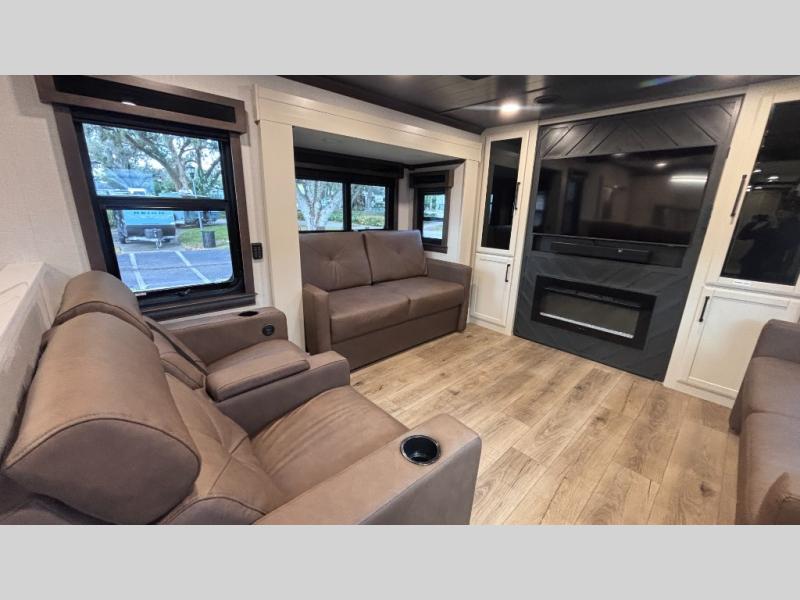 Pack your bags and head to your most comfortable camping trip ever in this packed out fifth wheel! The rear private bedroom has a 72" x 80" king bed slide for a good night's rest, a rear large wardrobe with the washer and dryer next to it, and even a dresser with a 40" LED TV. Get ready in the full bathroom with the shower then head to either the pull-out dinette to read the morning paper or whip up some scrambled eggs on the three burner cooktop in the middle kitchen. The kitchen even has two pantries for all your favorite snacks and a coat rack to hang your jacket. You can relax in the evenings on the two E-Z Glide sofa beds or the theater sofa across from the Samsung LED Smart TV. What's behind the swinging entertainment center is where the real convenience is found with this model; a hidden front office with ample counter space to get your work done!