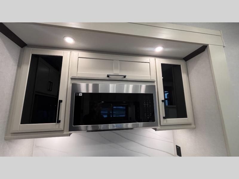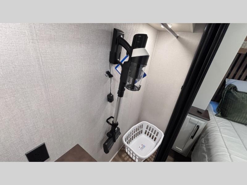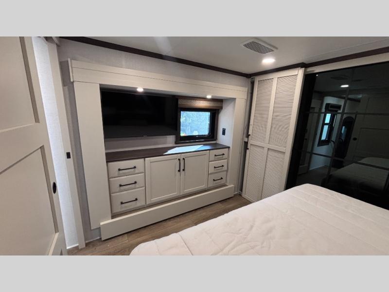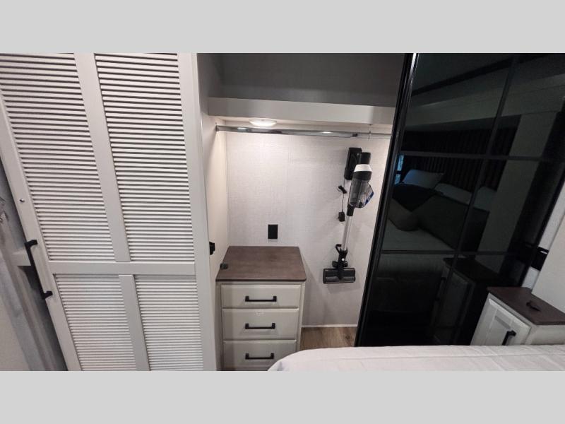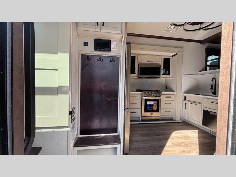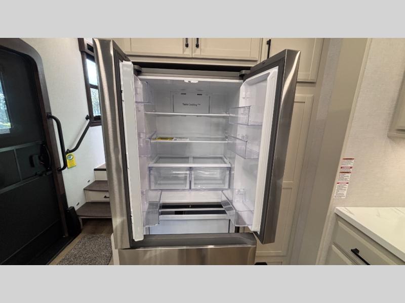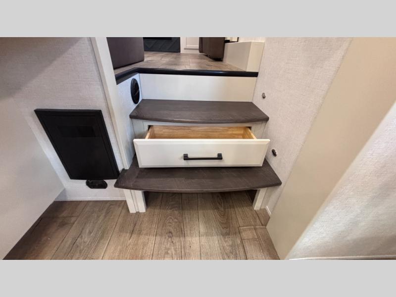 Pack your bags and head to your most comfortable camping trip ever in this packed out fifth wheel! The rear private bedroom has a 72" x 80" king bed slide for a good night's rest, a rear large wardrobe with the washer and dryer next to it, and even a dresser with a 40" LED TV. Get ready in the full bathroom with the shower then head to either the pull-out dinette to read the morning paper or whip up some scrambled eggs on the three burner cooktop in the middle kitchen. The kitchen even has two pantries for all your favorite snacks and a coat rack to hang your jacket. You can relax in the evenings on the two E-Z Glide sofa beds or the theater sofa across from the Samsung LED Smart TV. What's behind the swinging entertainment center is where the real convenience is found with this model; a hidden front office with ample counter space to get your work done!