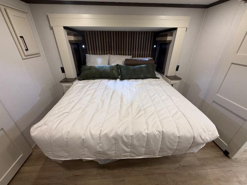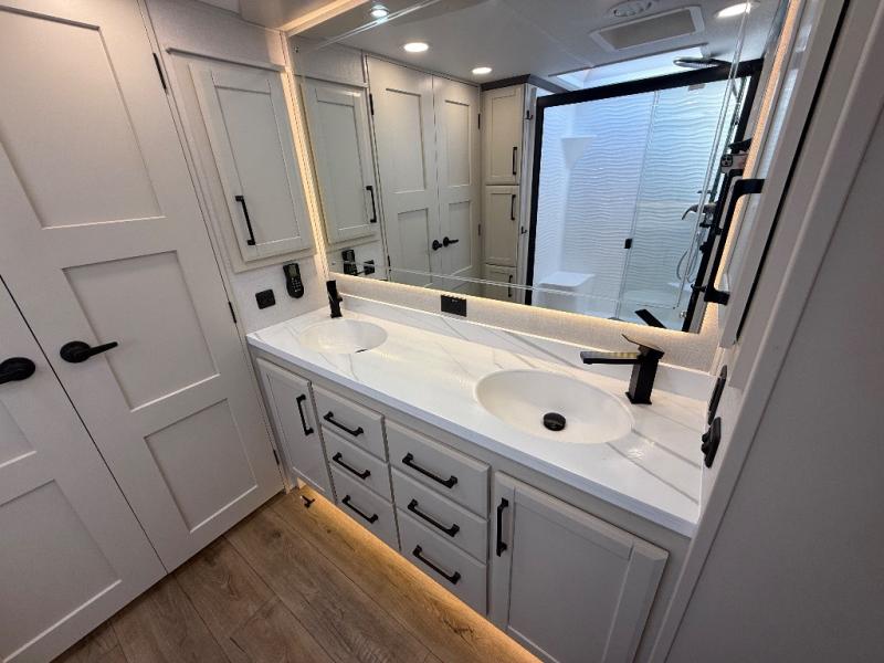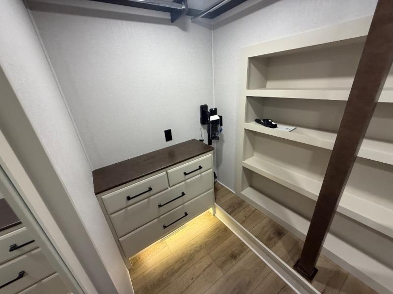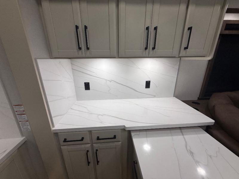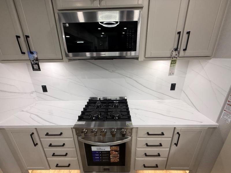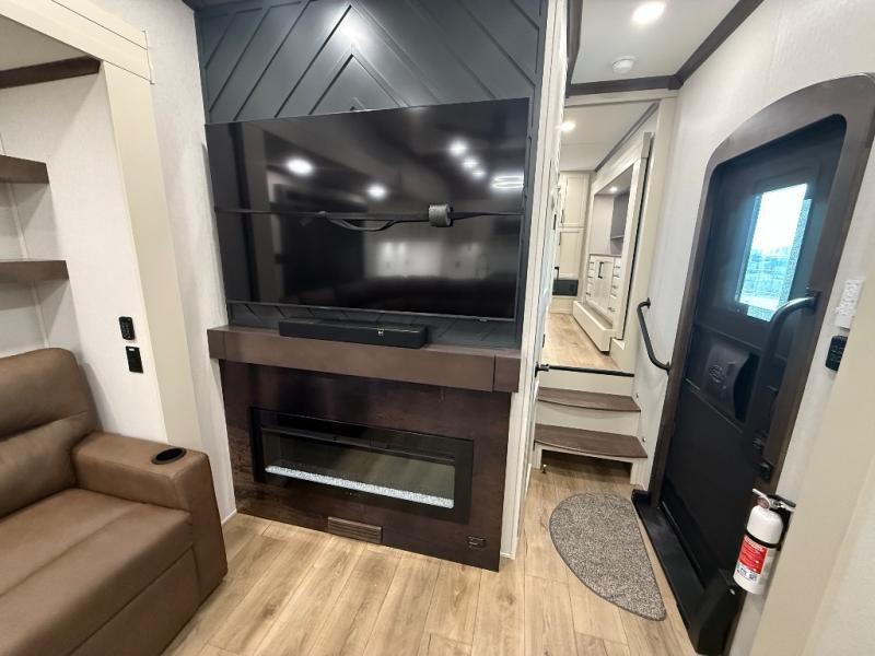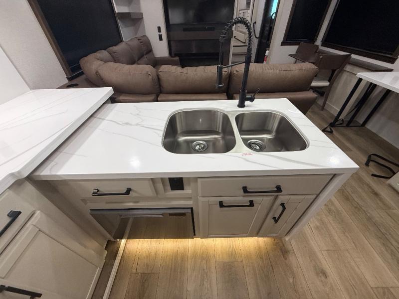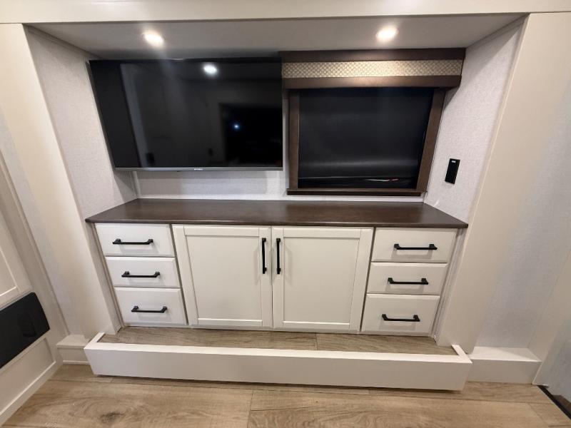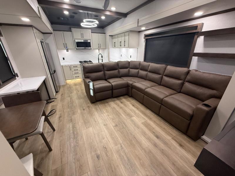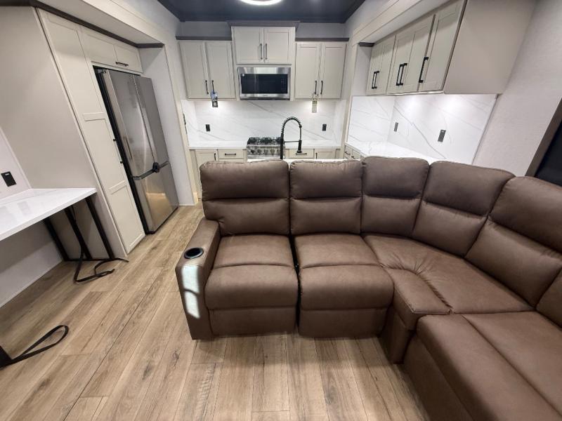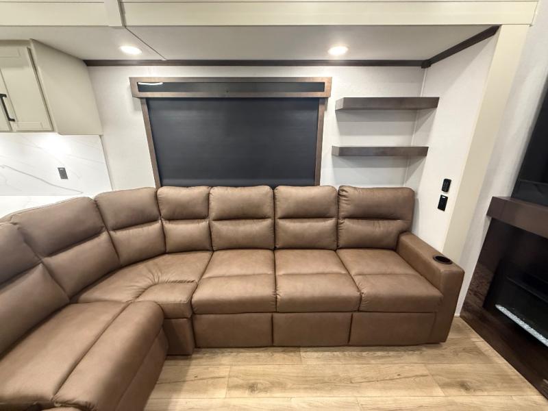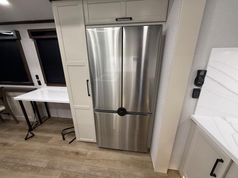 The RiverStone 43BFC isn't just another fifth wheel... it's a residential retreat designed for travelers who want every journey to feel like home. This impressive floor has a designated high-end kitchen space with tons of room, a large pantry, ample counter space and a lovely french door refrigerator will make for unforgettable meals on the go. You can also enjoy a great time with your partner and enjoy all the free time you want at the large sectional sofa you'll never want to leave! After enjoying the living room you will be fascinated by the primary bedroom suite that delivers a quiet, comfortable and spacious sanctuary featuring a dresser and dedicated shoe storage to organize all your personal belongings.