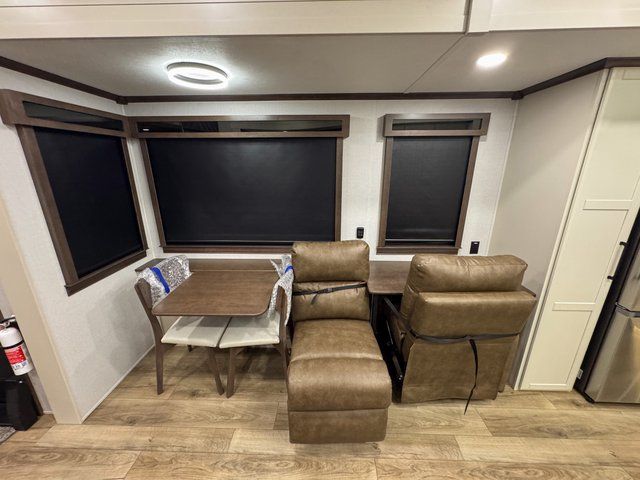 The pull-out dinette offers flexible dining space, while a dedicated desk area makes working remotely or managing travel plans comfortable and convenient.