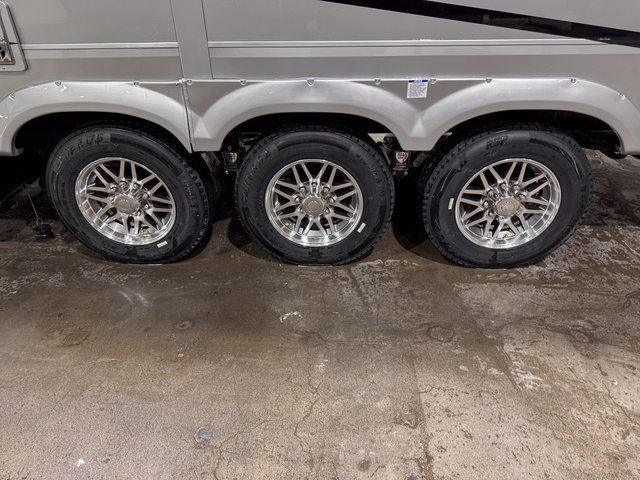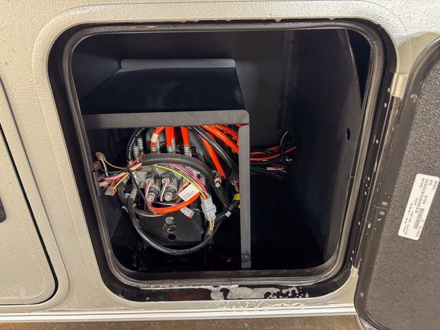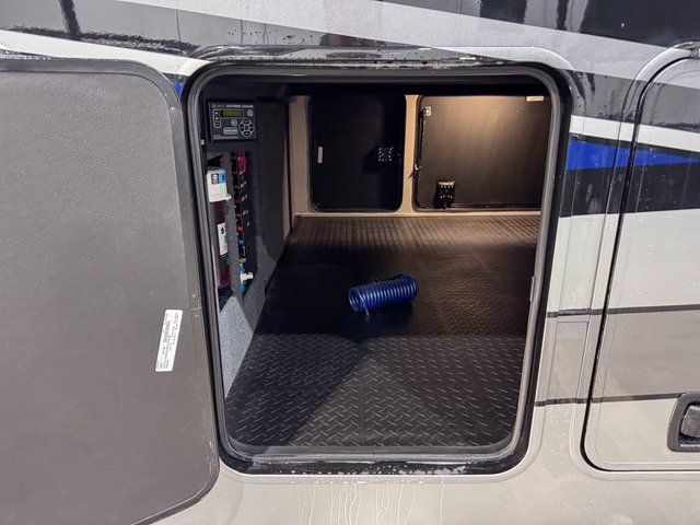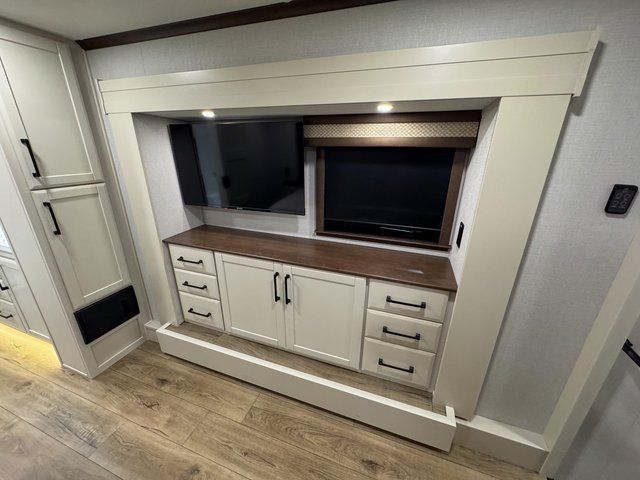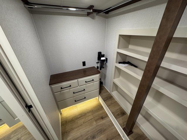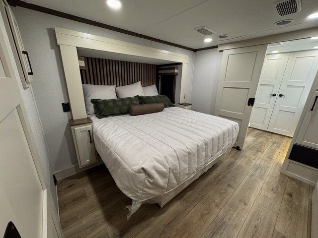 At the front of the coach, the master bedroom suite provides a quiet sanctuary. Thoughtfully designed storage includes a dresser and dedicated shoe storage, helping you stay organized for extended travel. The spacious layout makes this bedroom feel like a true residential retreat rather than just another RV sleeping space.