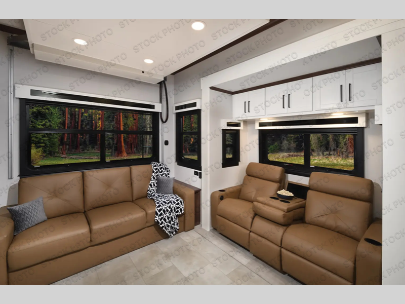 This RiverStone fifth wheel has an amazing den in the back! This area is not only an excellent lounging space with its theater sofa, hide-a-bed sofa, and entertainment center, but it is also a comfortable guest suite because it contains its own half bathroom and a drop-down queen bed. Each section of this unit has opposing slides, so you'll have plenty of living space, and the kitchen area has a pull-out dinette so that you can sit down with hot meals each night. You have a large pantry for snacks and an 18-cubic foot French door refrigerator with ice maker for cold beverages. The ceiling fan allows you to cool off the interior without overworking the AC, and the cordless vacuum will help you clean up messes.