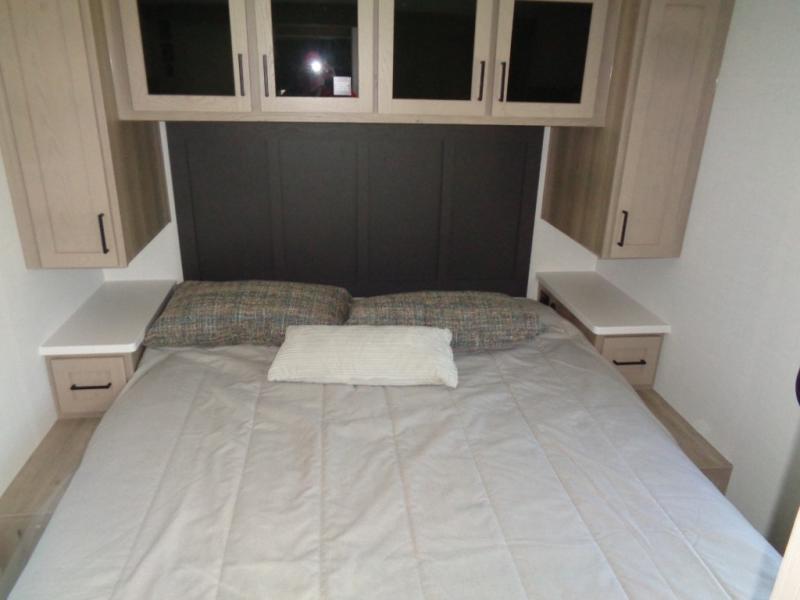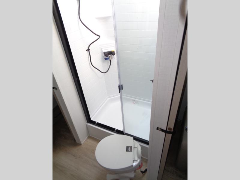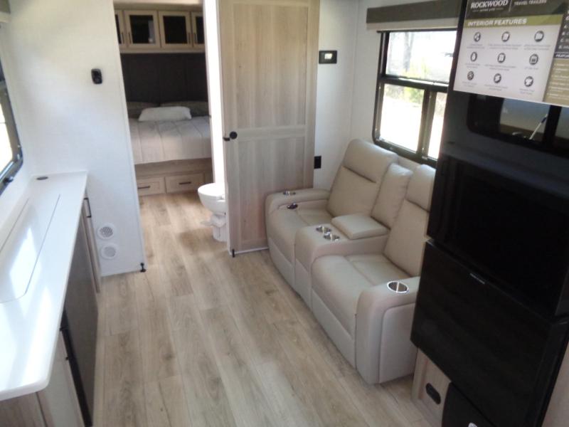 This Rockwood Ultra Lite is fit for a cook! As soon as you step inside, you're greeted by the spacious front kitchen. Designed for convenience and style, it has long solid surface countertops that provide ample space for meal prep and organizing utensils. The overhead cabinets offer plenty of room to store dishes and ingredients for all your favorite recipes. After cooking, you can unwind on the 67" theater seat facing a TV with a lift, perfect for movie nights or catching up on your favorite shows. For meals, enjoy dining at the flip-up table with folding chairs, ideal for sharing breakfast, lunch, or dinner with your partner. And when it's time to relax, a full bathroom leads to the rear bedroom, where a king-sized bed awaits to give you a restful night's sleep.