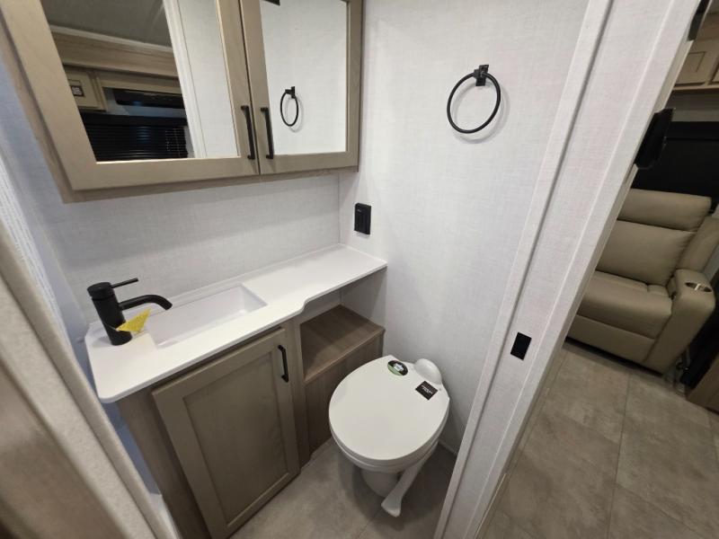 *Rear Theater Seats*Center Kitchen*Bathroom w/ Tub/Shower Combo*Front Queen Bedroom*Slide Toppers*Power Stabilizer Jacks and much more.