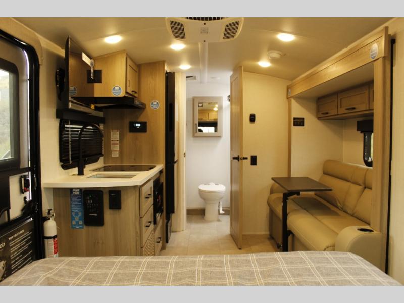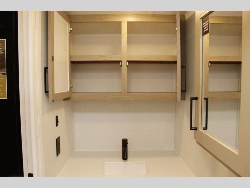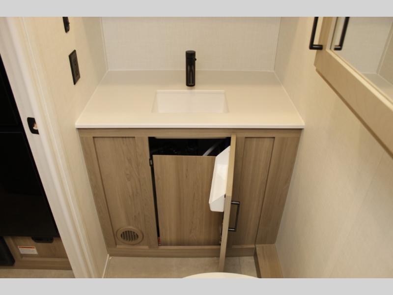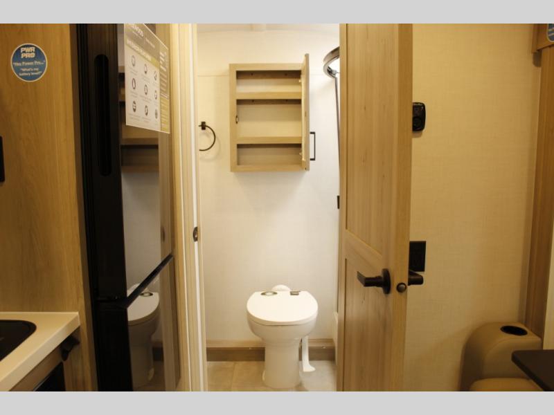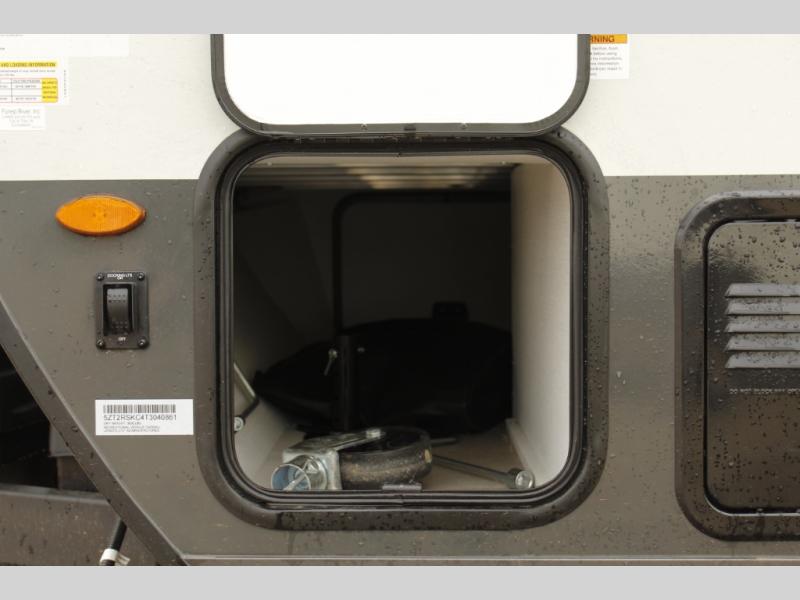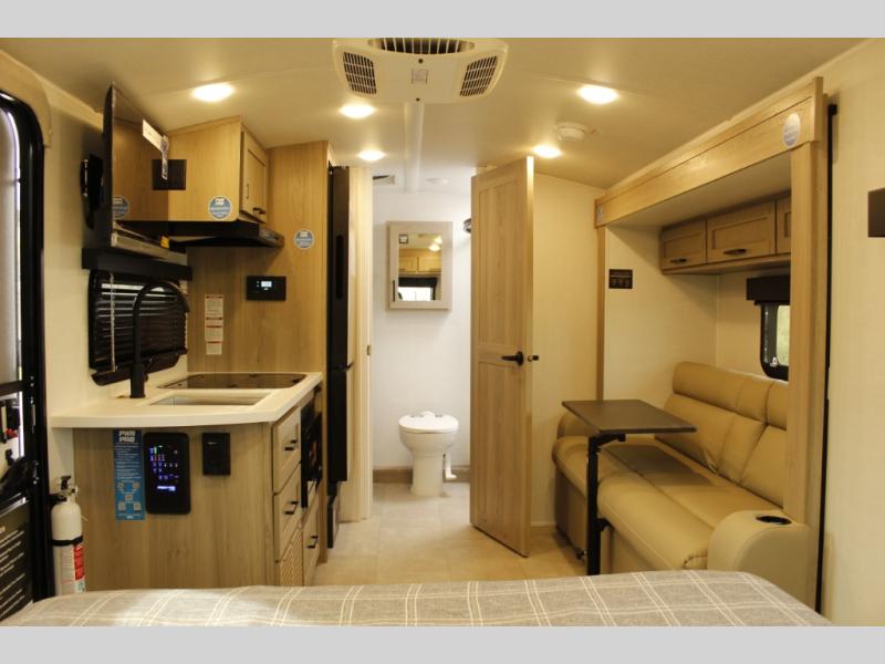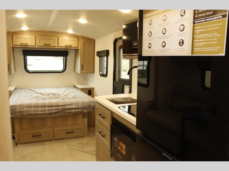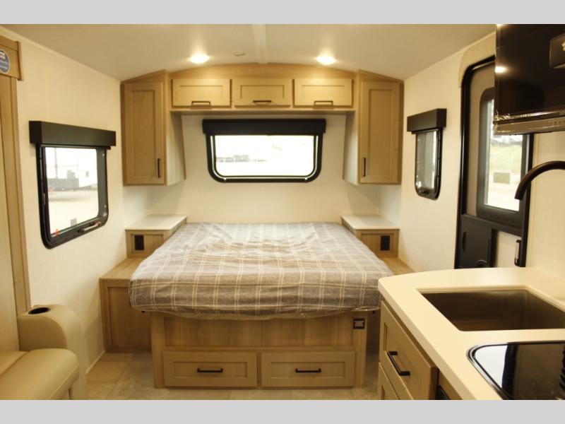 This travel trailer will feel more like home with its front bedroom and walk-around full-size bed. You'll enjoy the 12V TV as you relax on the 72" sofa with a table and cupholders. The full rear bath includes a spacious shower to clean up in each day and there is a linen closet for clean towels. When you're ready to prepare dinner you'll have a three burner cooktop and microwave oven indoors! And don't forget the exterior storage allows you to bring along beach toys and tackle boxes. The optional Power Package available on this model includes three 200W solar panels, a side solar plug-in, a 3kW 160A inverter, and more off-grid features!