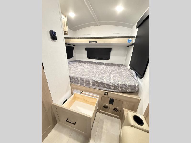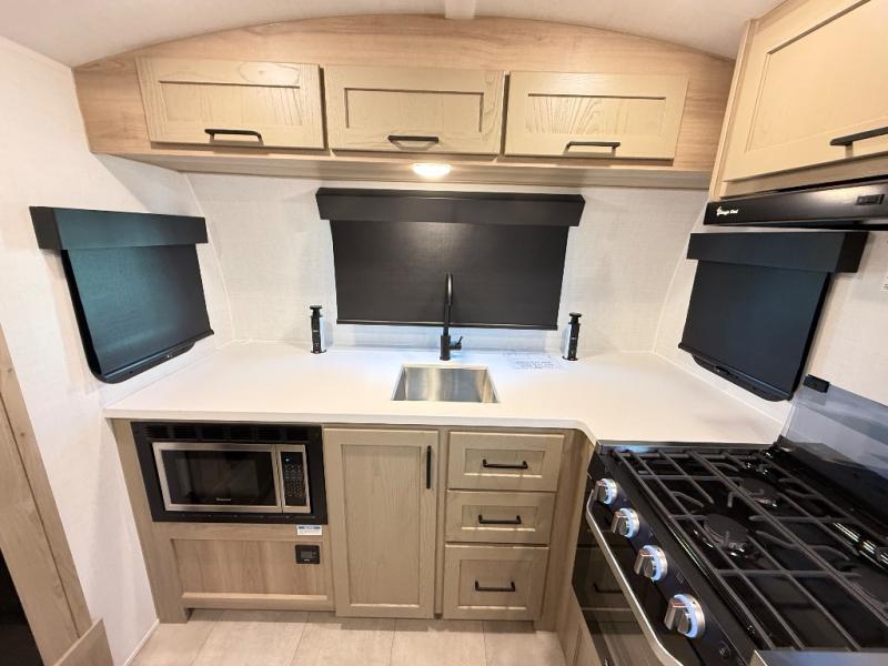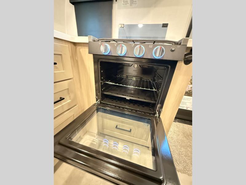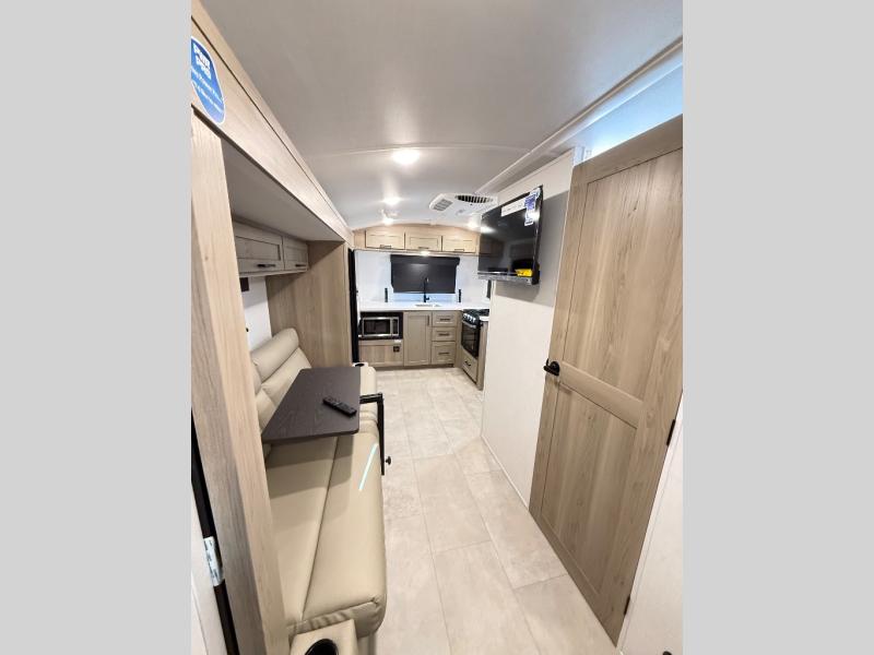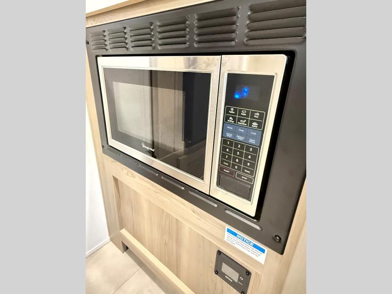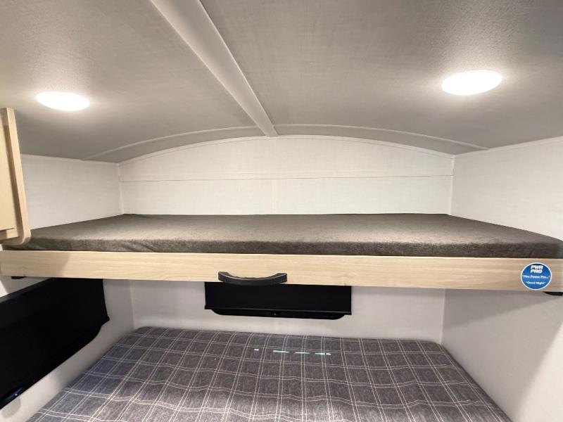 Are you looking for a lightweight trailer with at-home comforts? Take a look at this single slide out unit that can sleep three to four each night. There is a queen-size bed in the back with a 26" x 80" flip-up bunk for cozy sleeping space, a 72" sofa with cupholders to relax on, plus a 12V TV for movie nights! The front kitchen includes a 12V refrigerator to store food, plus a microwave oven and a gas oven to cook meals each day.