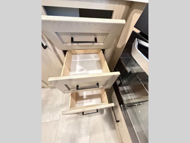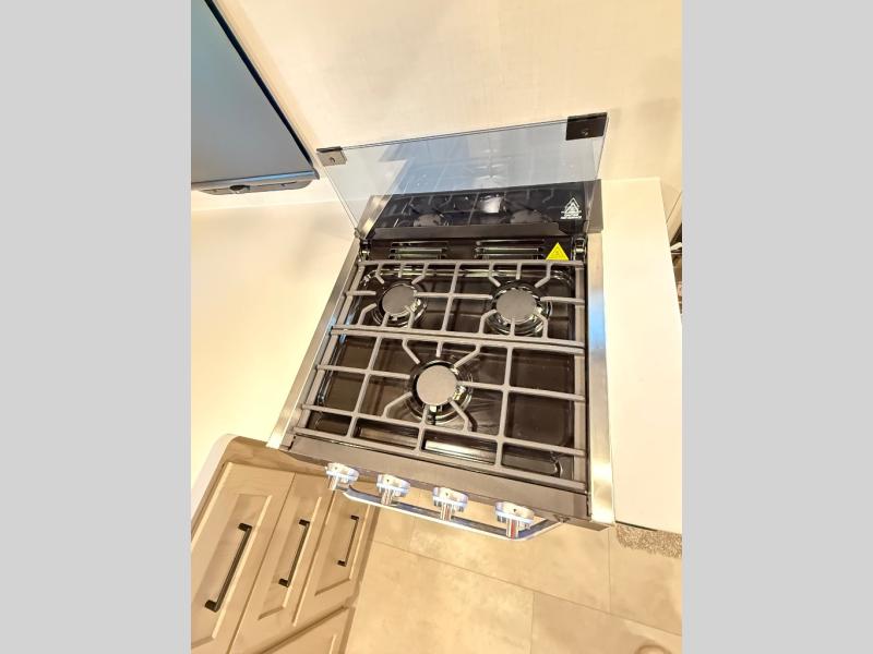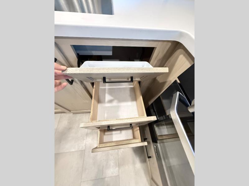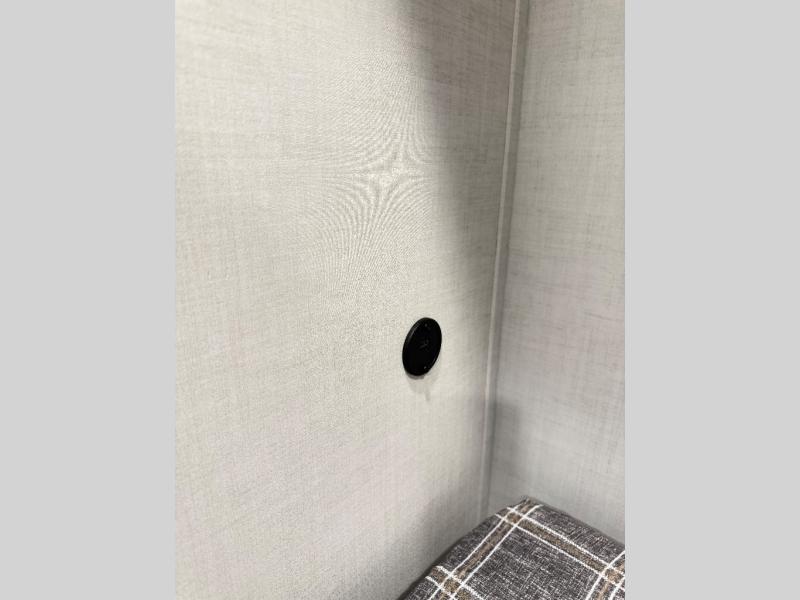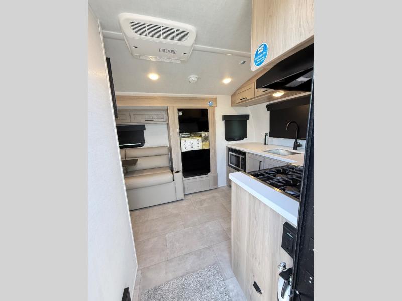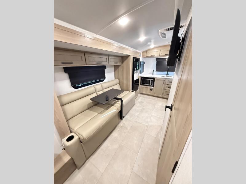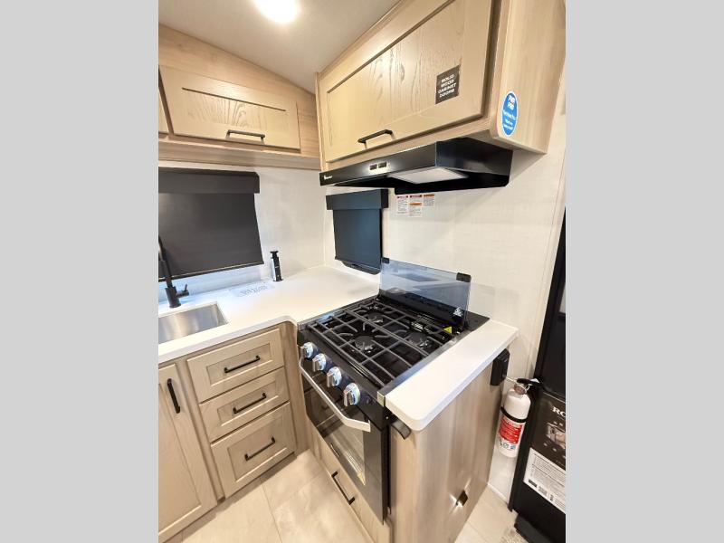 Are you looking for a lightweight trailer with at-home comforts? Take a look at this single slide out unit that can sleep three to four each night. There is a queen-size bed in the back with a 26" x 80" flip-up bunk for cozy sleeping space, a 72" sofa with cupholders to relax on, plus a 12V TV for movie nights! The front kitchen includes a 12V refrigerator to store food, plus a microwave oven and a gas oven to cook meals each day.